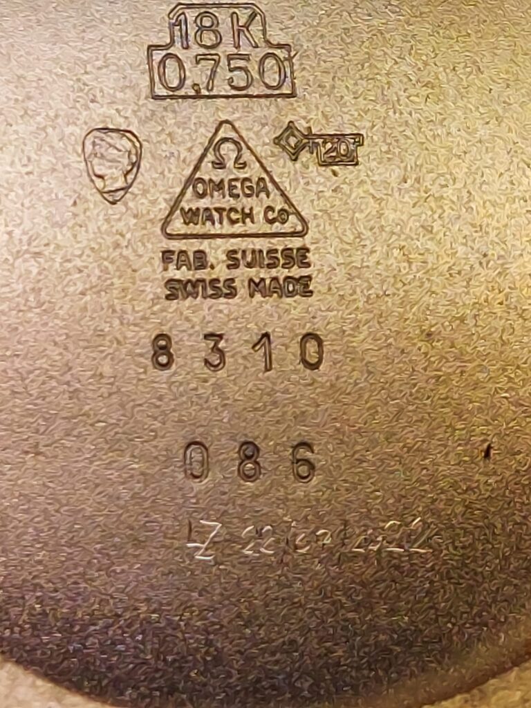 Apart from the Geneva Key hallmark, some other markings are visible. Although not important for the scope of this article, we will quickly go over them. The 18k 0,750 designation shows us that we are dealing with 18 carat gold here, or 75 percent pure gold. The little woman’s head is called the Helvetia hallmarks proves the case is tested 18k gold.
