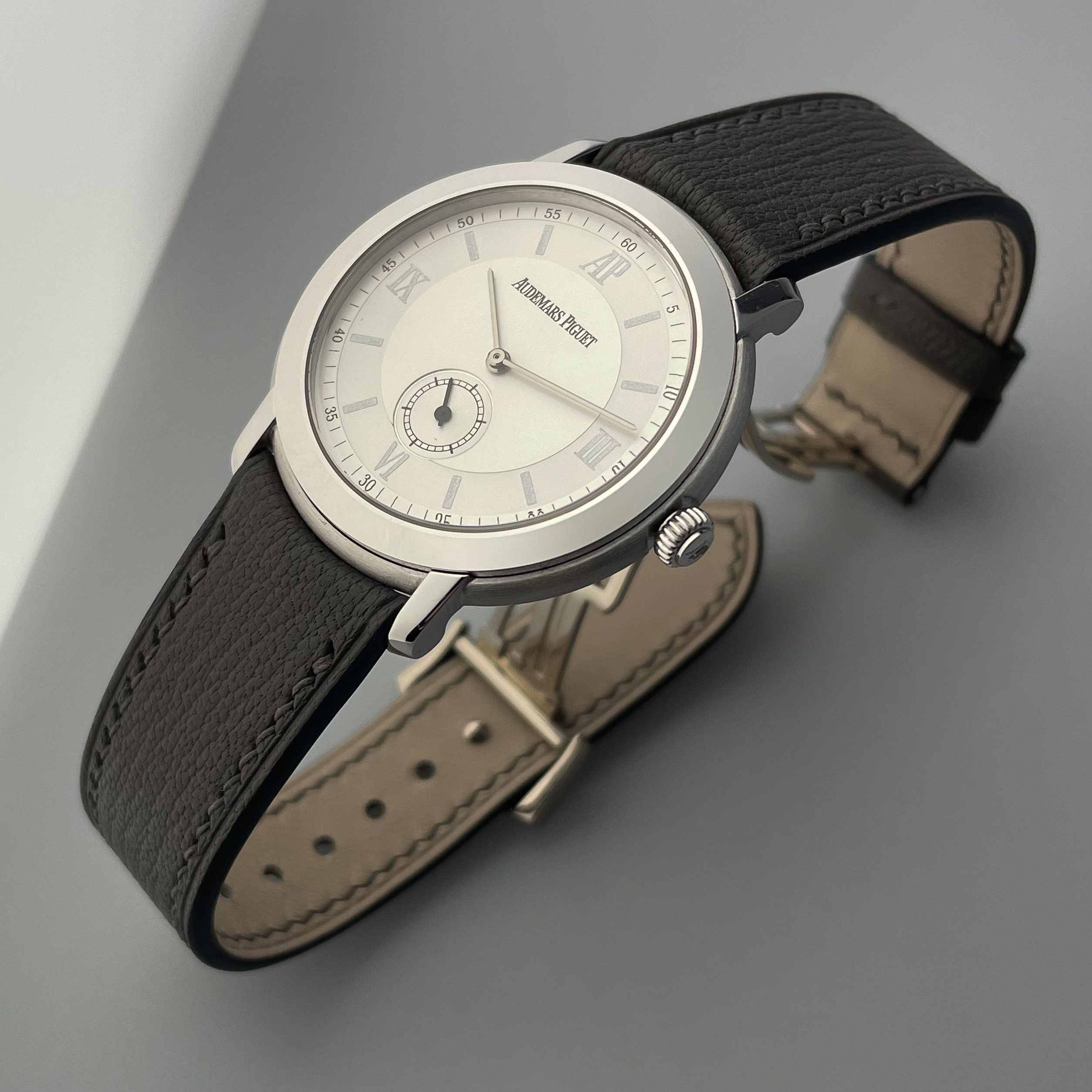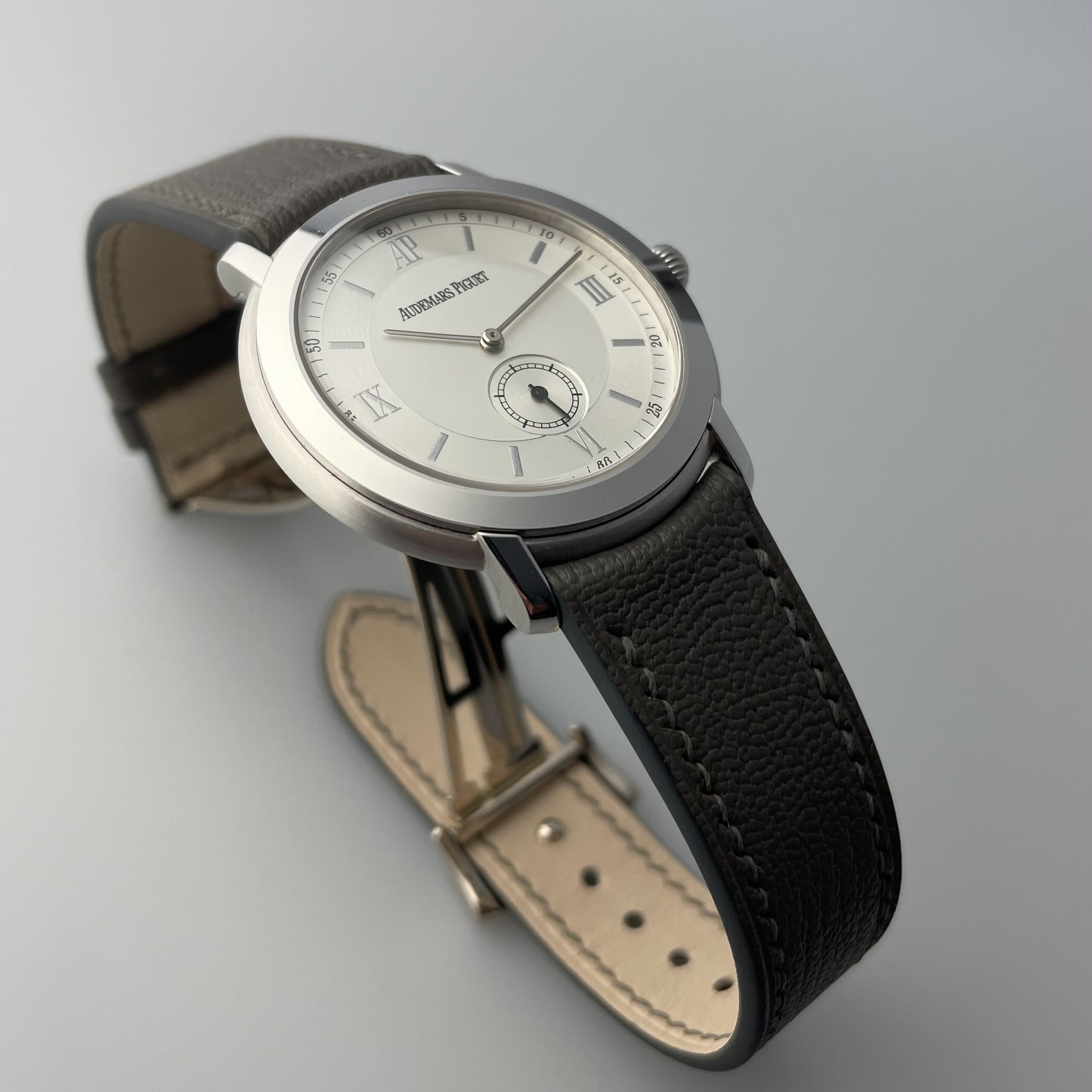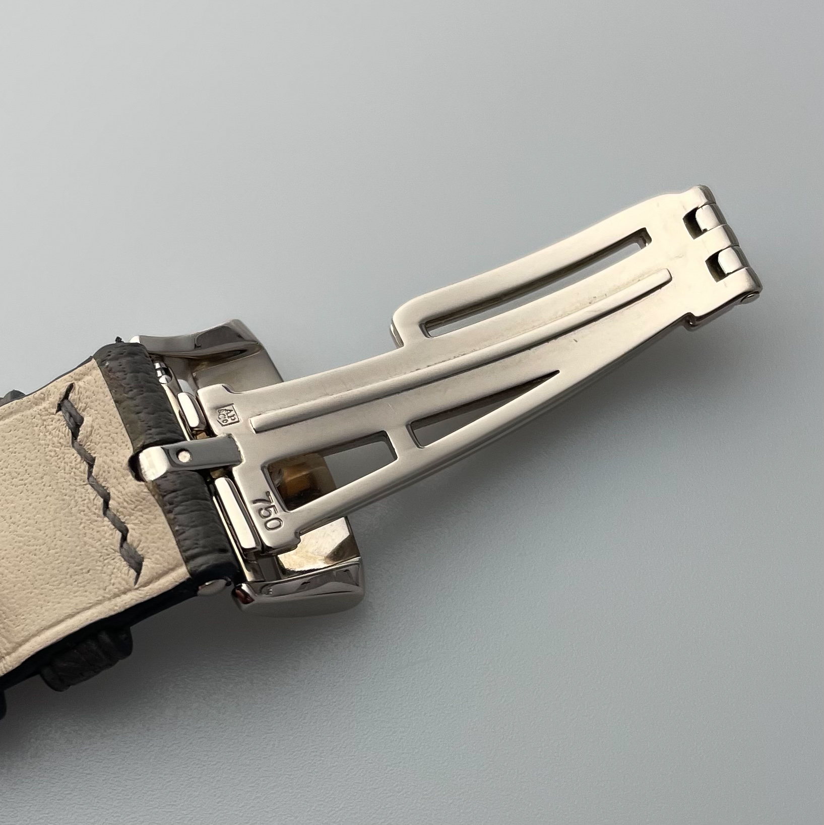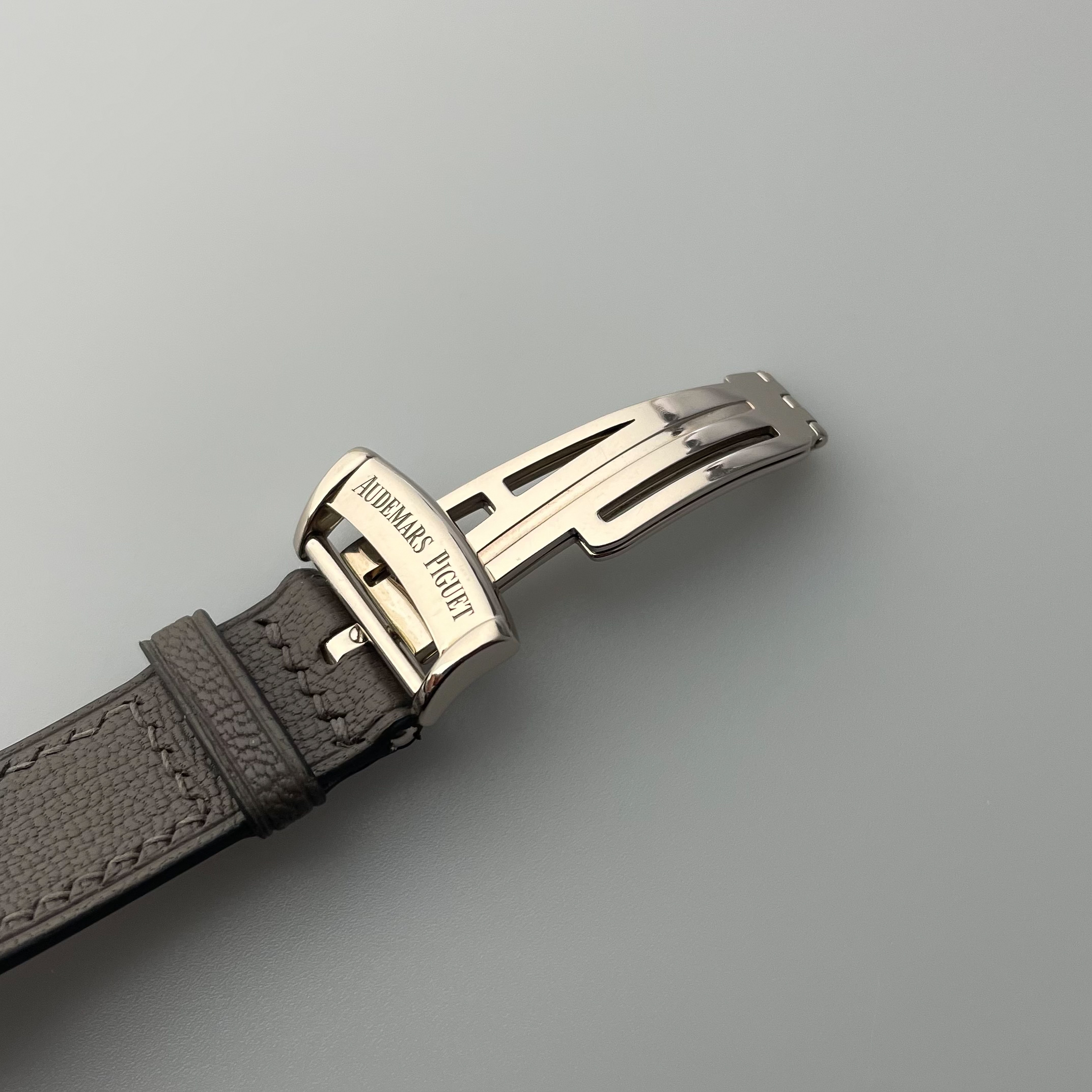 The watch comes on a handmade cement colored goatskin strap with curved lugs to hug the watch case, it has quick release lugs so the strap can be easily changed. The strap matches the watch beautifully in our opinion. The watch has the rare white gold AP deployment clasp, which most of them do not have.