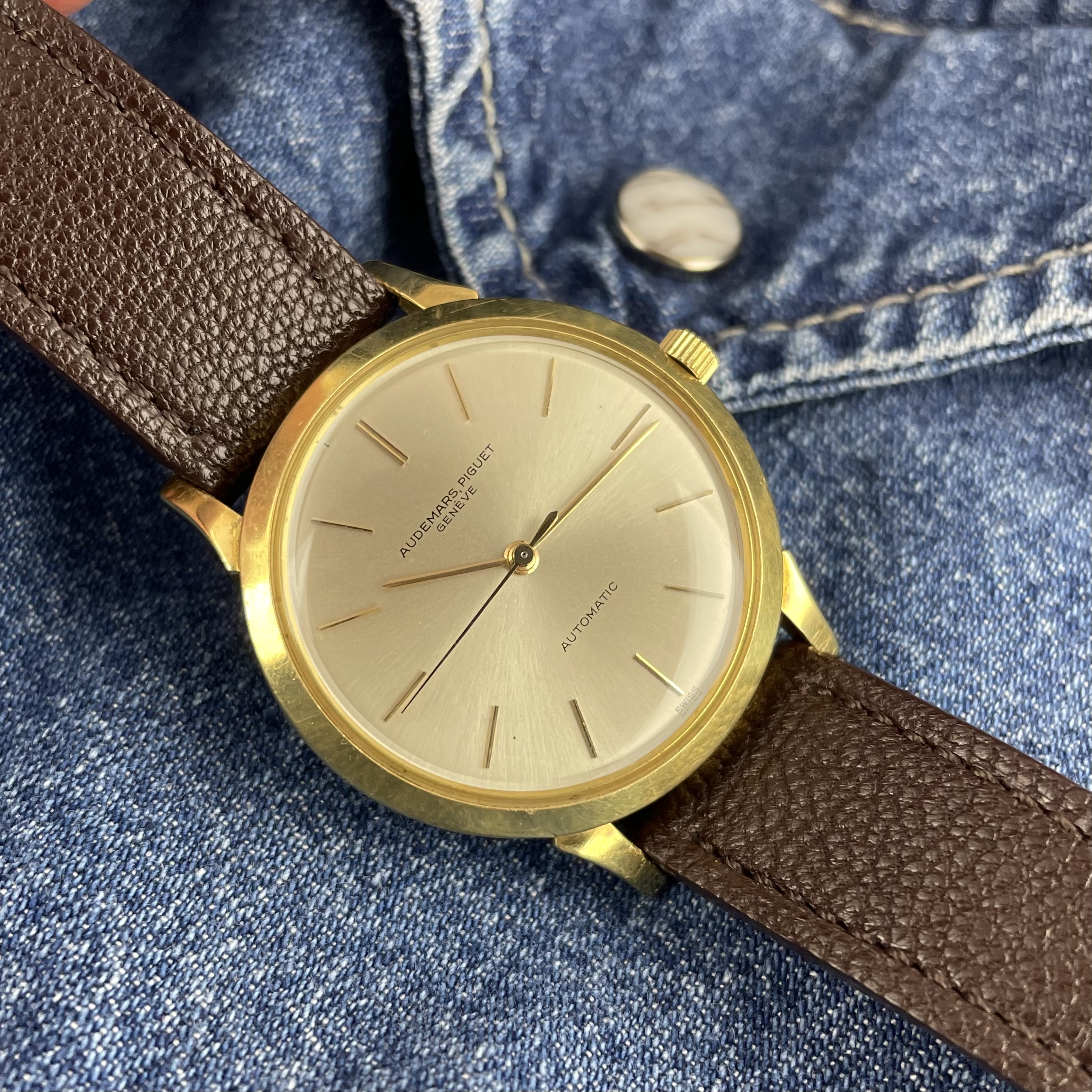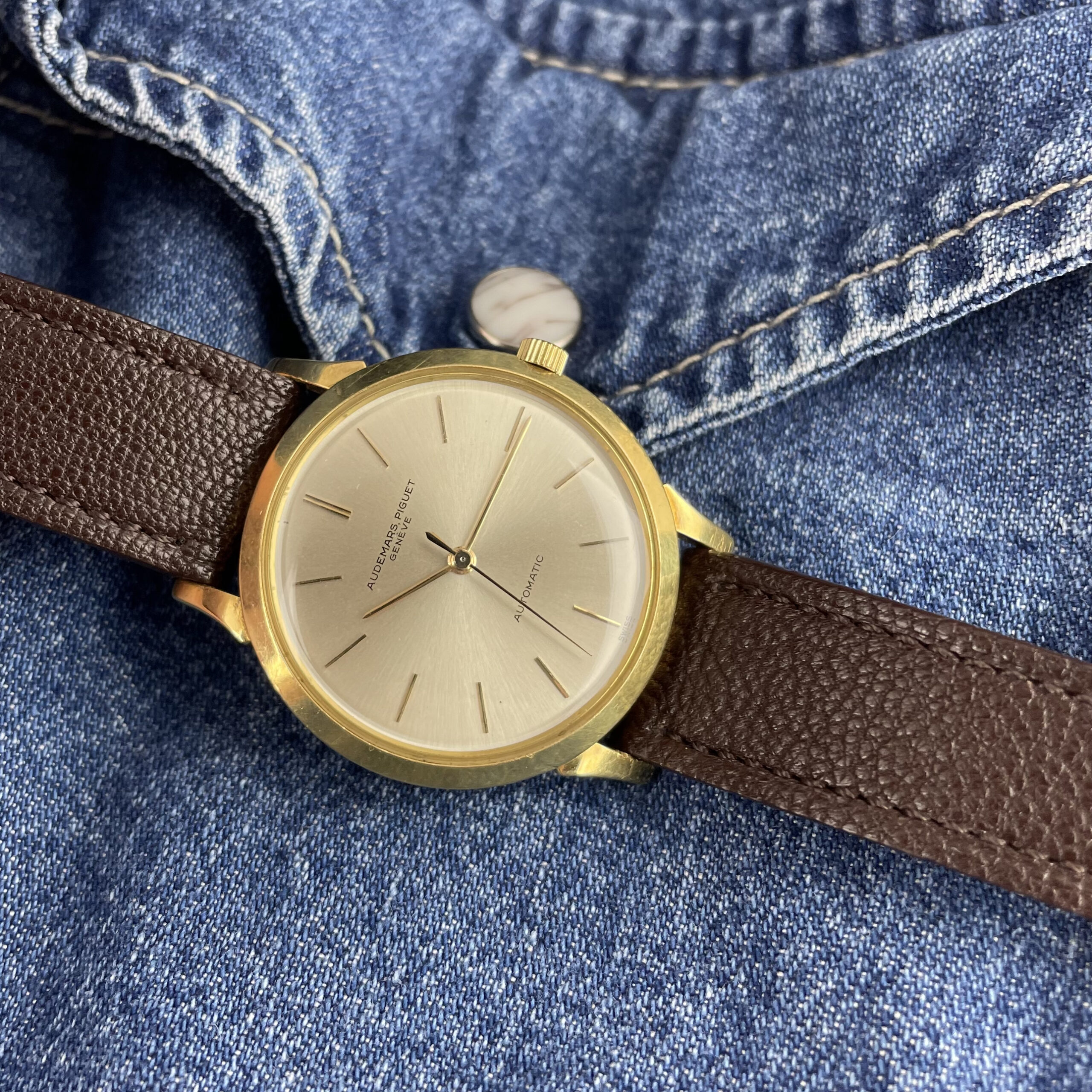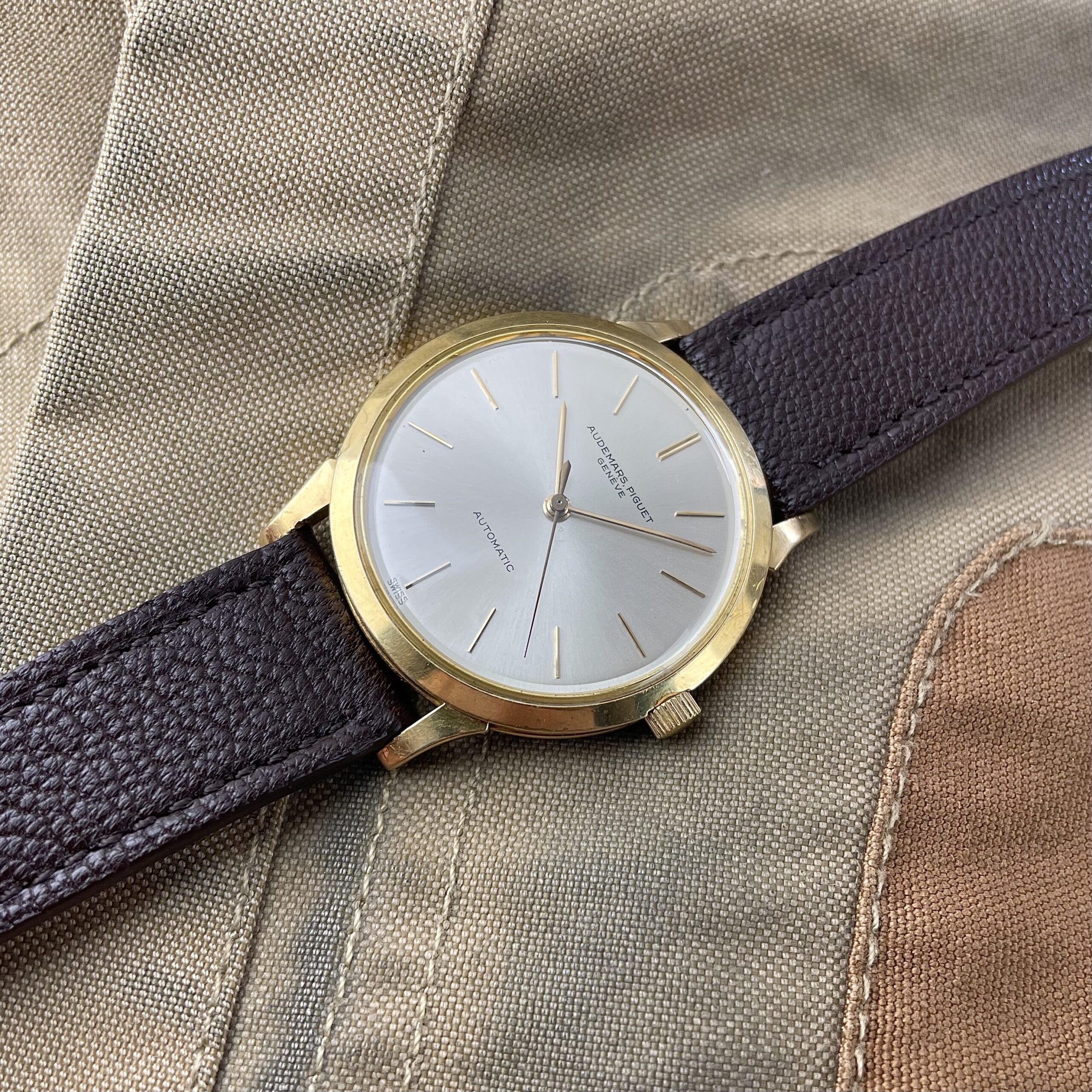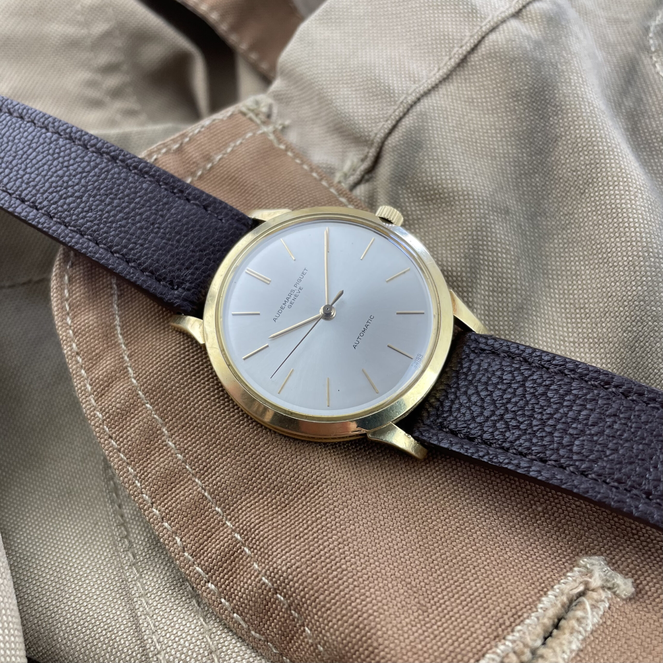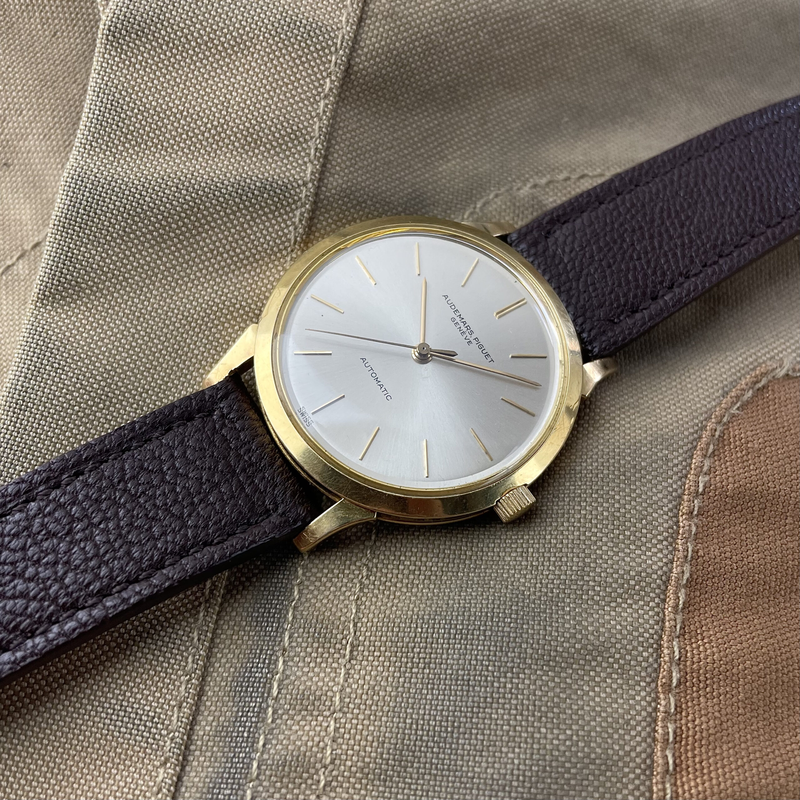 Simplicity at its finest. This Audemars Piguet is just a perfect dress watch, executed to perfection. Automatic dress watches from this period by Audemars Piguet are a rare find. The 35mm 18k yellow gold Wenger case is beautifully shaped with strong lugs and lines. The watch has been worn, but comes in nice condition. Signs of wear are mainly concentrated on the case back. The dial is super clean both in design and condition. The impressive K2071 caliber with central seconds from the early sixties is running strong and looks excellent. The watch comes with its original 18k yellow gold Wenger buckle as well as the original box. The new handmade goat leather strap from Japan matches it perfectly.