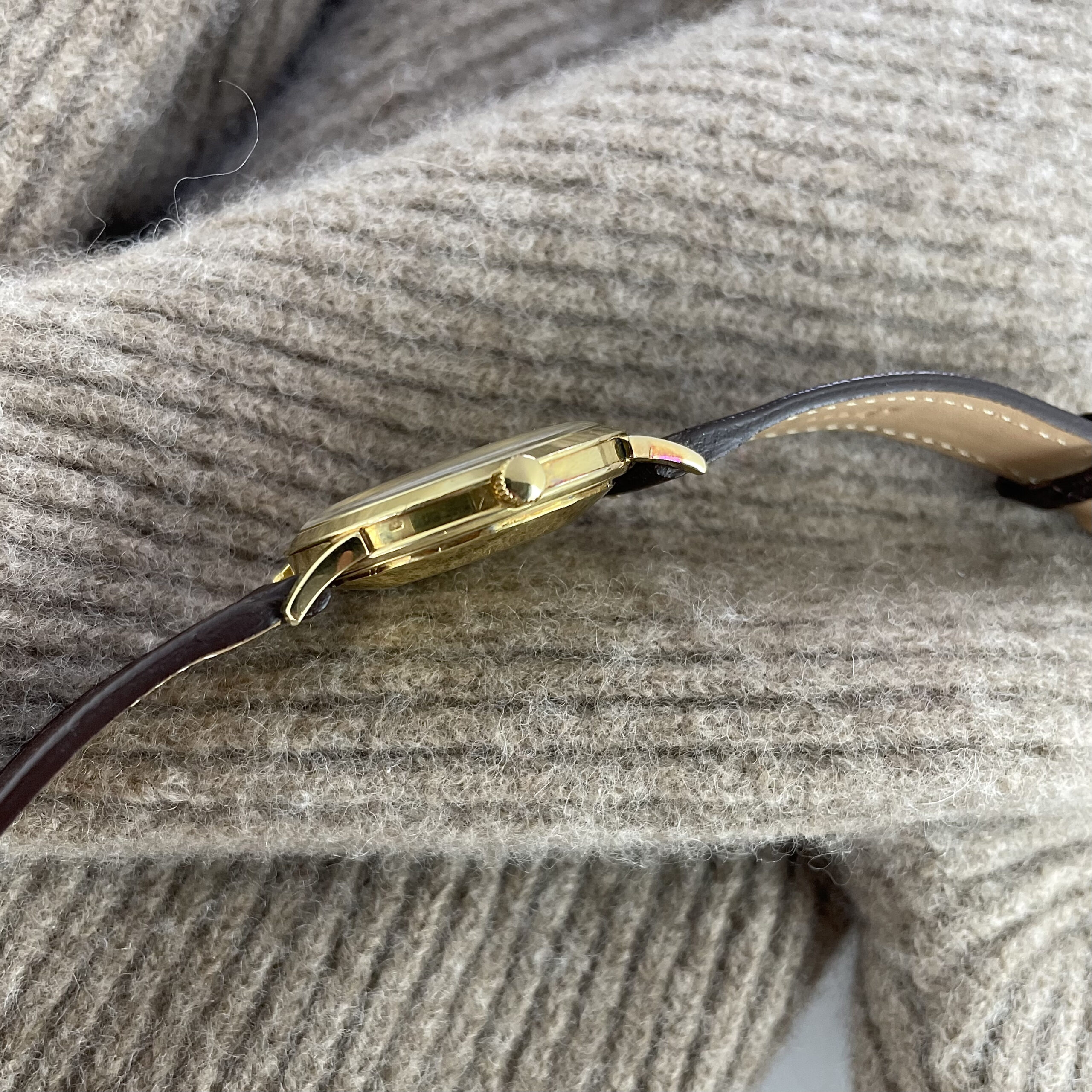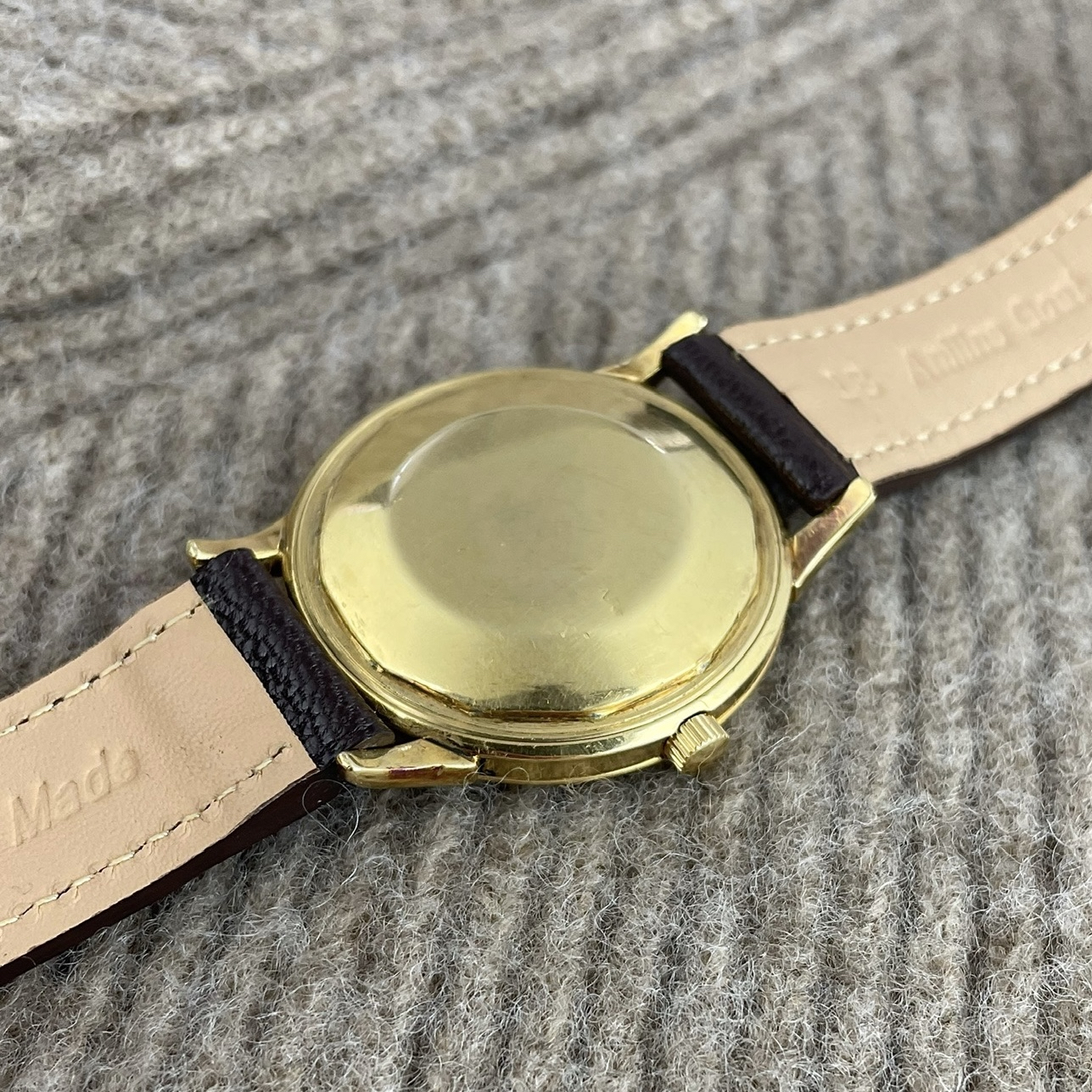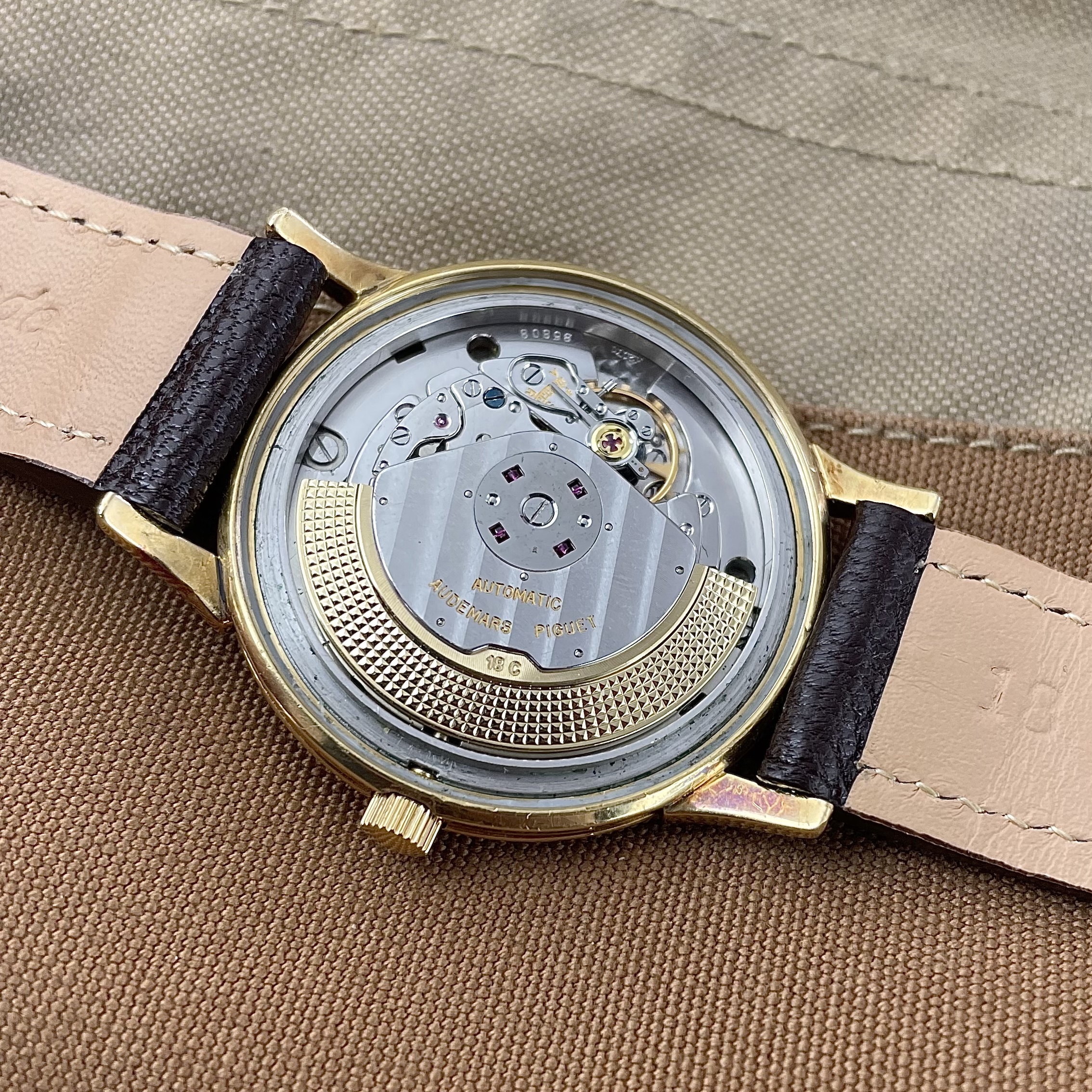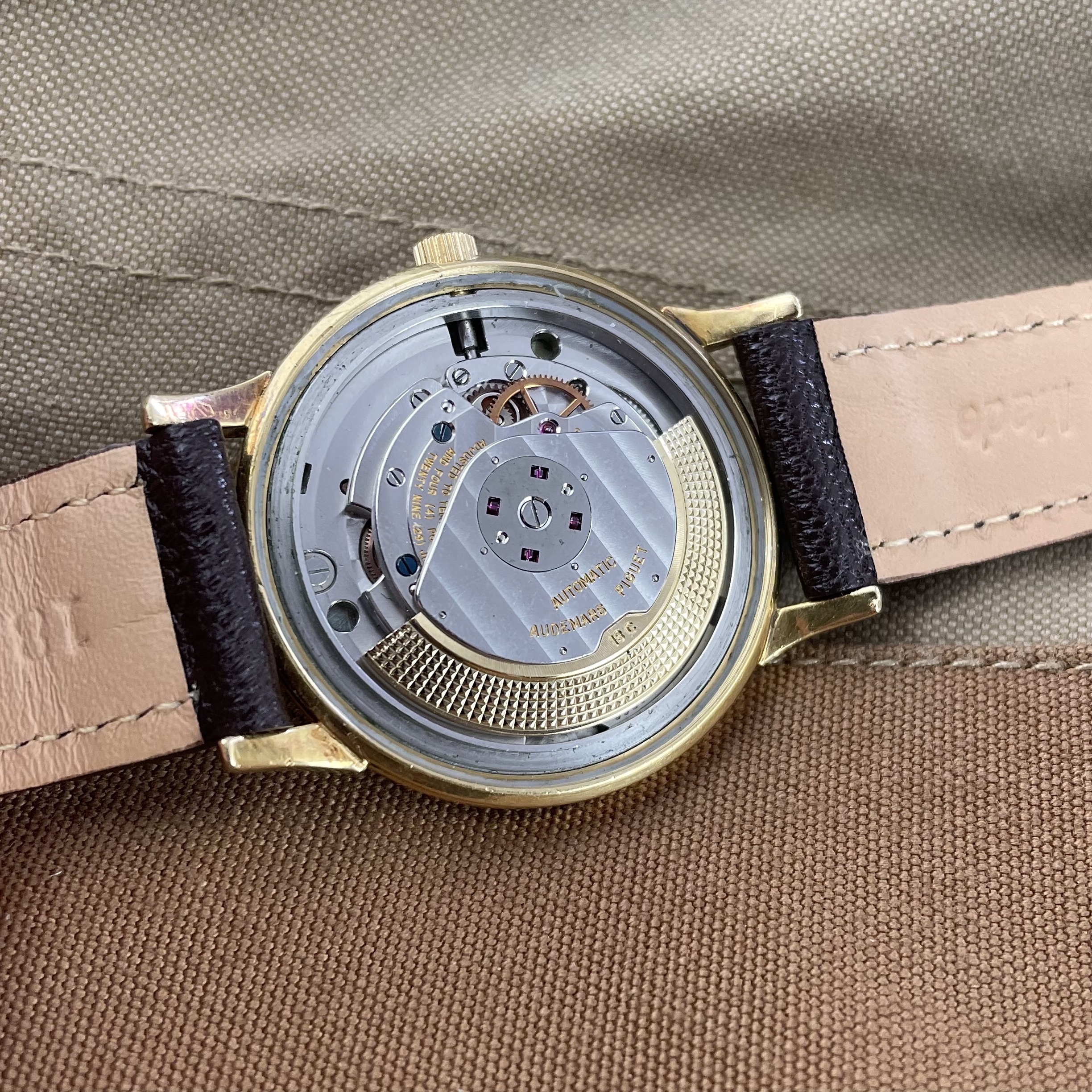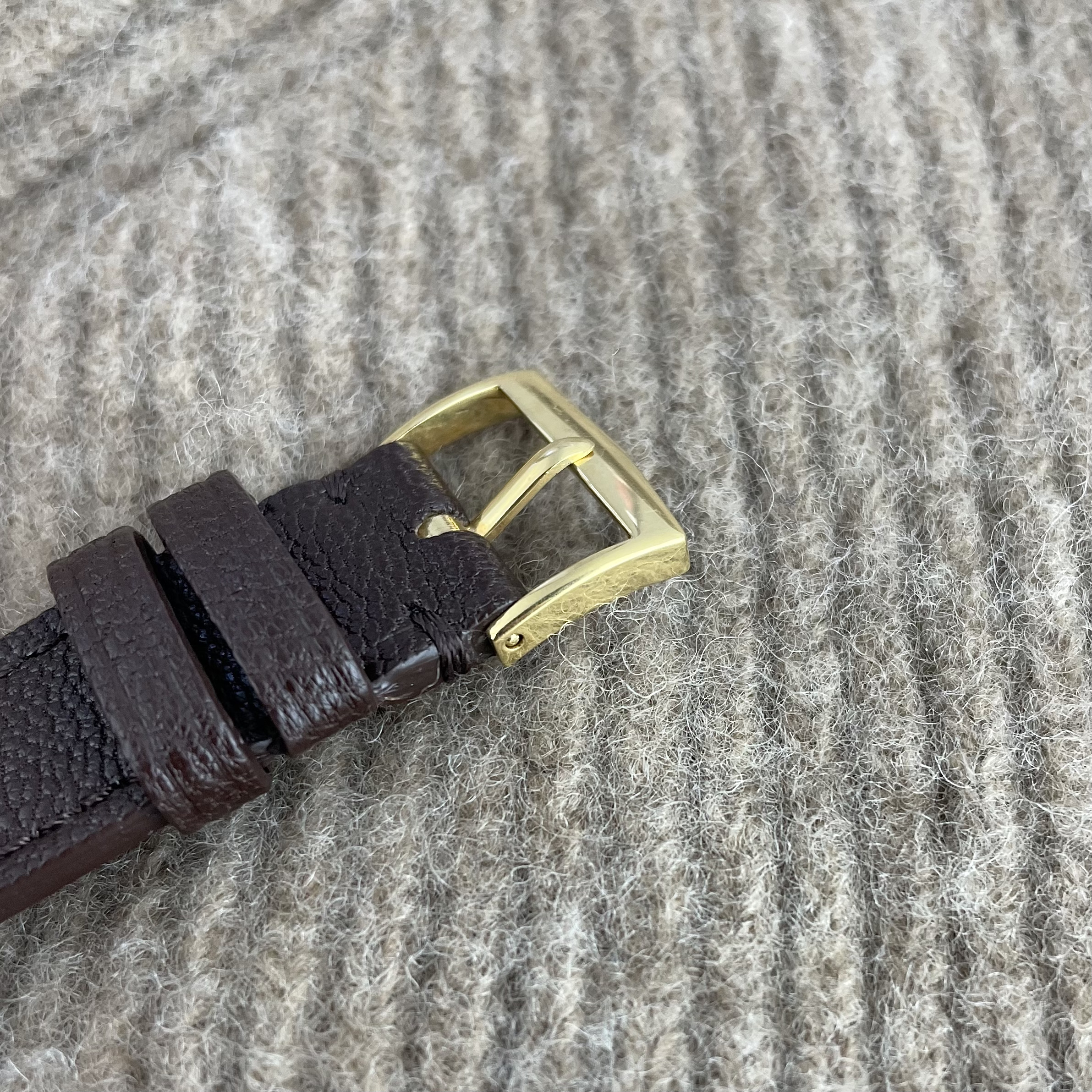 Simplicity at its finest. This Audemars Piguet is just a perfect dress watch, executed to perfection. Automatic dress watches from this period by Audemars Piguet are a rare find. The 35mm 18k yellow gold Wenger case is beautifully shaped with strong lugs and lines. The watch has been worn, but comes in nice condition. Signs of wear are mainly concentrated on the case back. The dial is super clean both in design and condition. The impressive K2071 caliber with central seconds from the early sixties is running strong and looks excellent. The watch comes with its original 18k yellow gold Wenger buckle as well as the original box. The new handmade goat leather strap from Japan matches it perfectly.
