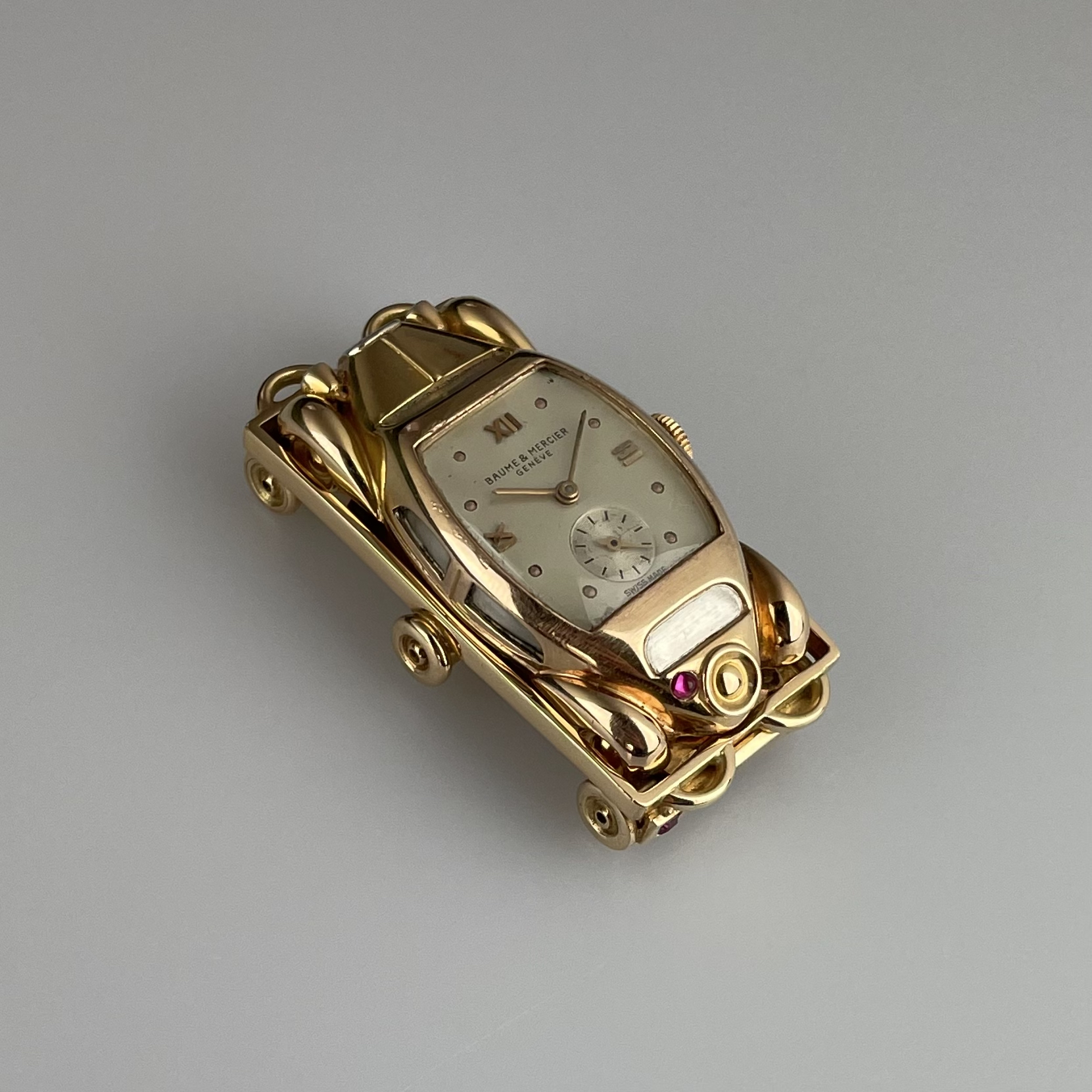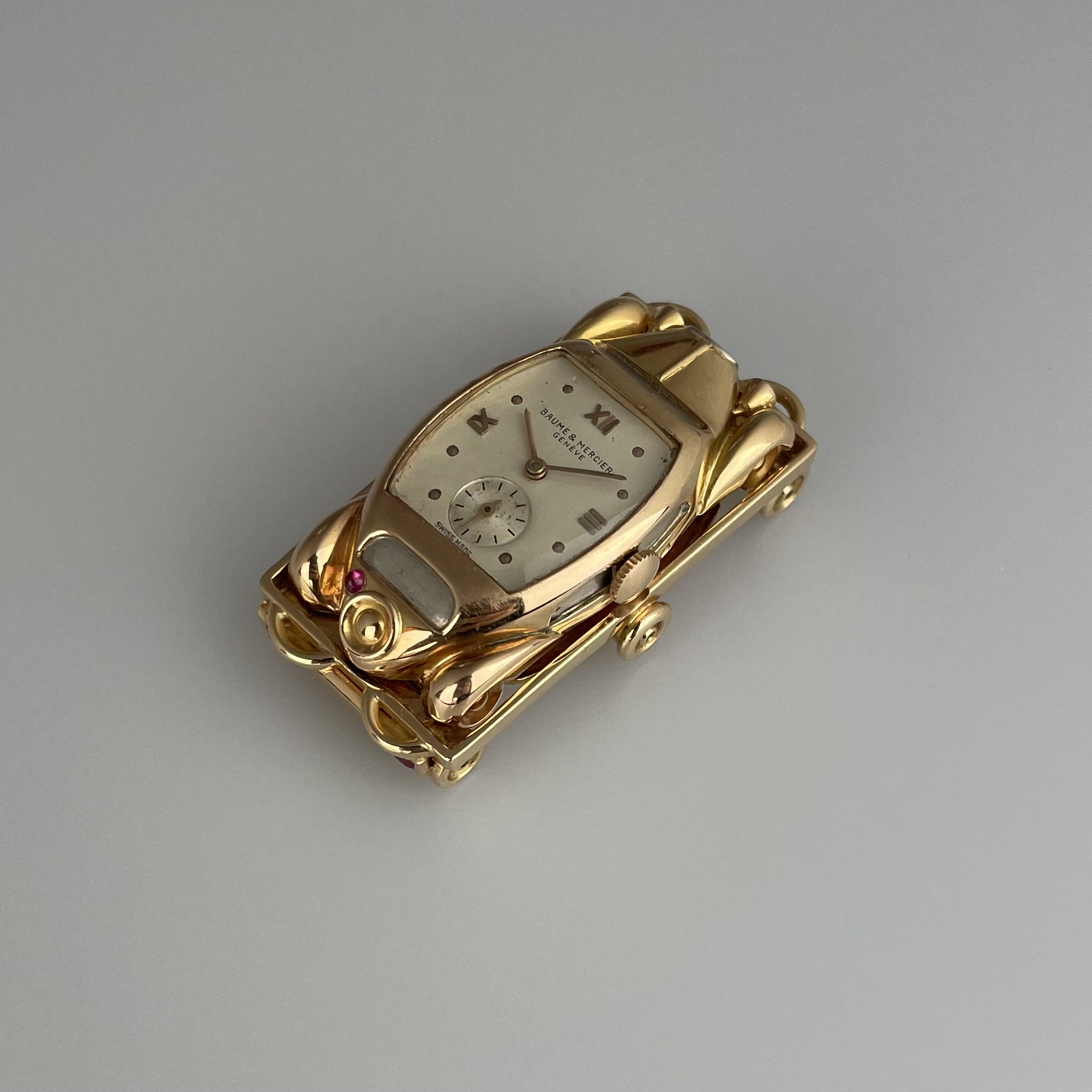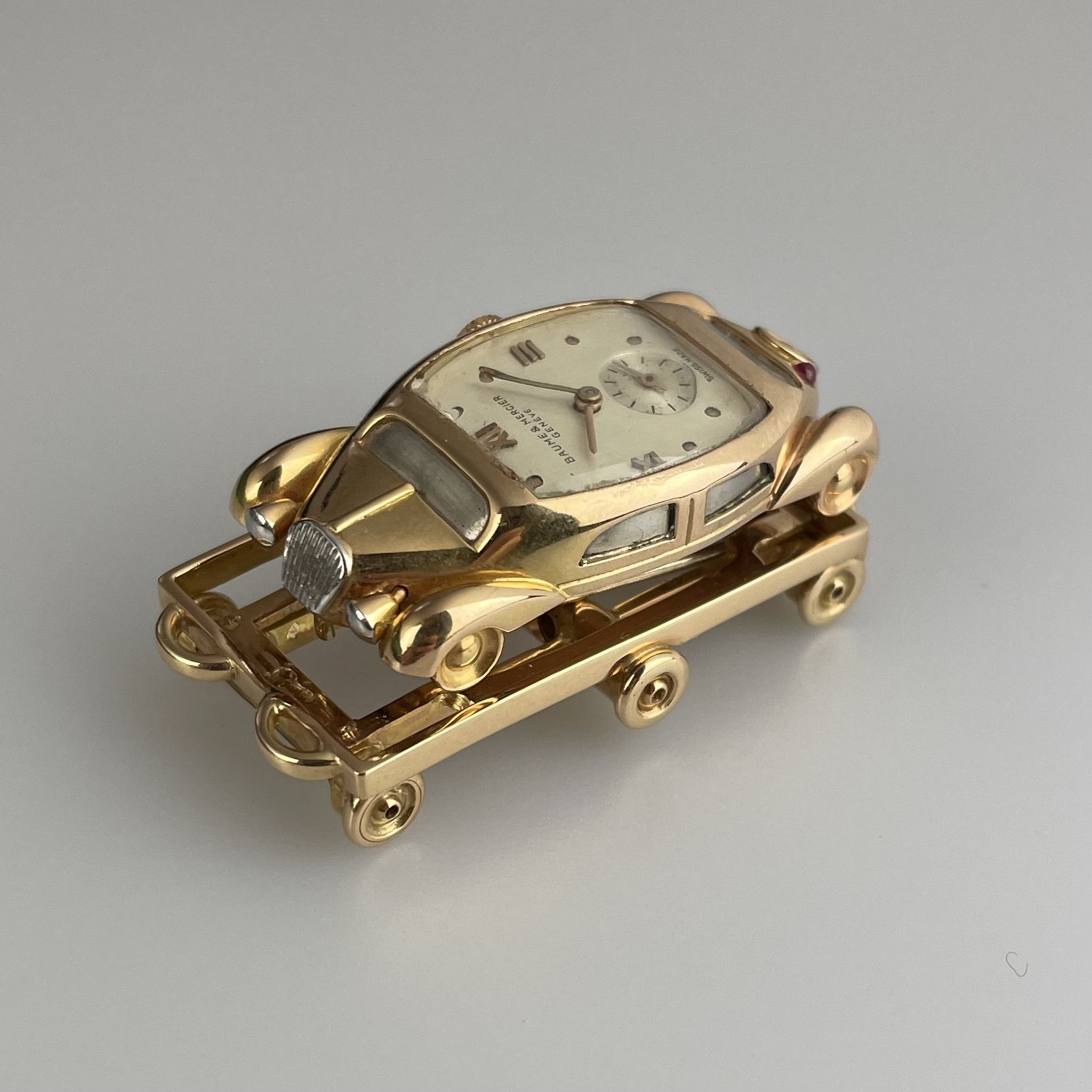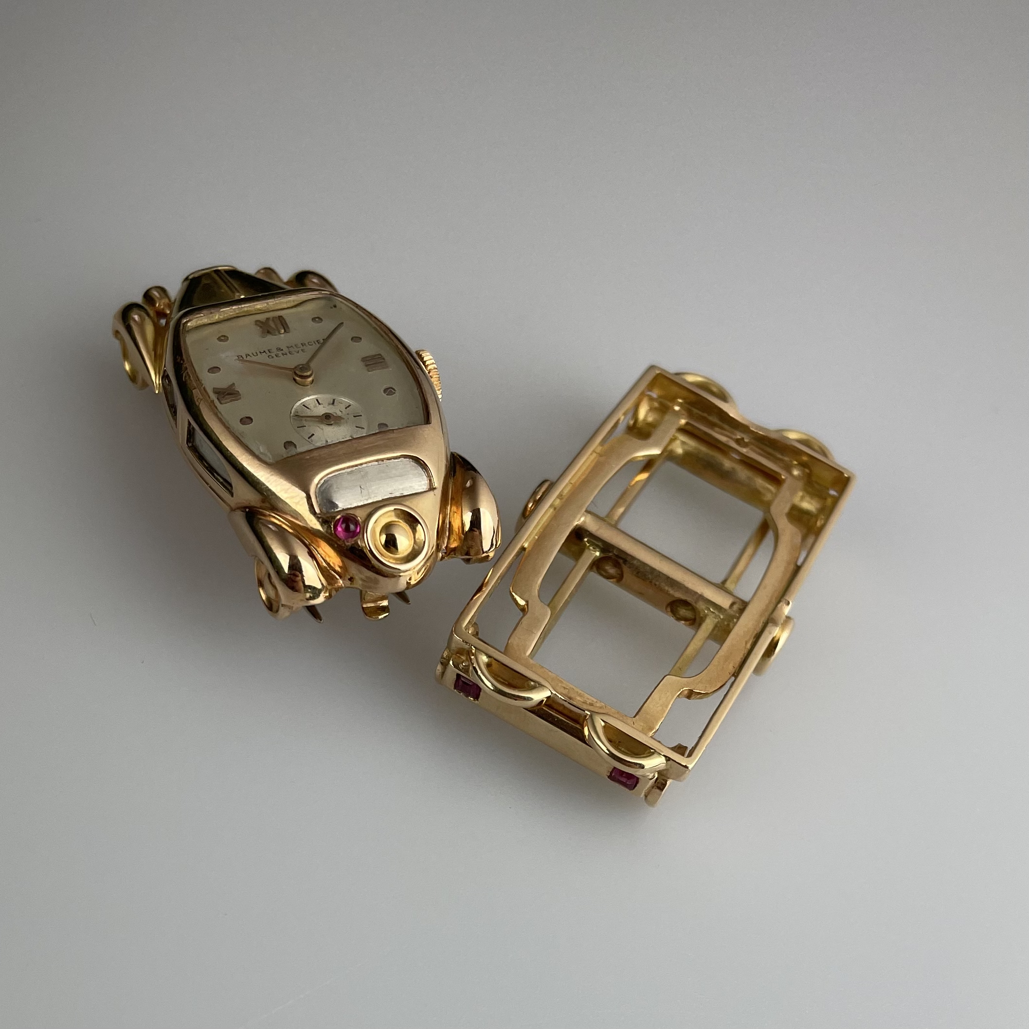 This must be the most unusual watch we have ever encountered. It was created for Baume et Mercier by Werner Rutschi (Key Hallmark 7) in Geneva. The piece was most likely produced in the late 1940’s. It is a car brooch containing a manual winding watch. This brooch in turn can be mounted on to a gold trailer which converts it to a wristwatch. The level of craftsmanship is unbelievable. The piece has been made in yellow gold, and the headlights and grill are produced in white gold for contrast. In addition the rear lights are actual rubies. The watch comes on a pigskin strap. We always look for the unknown, and this was quite the discovery. If you would like to know more, please get in touch.