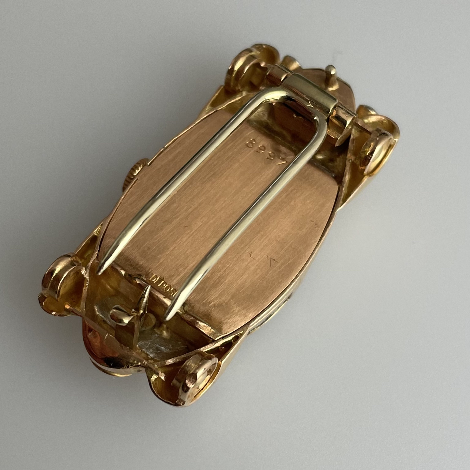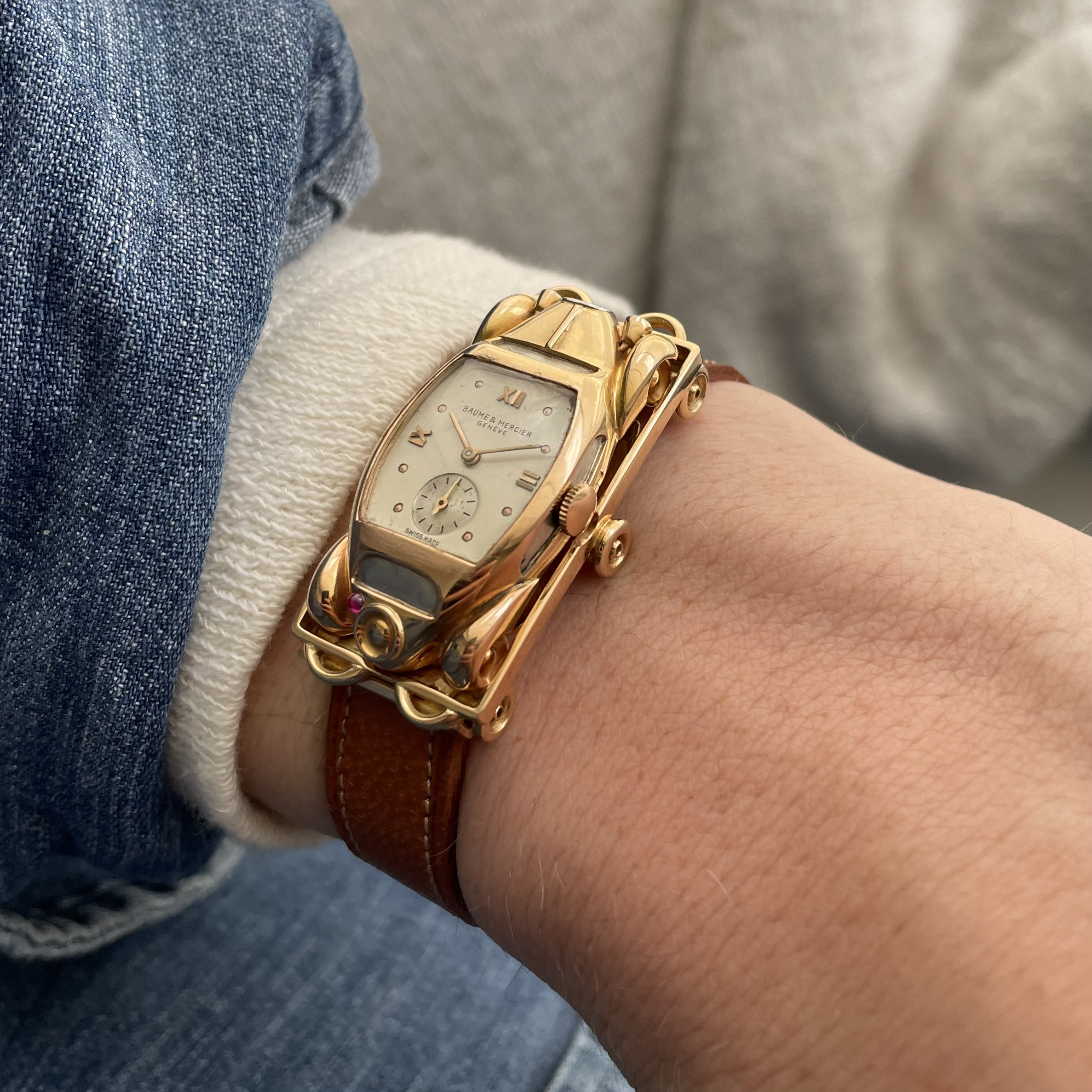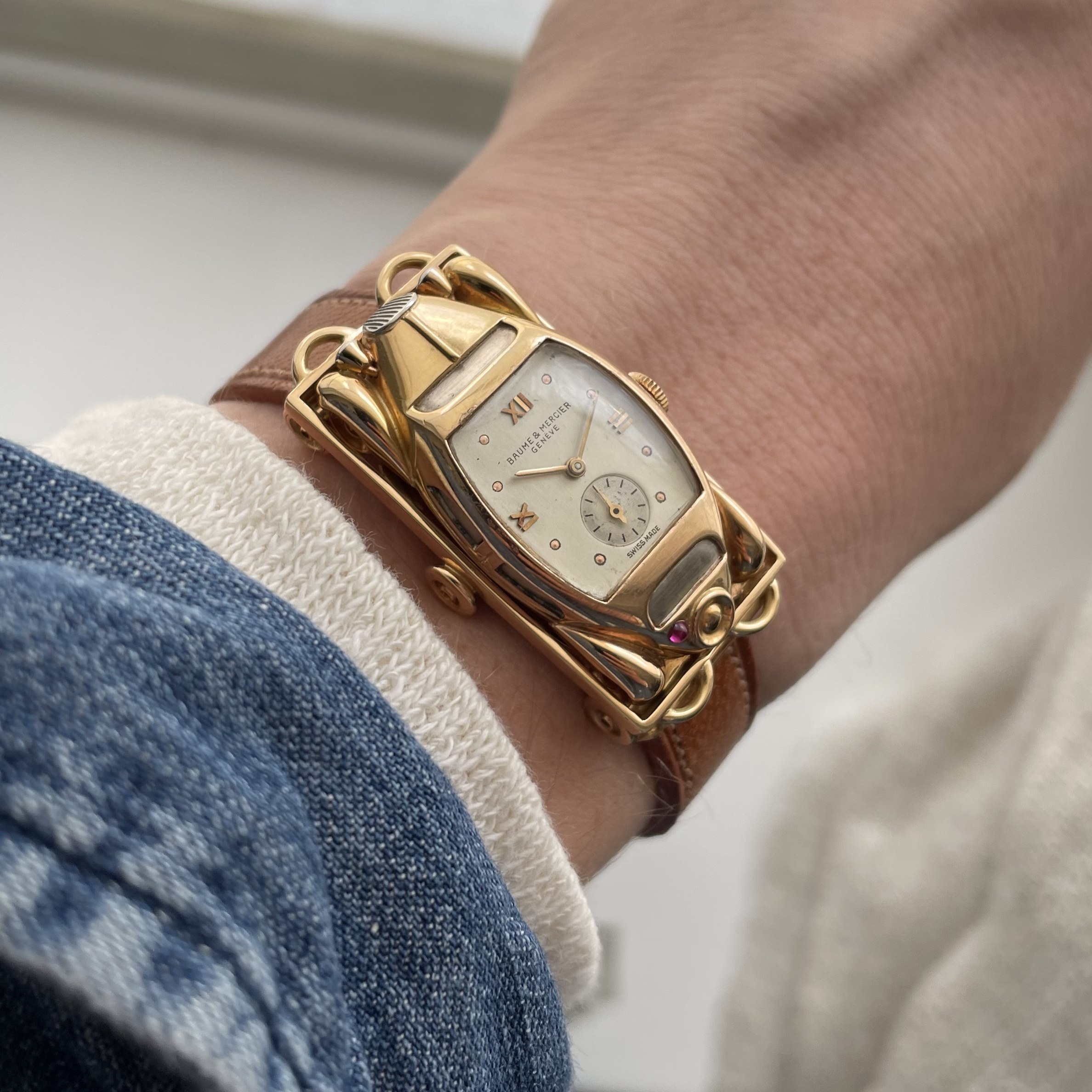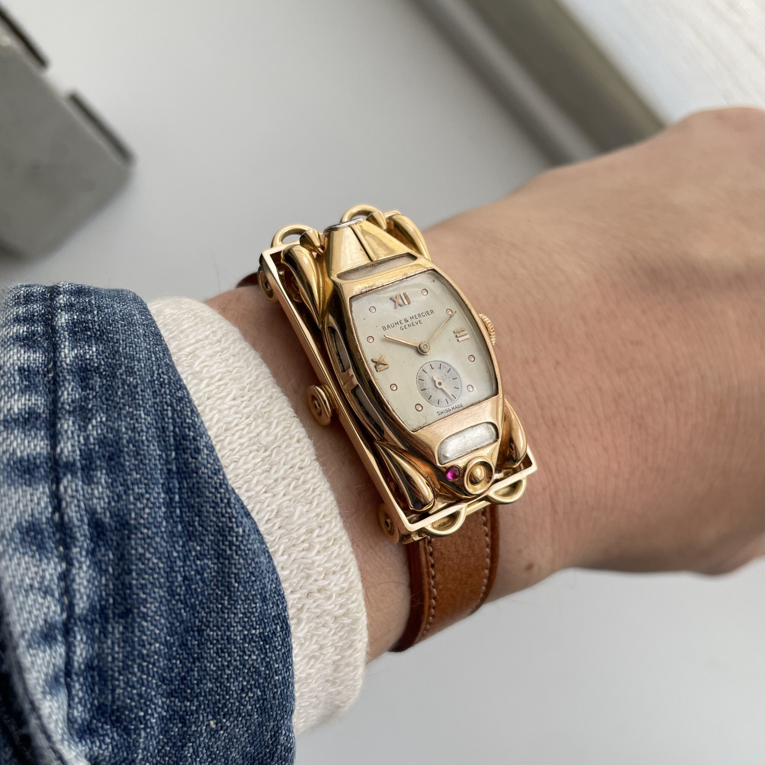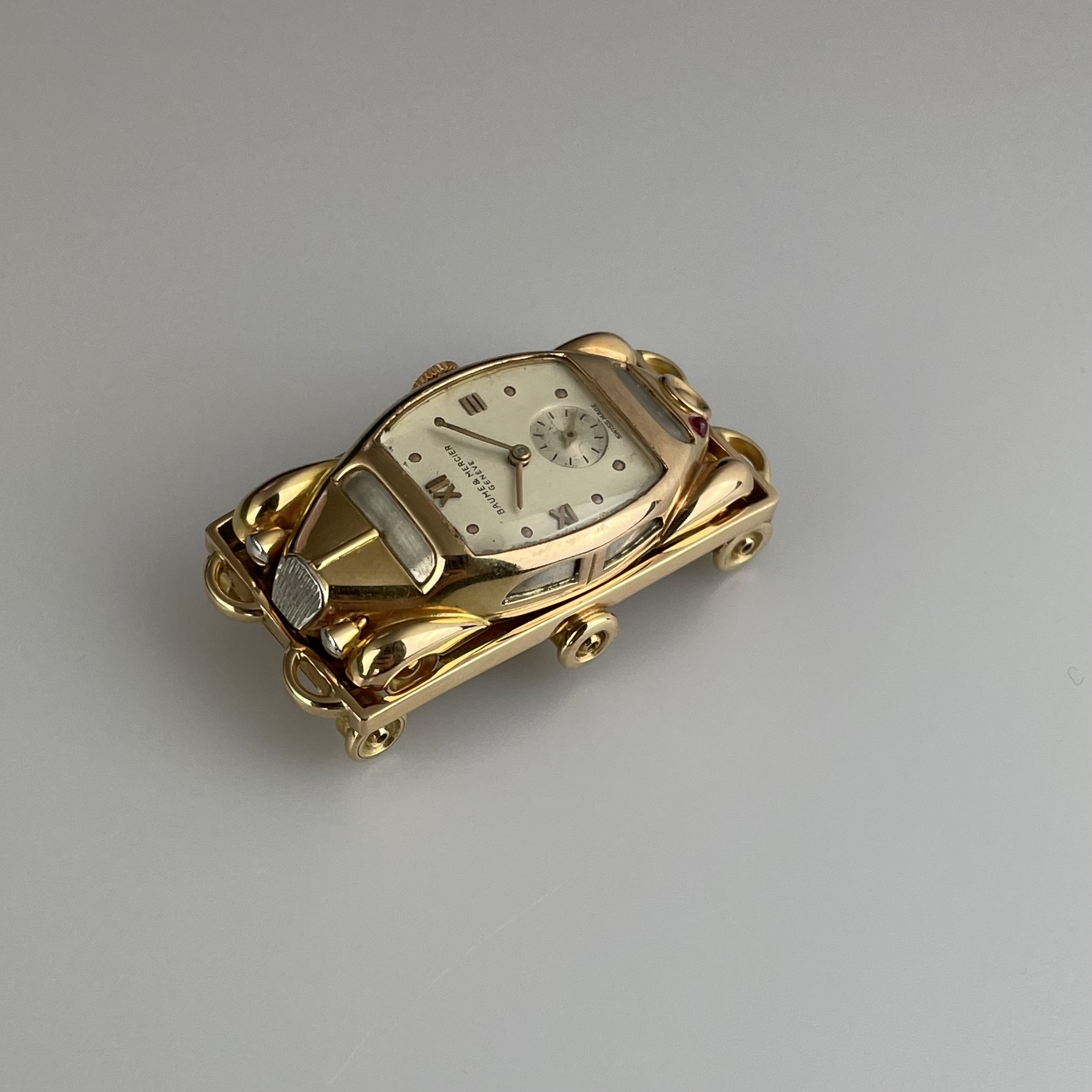 This must be the most unusual watch we have ever encountered. It was created for Baume et Mercier by Werner Rutschi (Key Hallmark 7) in Geneva. The piece was most likely produced in the late 1940’s. It is a car brooch containing a manual winding watch. This brooch in turn can be mounted on to a gold trailer which converts it to a wristwatch. The level of craftsmanship is unbelievable. The piece has been made in yellow gold, and the headlights and grill are produced in white gold for contrast. In addition the rear lights are actual rubies. The watch comes on a pigskin strap. We always look for the unknown, and this was quite the discovery. If you would like to know more, please get in touch.