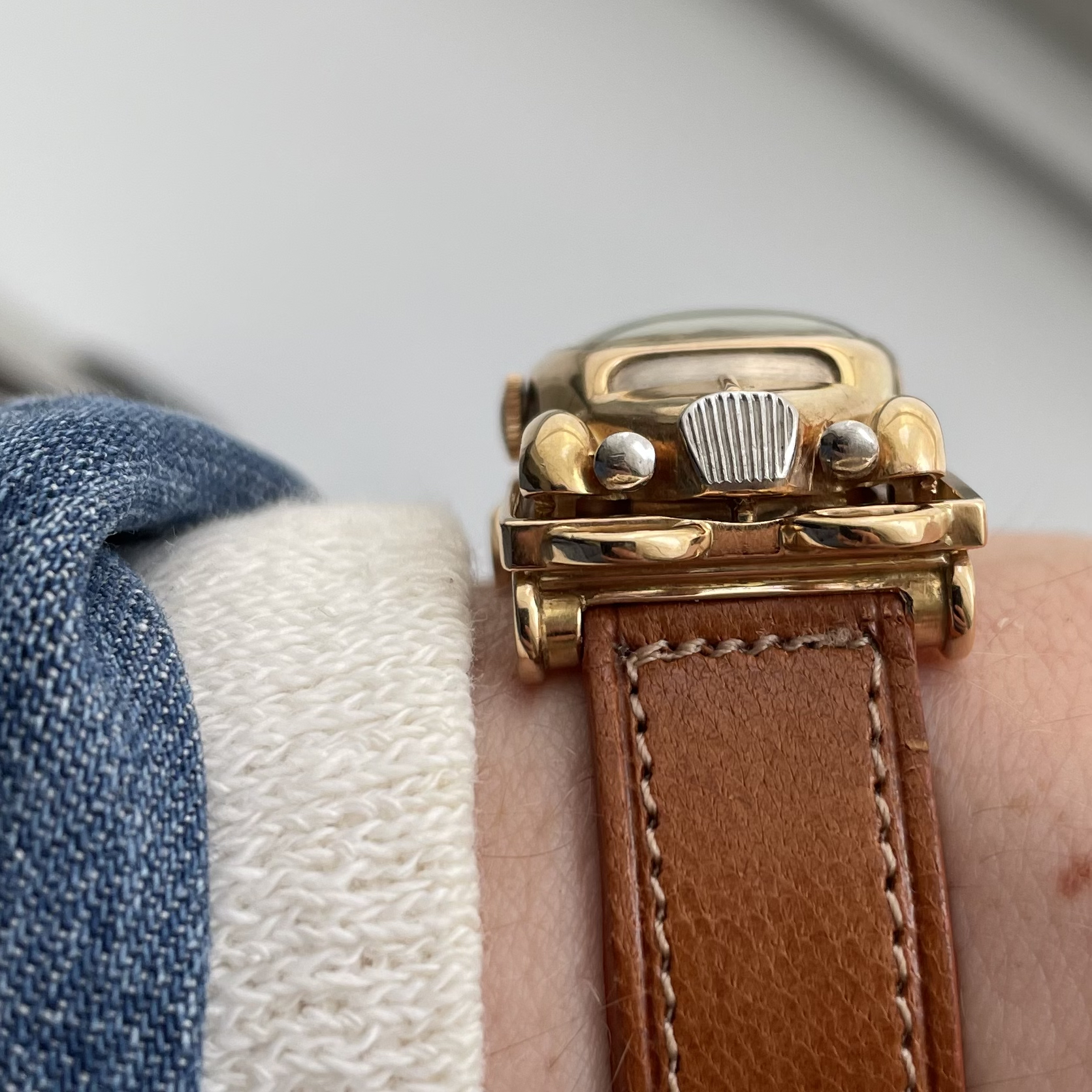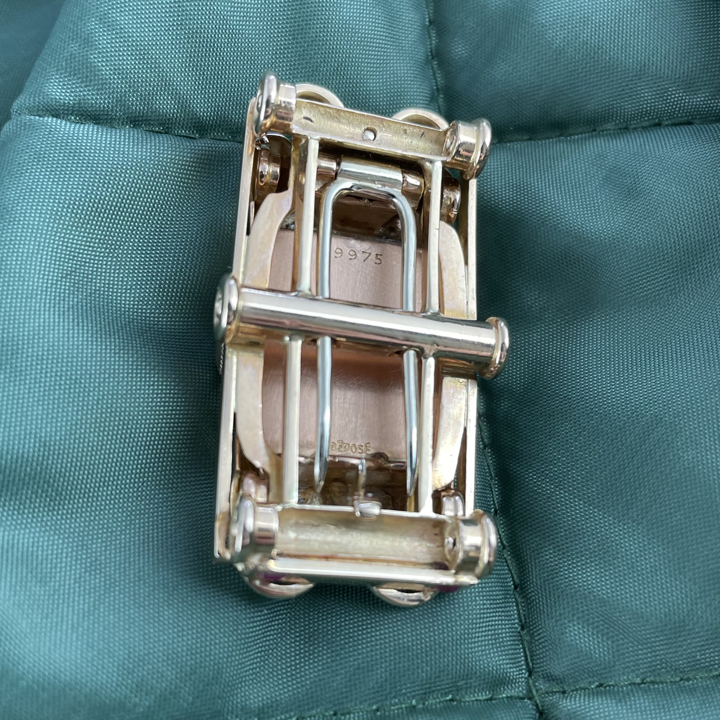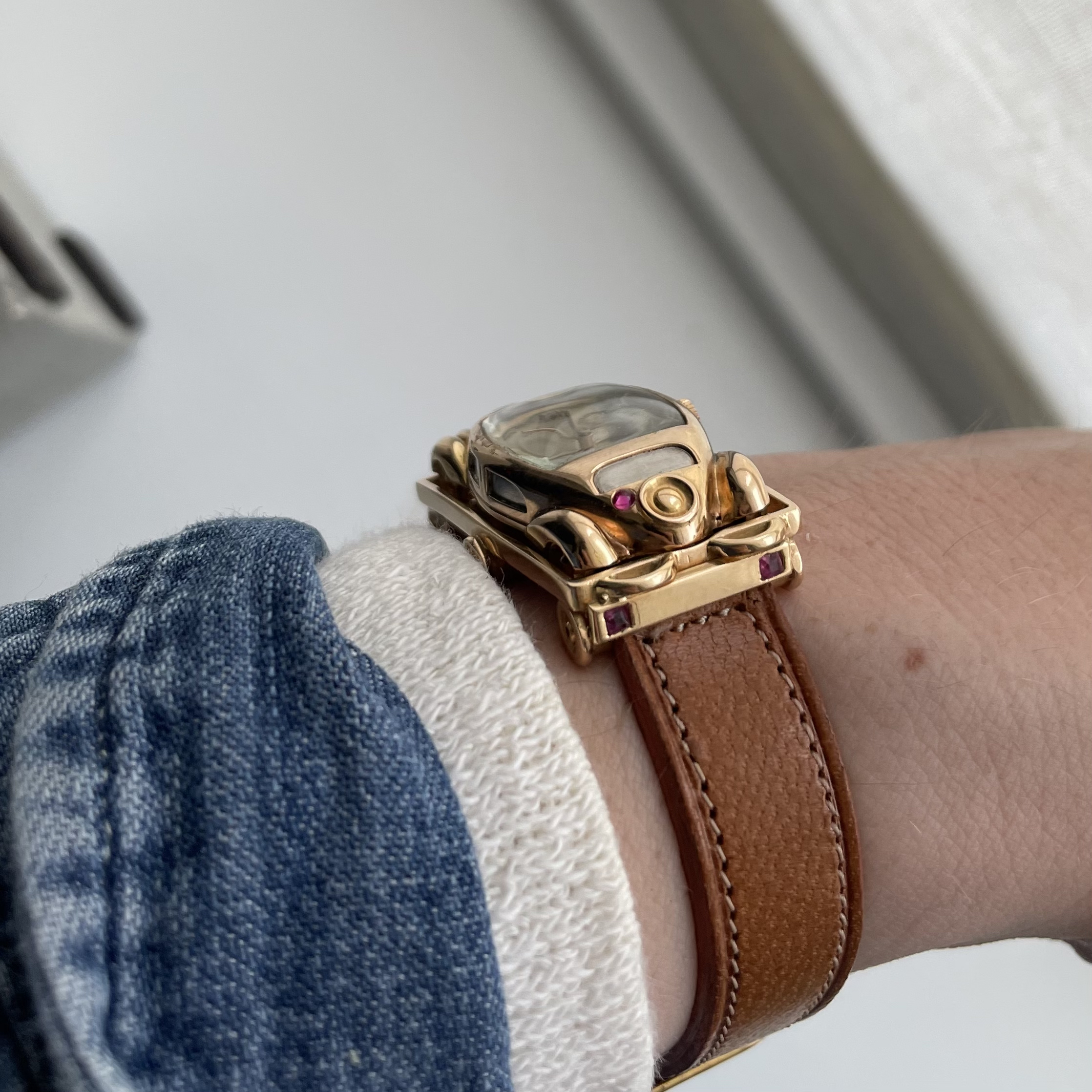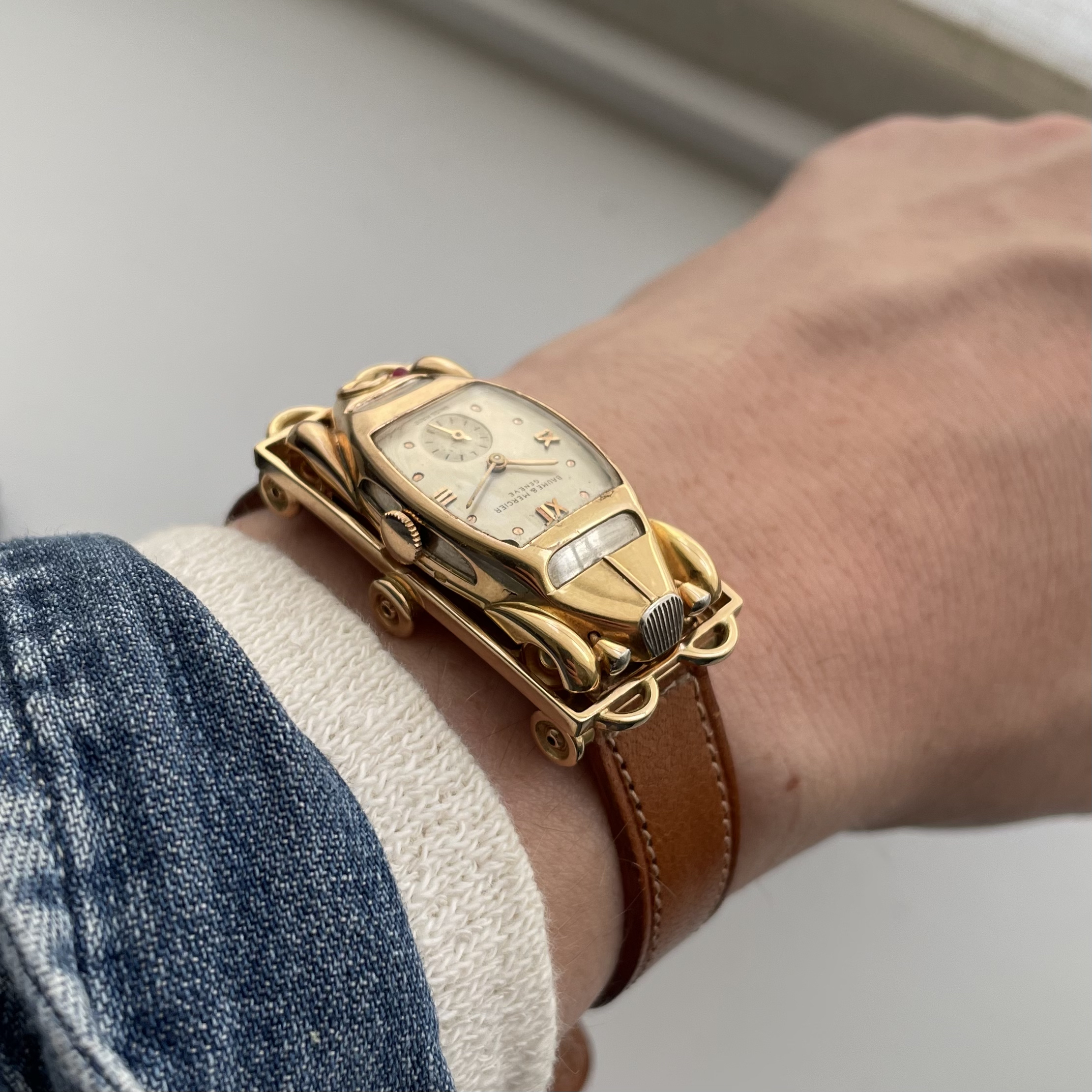 This must be the most unusual watch we have ever encountered. It was created for Baume et Mercier by Werner Rutschi (Key Hallmark 7) in Geneva. The piece was most likely produced in the late 1940’s. It is a car brooch containing a manual winding watch. This brooch in turn can be mounted on to a gold trailer which converts it to a wristwatch. The level of craftsmanship is unbelievable. The piece has been made in yellow gold, and the headlights and grill are produced in white gold for contrast. In addition the rear lights are actual rubies. The watch comes on a pigskin strap. We always look for the unknown, and this was quite the discovery. If you would like to know more, please get in touch.