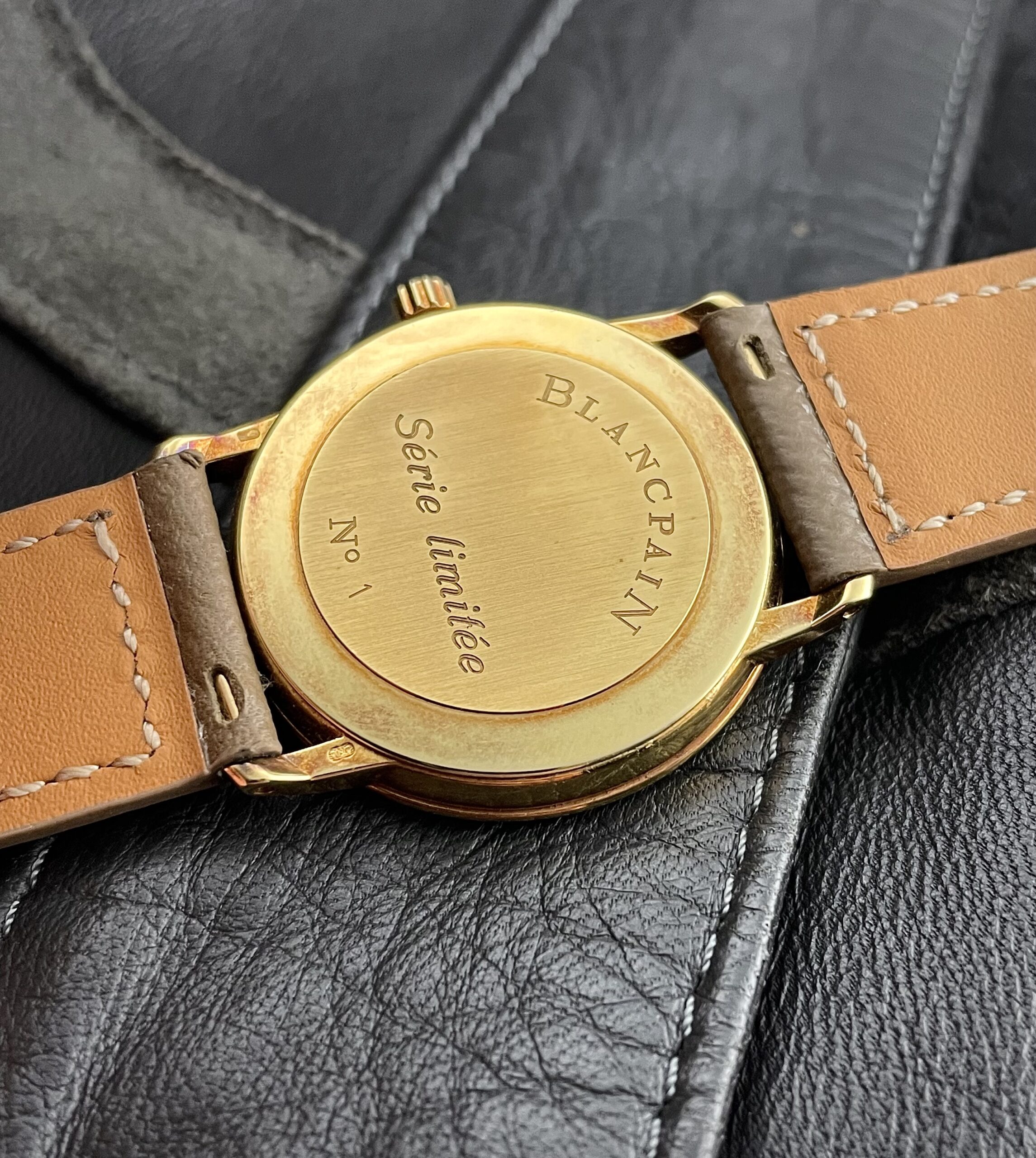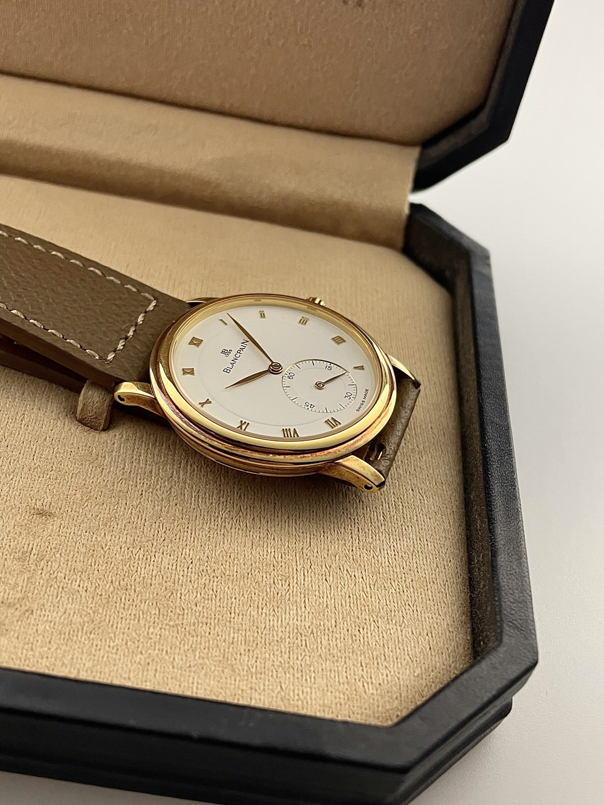 This is a rare blancpain villeret time only reference 7001-1418-55 in exceptional condition. The 33,5 mm yellow gold case has never been polished and has developed an incredible patina on the gold. We see this as an updated version of a classic 1960’s dress watch for modern times. It’s slim case profile and flat mineral crystal create a minimalistic look. The glossy white dial with feuille hands and applied gold roman numerals show the quality of the craftsmanship at Blancpain. Of course the watch is complete with its original crown and buckle. It also comes with its original box and outer box. The icing on the cake here is that it is production number 1 of this model. This is exceptionally rare to find and is a nice bonus for its new owner