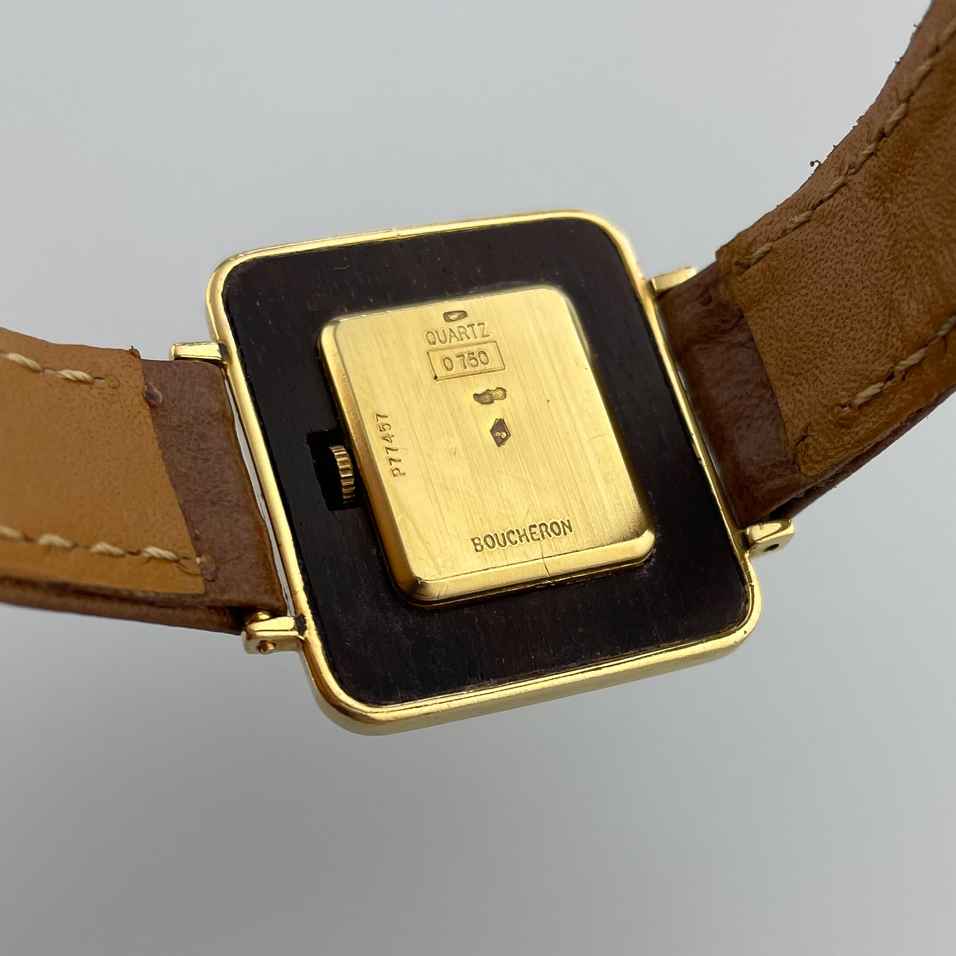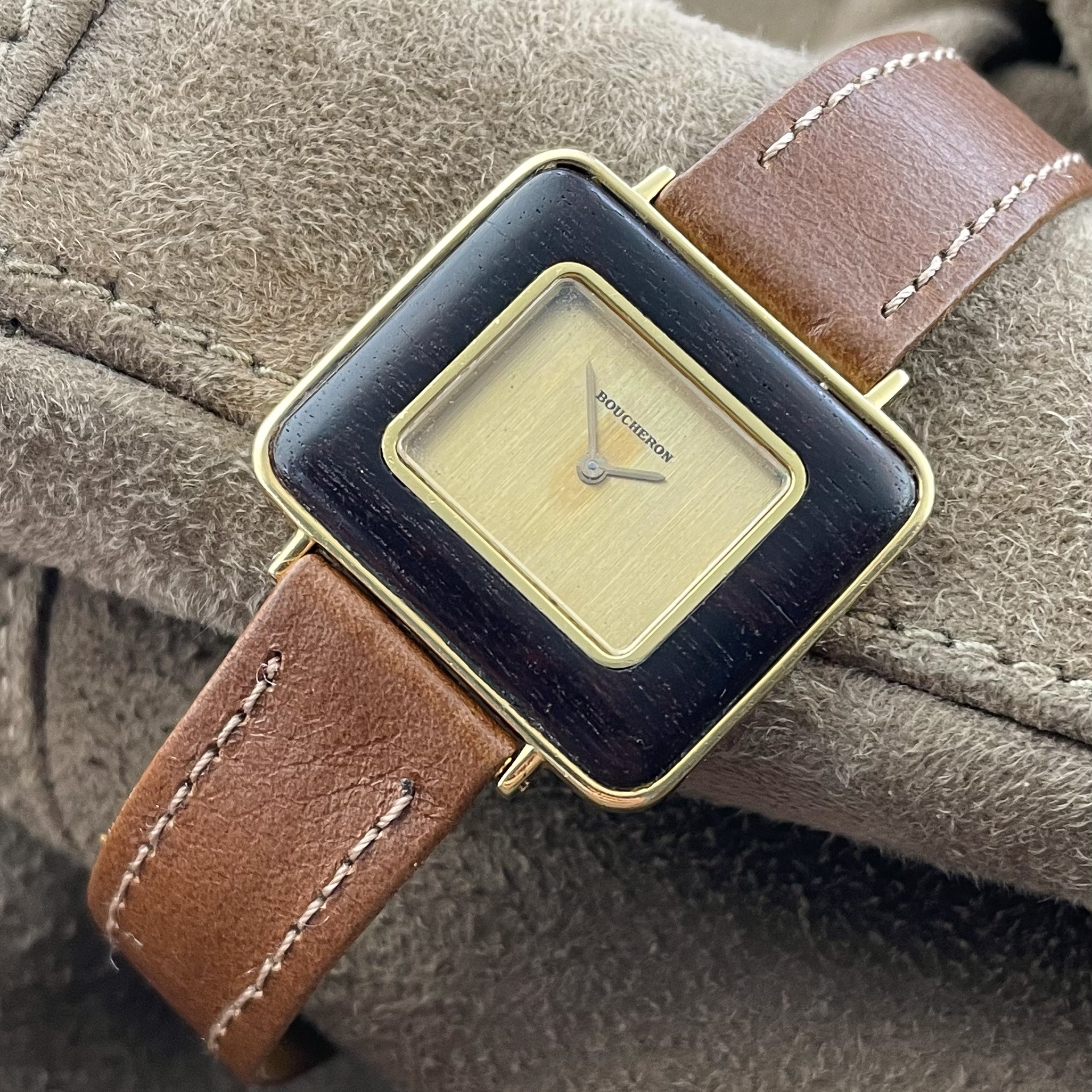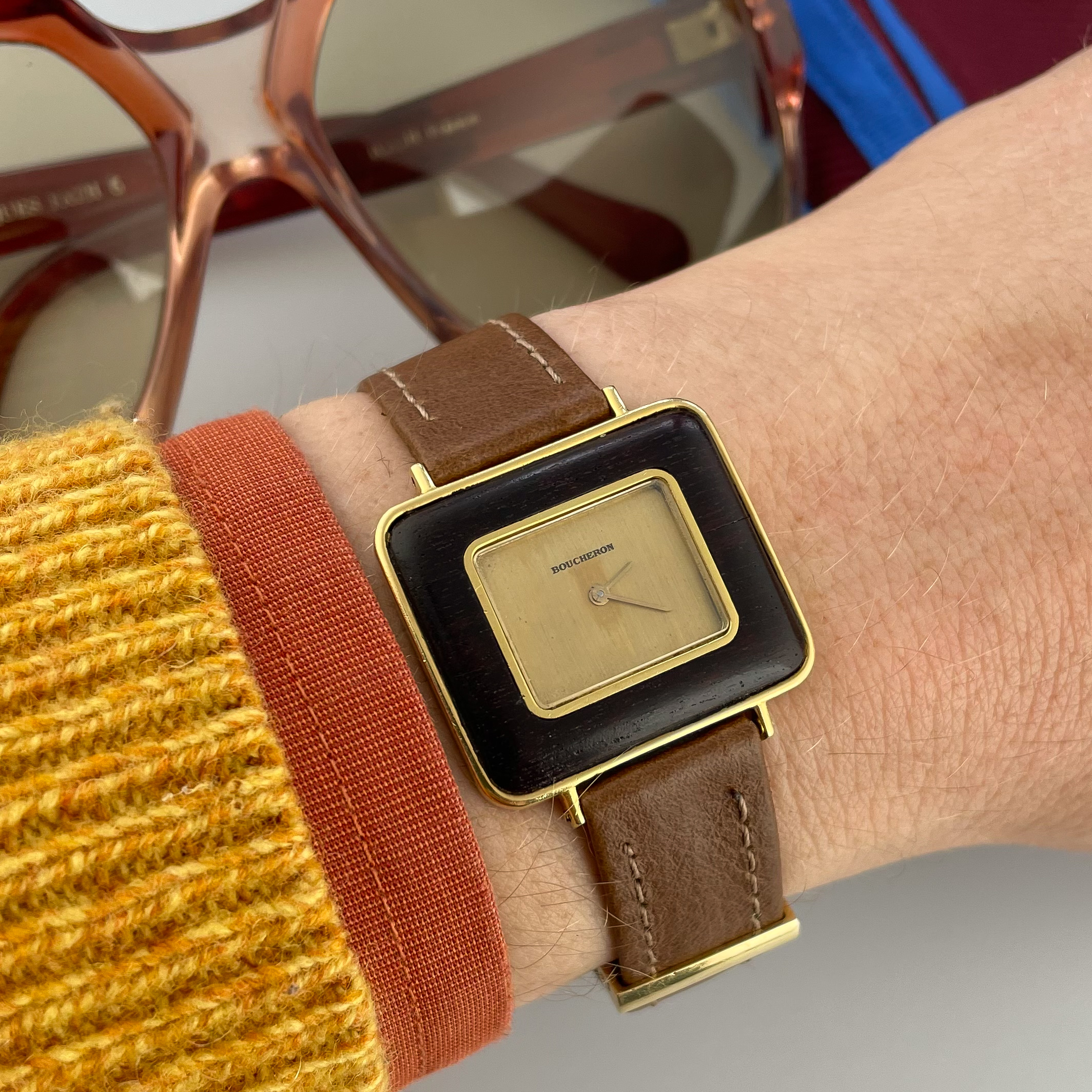 This is a very rare piece from Boucheron produced in the 1970’s. Besides the interesting patented closure systems, this watch uses precious wood. Used as early as the 1930’s by Cartier, van Cleef Arpels and Boucheron, wood jewelry made a comeback in the 1970’s. The counterculture promoted naturalism and sustainability, and the counterculture is where fashion is dictated. Approaching exotic wood as a luxury material instead of a common raw material. Combining it with gold precious stones etcetera.