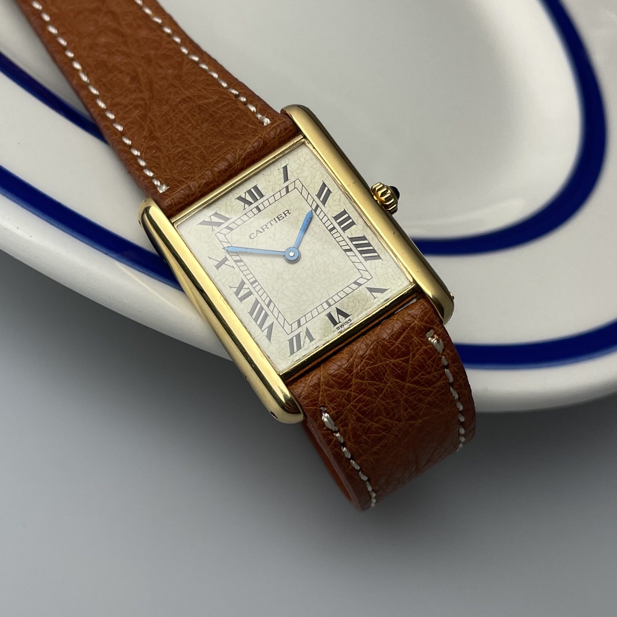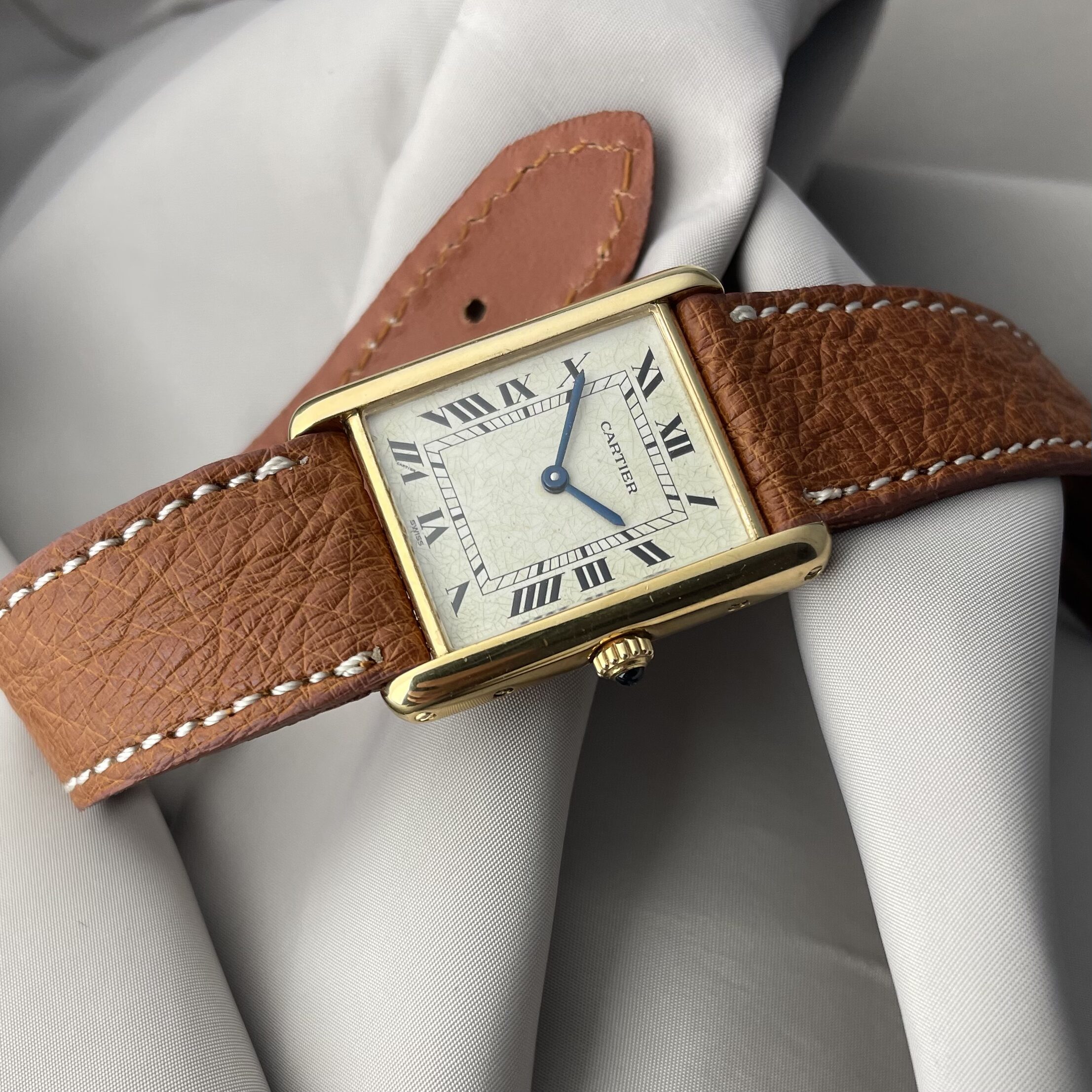 This Cartier Tank Louis 18k comes in very nice condition. It has not been polished and all screws are intact, which is not always the case. Executed in 18k yellow gold in the classic dimensions 23x30mm. A new battery has just been inserted, so the watch is ready for its new owner. It comes on a handmade cognac colored ostrich strap with a generic buckle. You cannot go wrong with this one. If you would like to know more, send us a message.