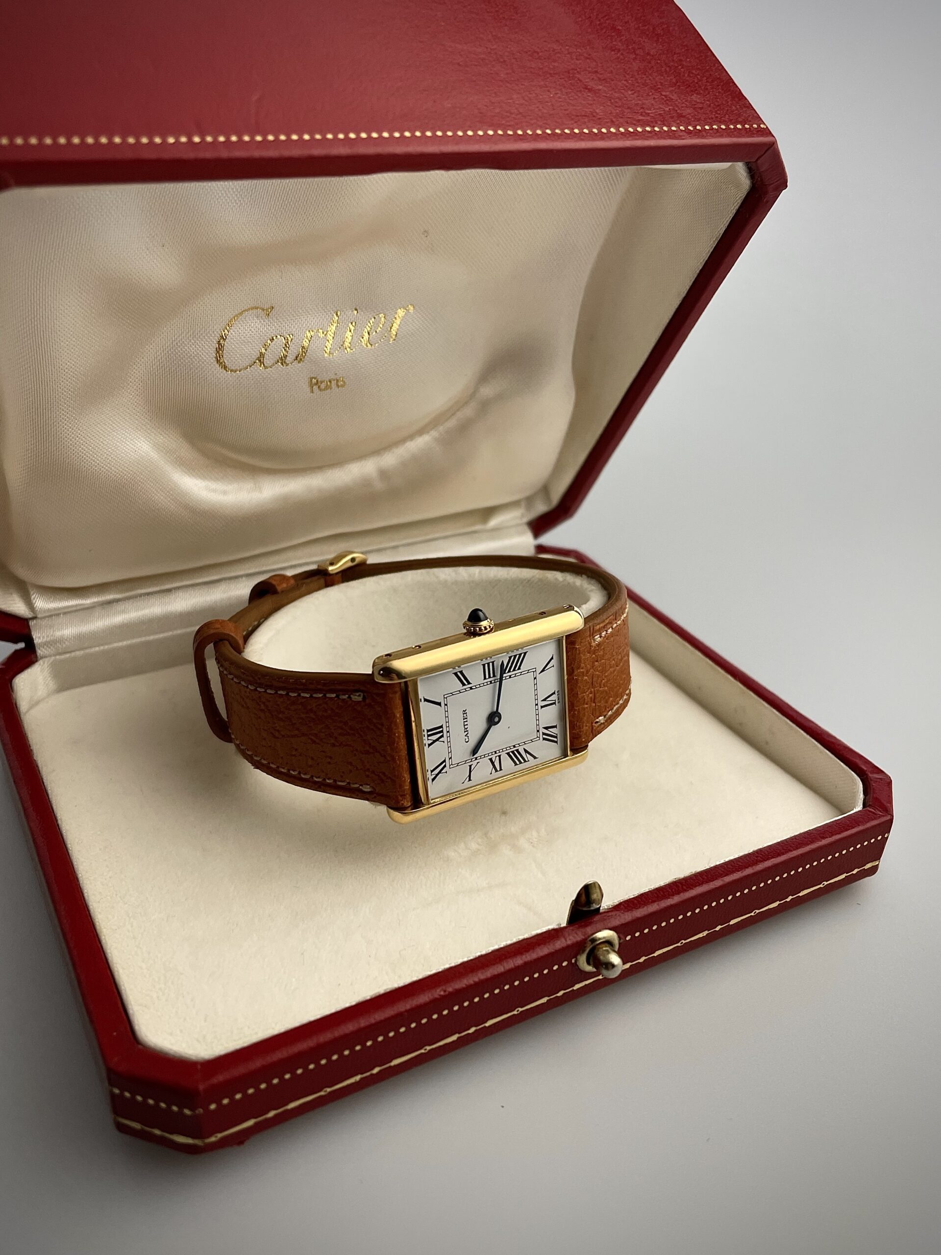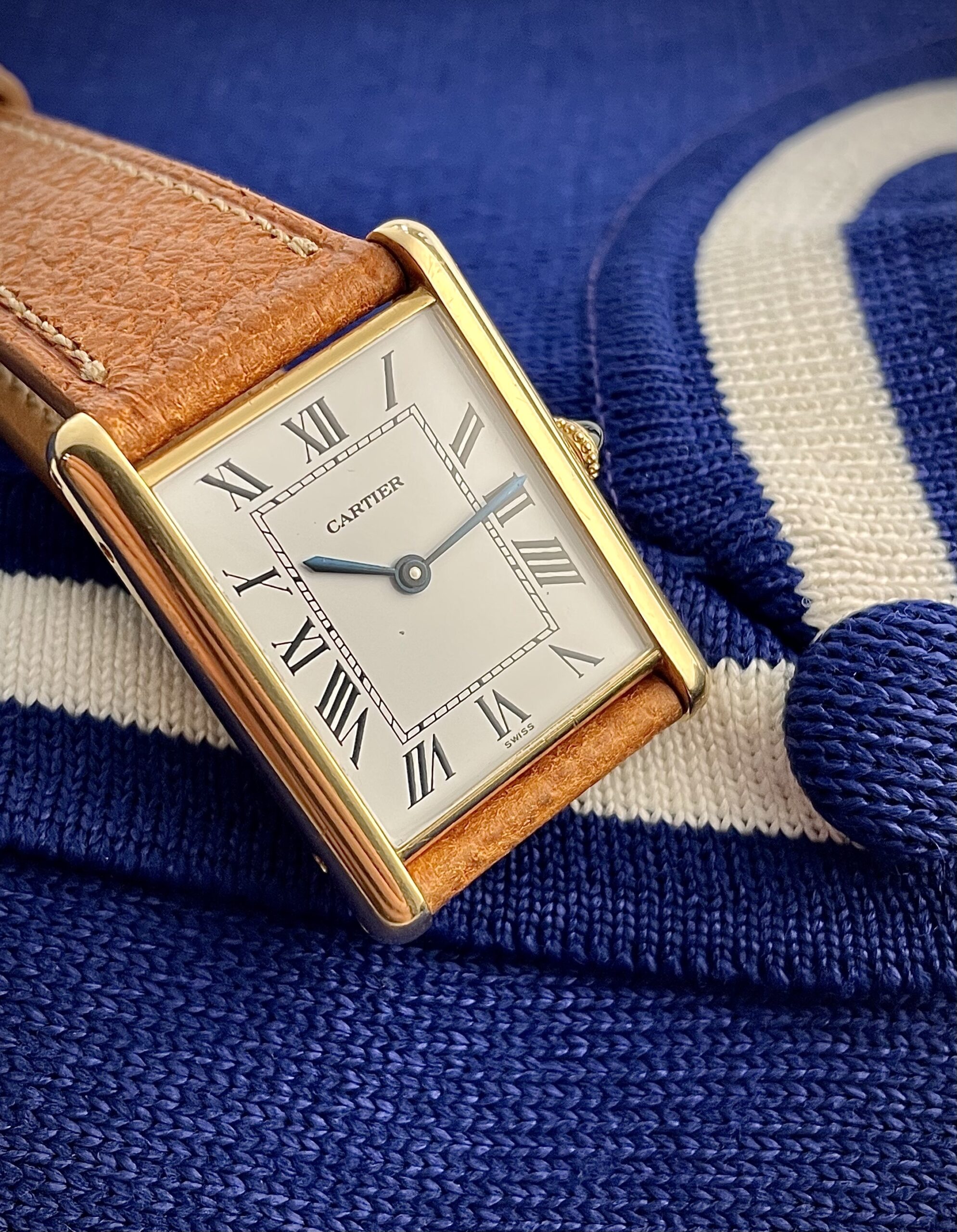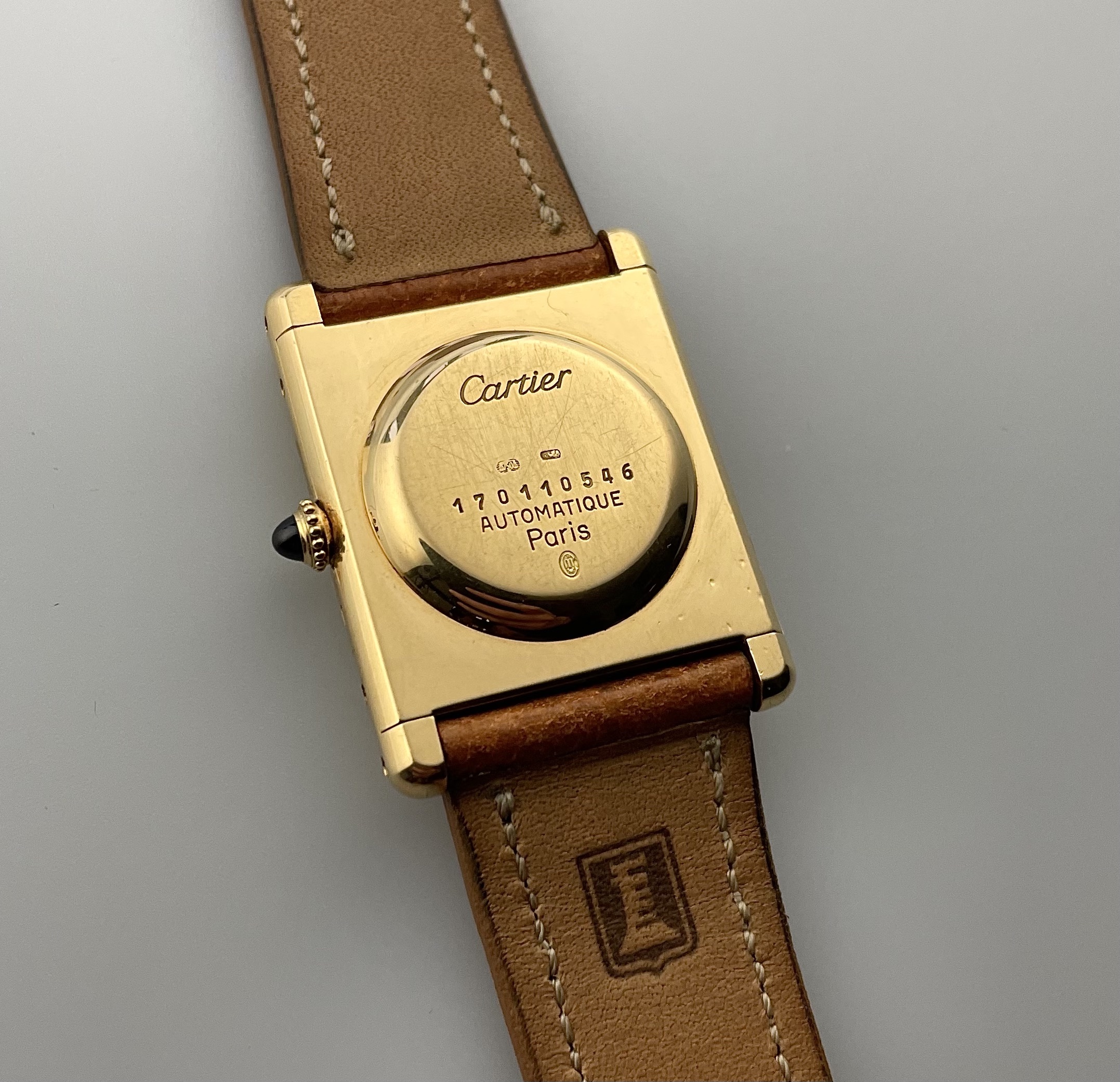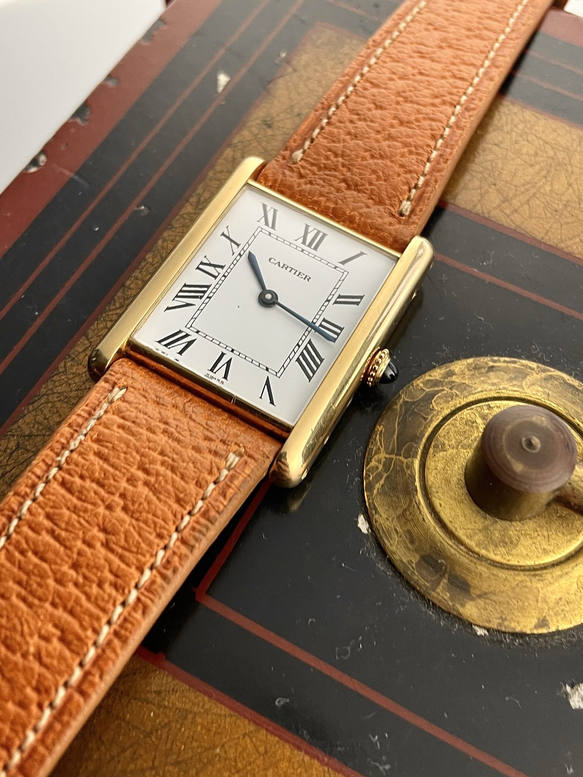 The watch is produced in yellow gold and has the iconic enamel roman numeral dial that make Cartier instantly recognizable. Furthermore it features a so called ‘Chemin de Fer’ minute track and blued steel sword hands, and ofcourse the sapphire set crown. This particular model features an automatic movement. By creating a small bubble on the caseback, the small case profile could be maintained. This watch has been produced in very low numbers and to find one in this condition is very rare. The watch comes on a vintage inspired pig skin strap handmade in Italy by the best artisan in the business. In addition there is the gold ardillon buckle.