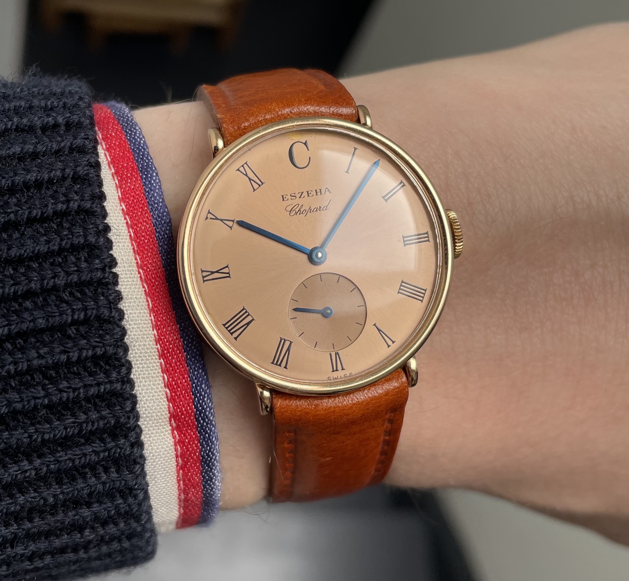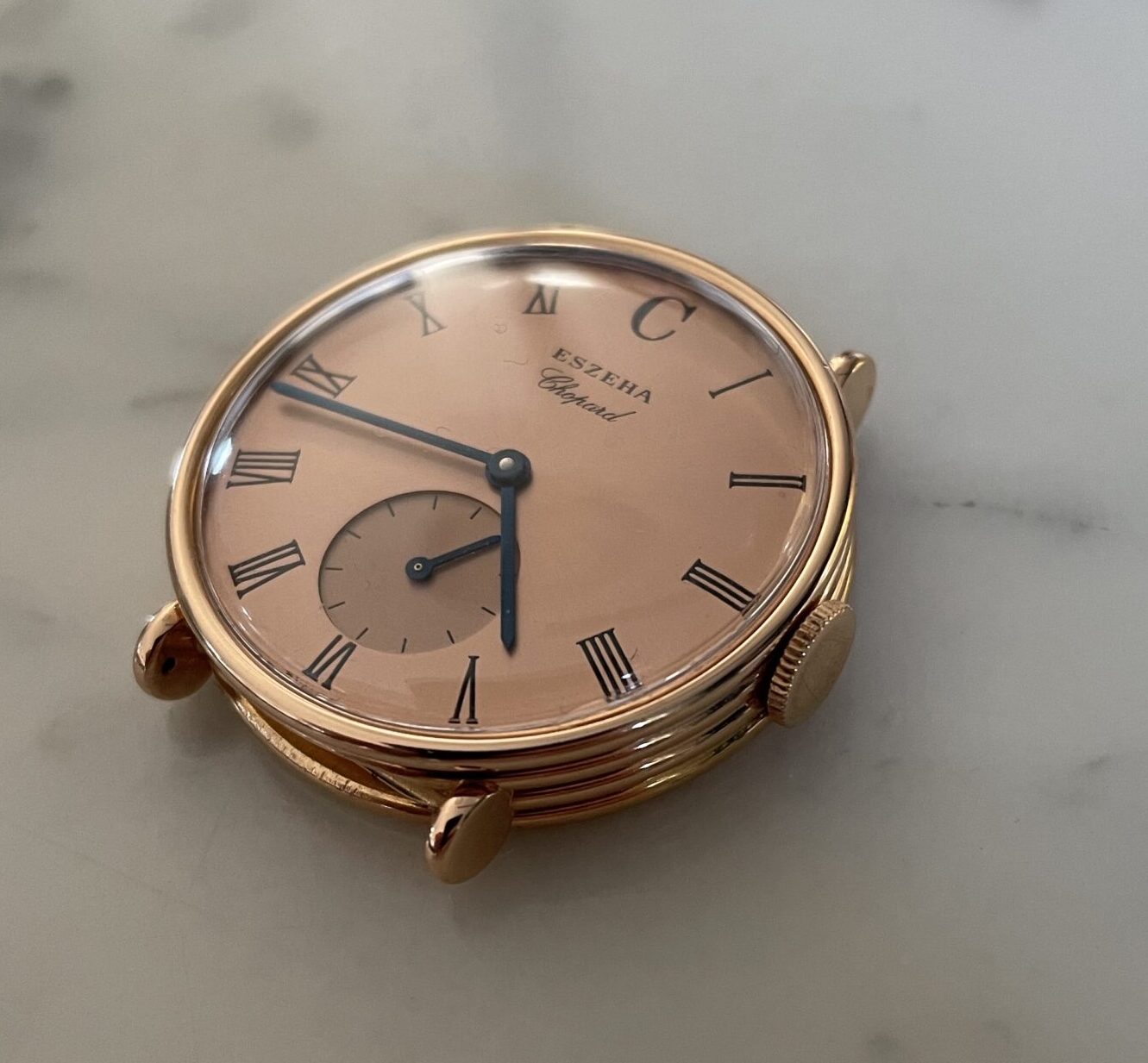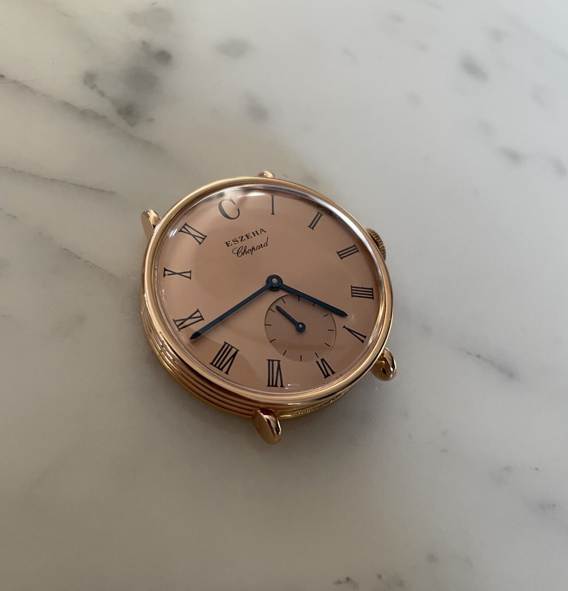 This is an incredibly rare model by chopard from 2004. In its appearance the watch feels more like a 1940’s gentleman wristwatch. Very classy sizing at 32mm across. Super interesting case design with ribbed case sides. The crown is executed in actual gold, which we almost never see, especially not in modern watchmaking. There are some post war french case wristwatches that also use gold crowns that were formed by hand. This seems to be an hommage to that craftsmanship. The level continues in the rose gold sunburst finished dial that is a perfect match to the case. With its subdial at 6 and blued steel hands the watch has a traditional feel to it. Eszeha is a case manufacturer that worked closely with Chopard for several decades. This watch was a celebration of that collaboration as both turned 100 years old in 2004. I would not be surprised if the watch is based of an historic case the company produced .