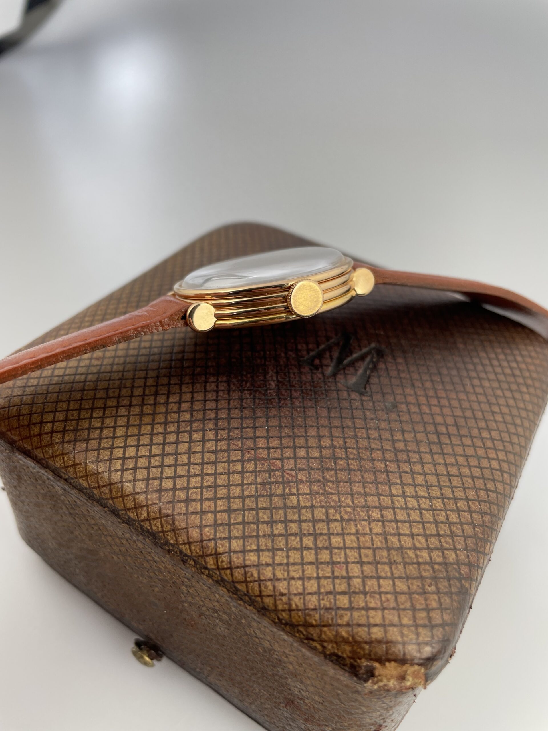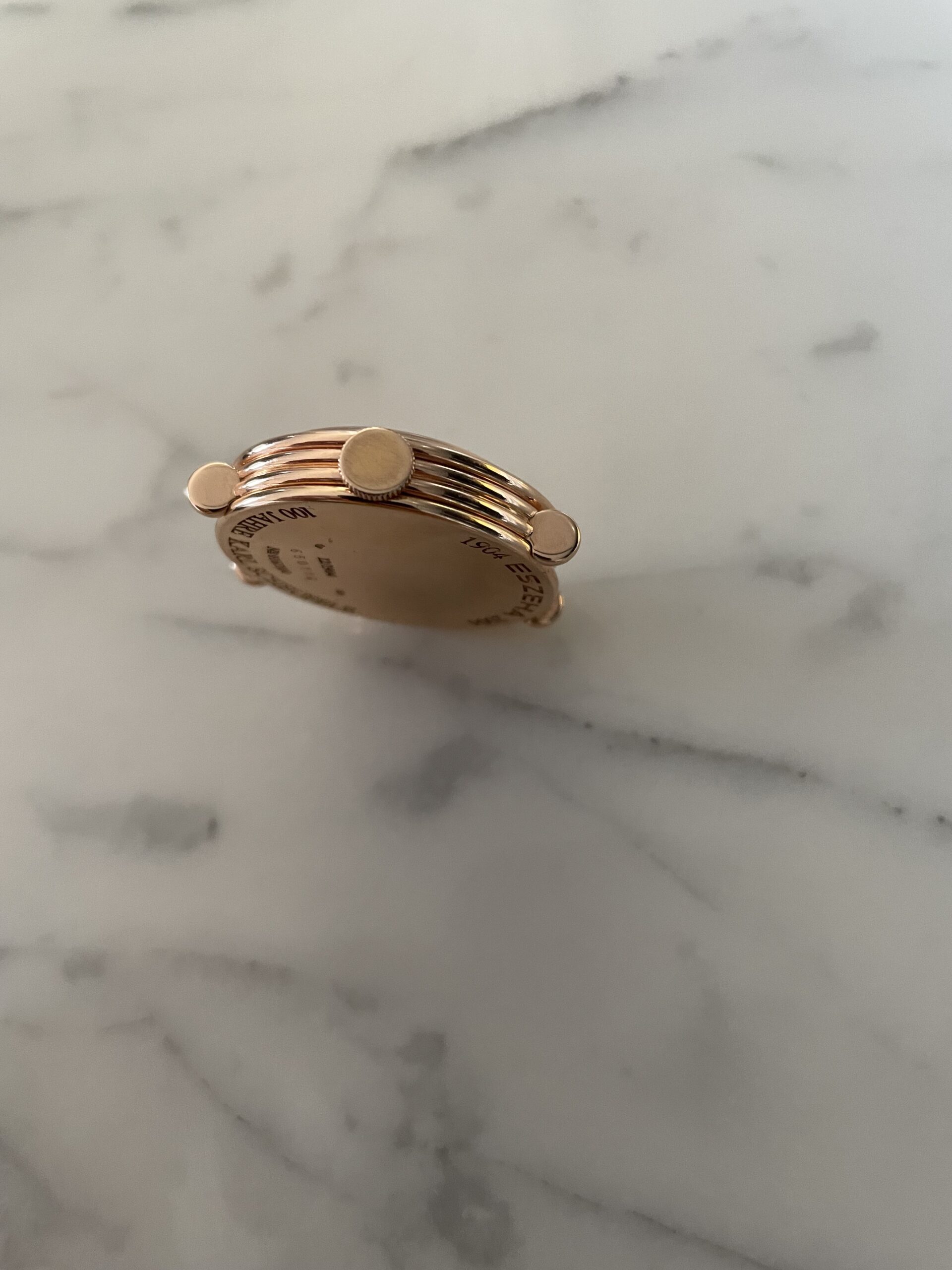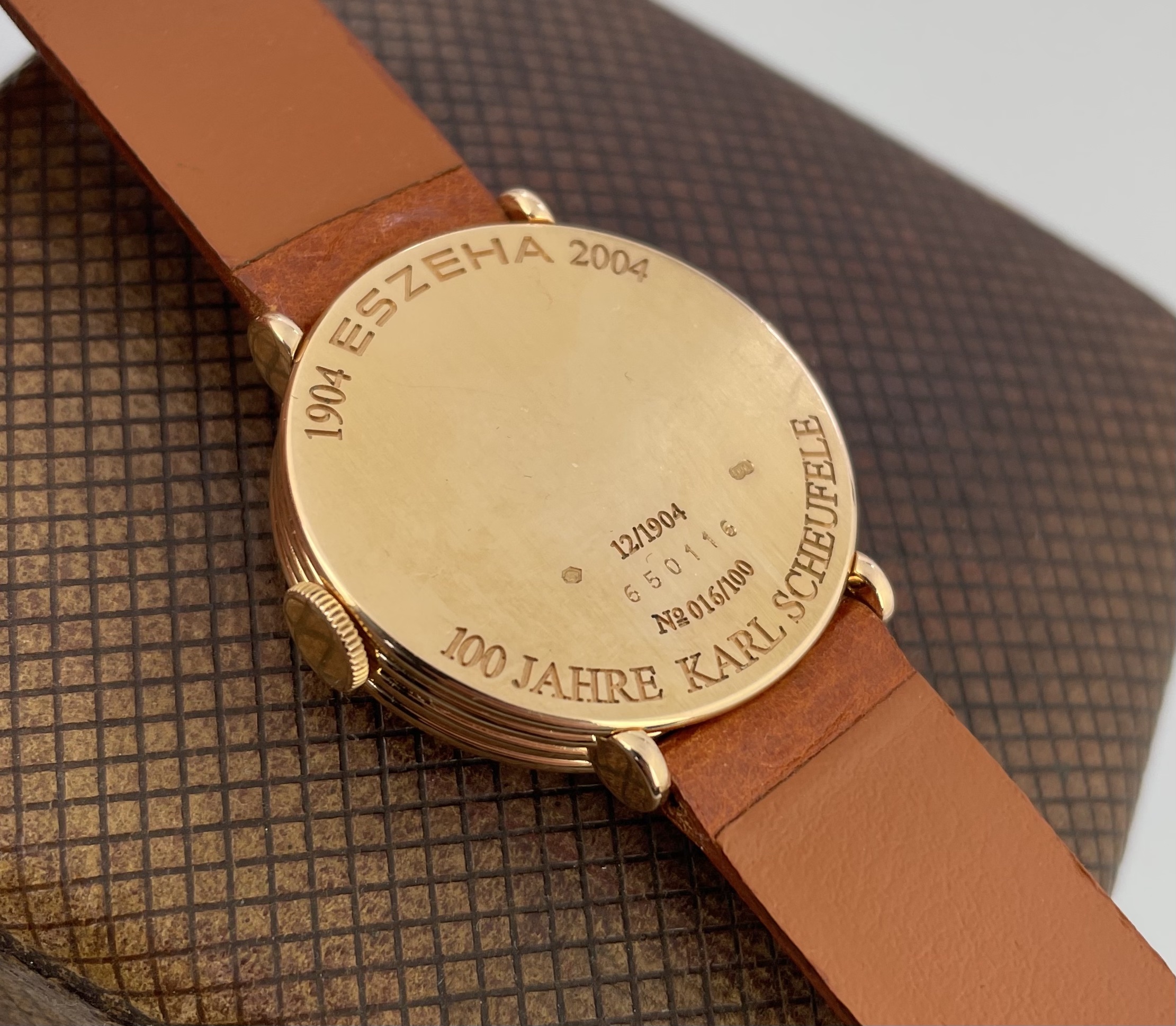 This is an incredibly rare model by chopard from 2004. In its appearance the watch feels more like a 1940’s gentleman wristwatch. Very classy sizing at 32mm across. Super interesting case design with ribbed case sides. The crown is executed in actual gold, which we almost never see, especially not in modern watchmaking. There are some post war french case wristwatches that also use gold crowns that were formed by hand. This seems to be an hommage to that craftsmanship. The level continues in the rose gold sunburst finished dial that is a perfect match to the case. With its subdial at 6 and blued steel hands the watch has a traditional feel to it. Eszeha is a case manufacturer that worked closely with Chopard for several decades. This watch was a celebration of that collaboration as both turned 100 years old in 2004. I would not be surprised if the watch is based of an historic case the company produced .