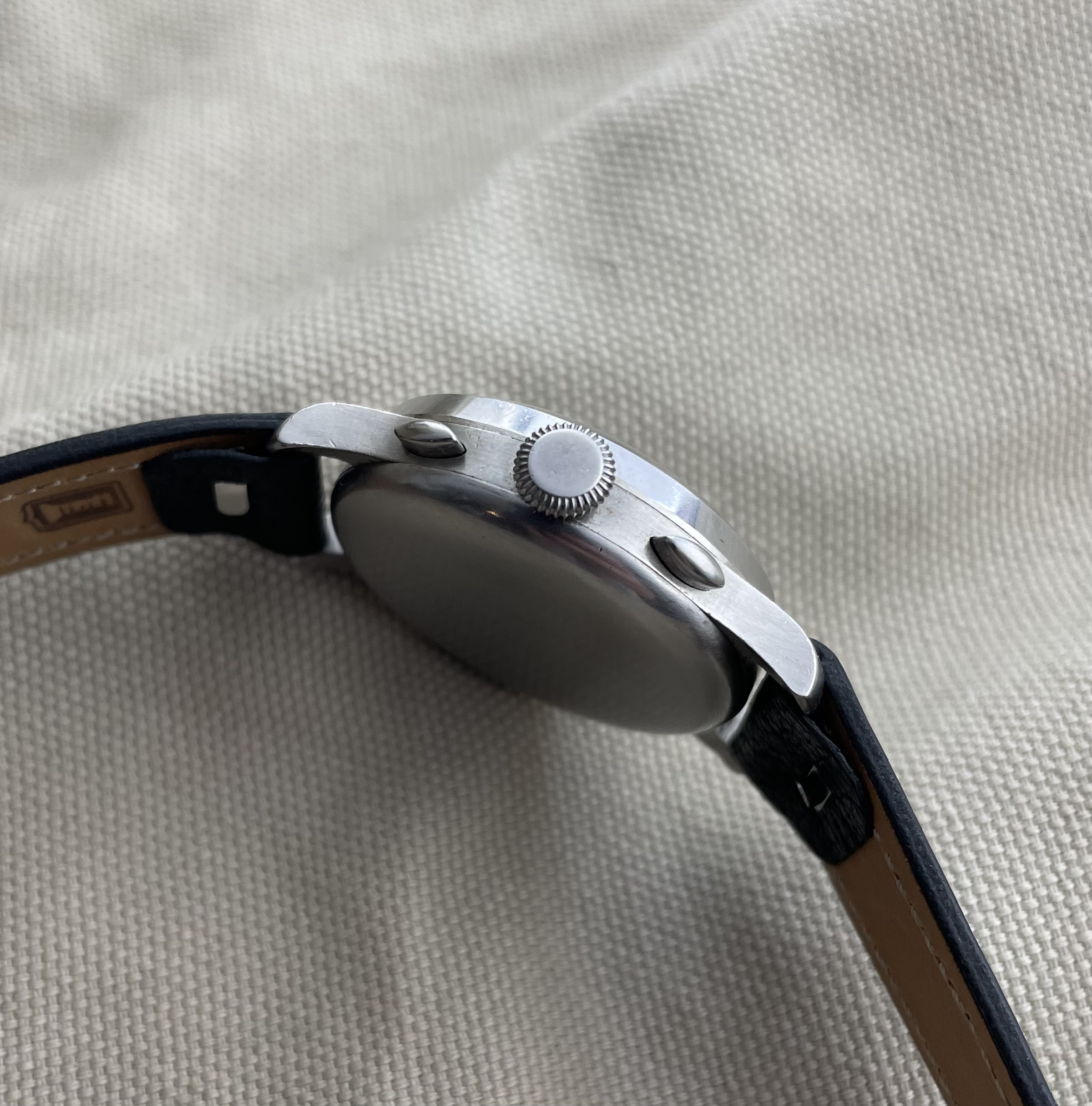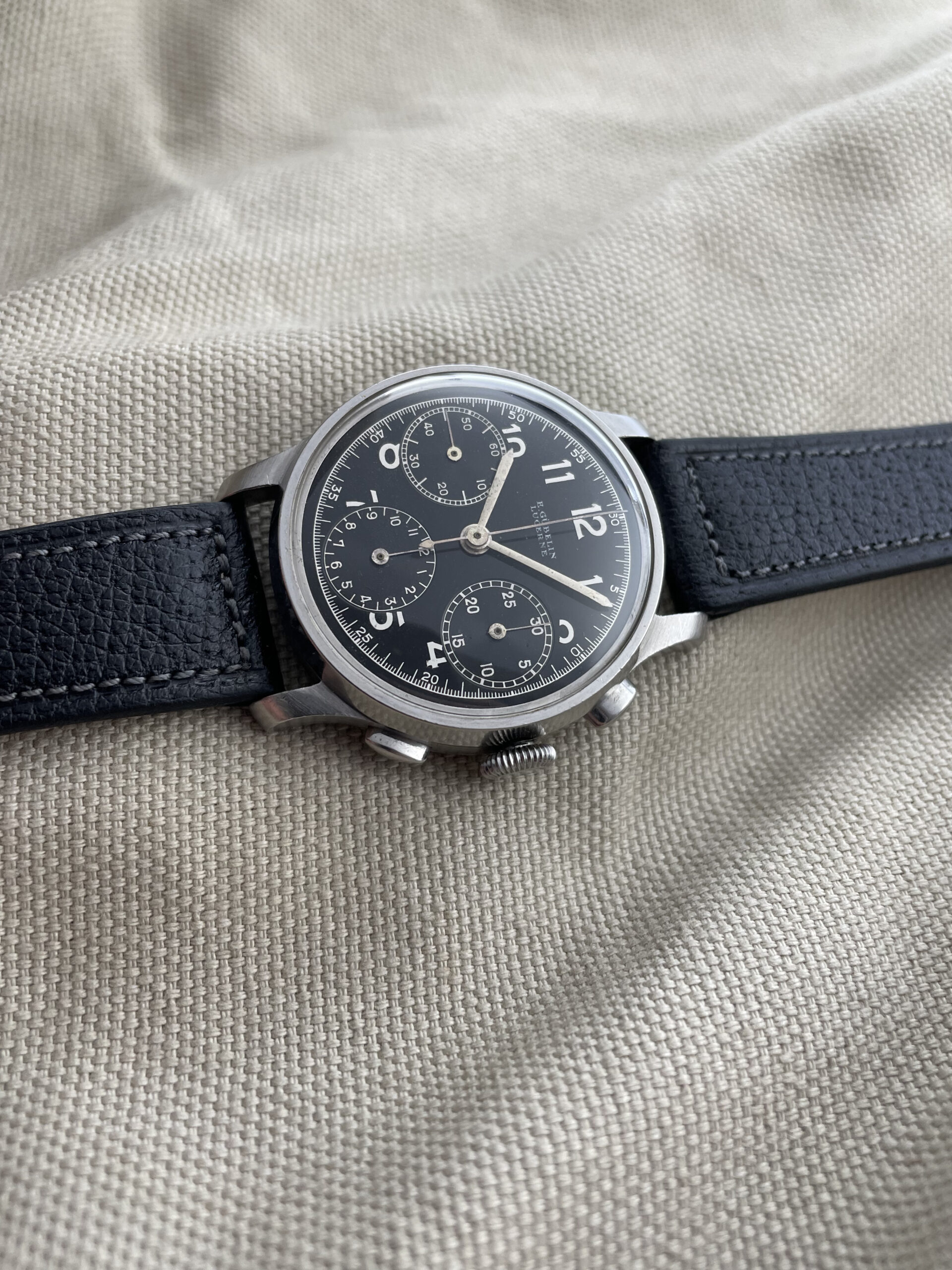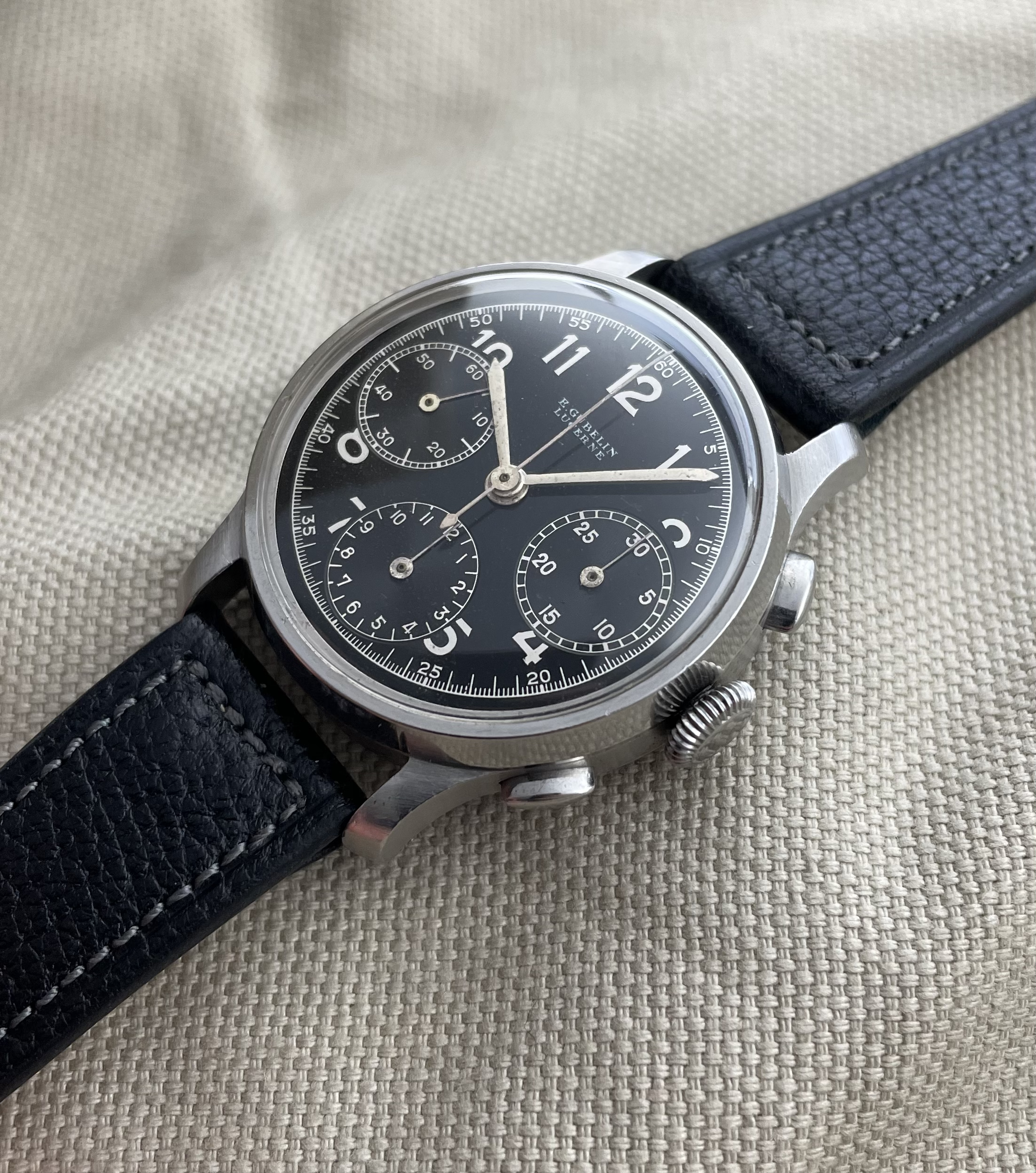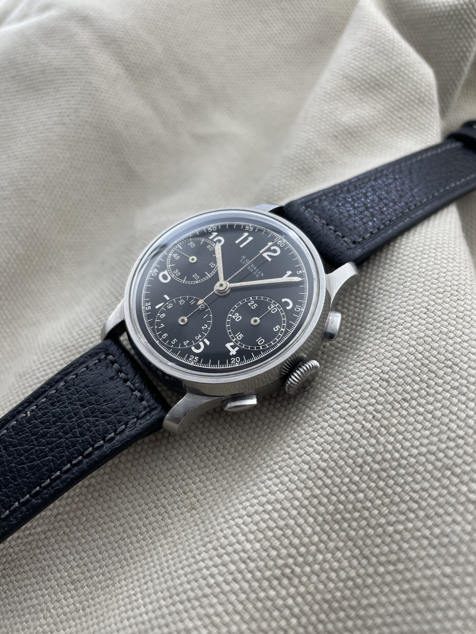 This might be the ultimate 1940’s chronograph. Gu belin is known for its incredible quality pieces and this one is no exception. The black dial is seemingly unique and combined with the white text and hands it offers a unique and minimalistic look. The dial is flawless and has a fantastic glossy finish. The watch bears the traditional E. Gübelin Lucerne signature, which is stunning. The condition of the 35mm staybrite case is outstanding. Super sharp and unpolished, with nice thick and angular lugs. The teardrop pushers and rounded original crown finish the look. Inside is a gorgeous unmolested valjoux caliber 84, running strong. The watch comes on its original strap, with a very cool buckle. The strap is very dry and brittle, but it is a testament to the originality of the piece. This is the sort of piece you can only buy once. No more words are needed here, it is perfect.