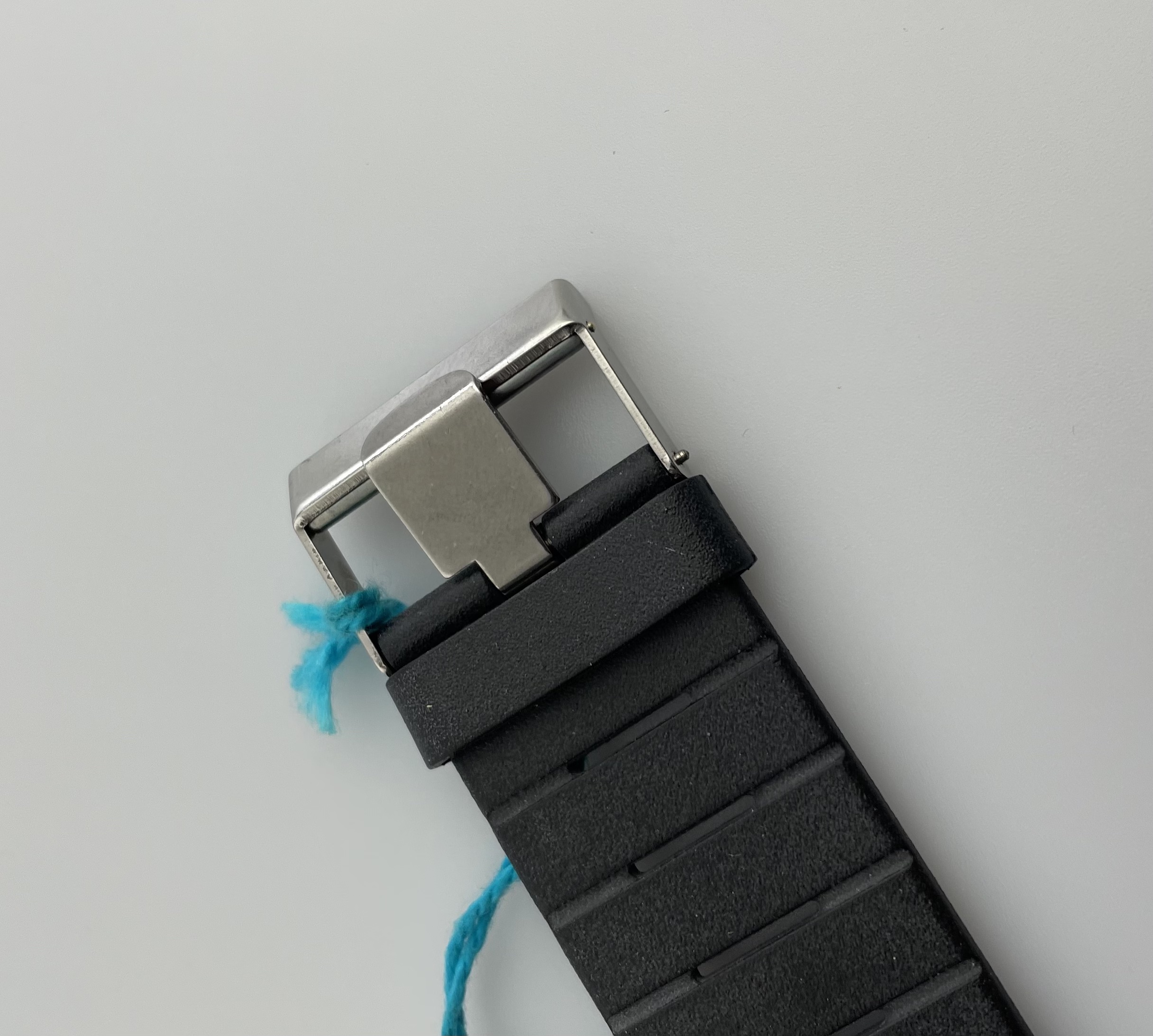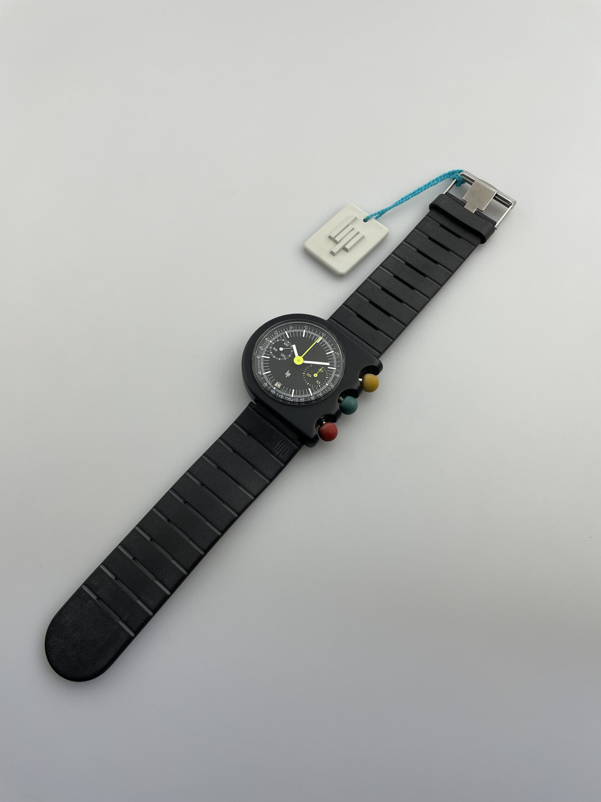 This is the original LIP Mach 2000 designed by Roger Tallon in the early 1970’s. Among other important designs, he is known as the designer of the high speed TGV train. This particular model runs on a handwound Valjoux 7734 movement, which was only produced for a very short time period in the 1970’s. This currently seems to be the only all original example in the market with the characteristic coloured buttons and crown. Another version with black buttons is more commonly seen. The condition of this piece is amazing. There is no imperfections to be found apart from some discoloration of the colored buttons, which we always see on this model. In my opinion it adds some charm and age to the watch and clearly distinguishes it from the modern quartz reissues. The anodized aluminum case is untouched and it comes with its original hangtag with the impressive LIP design logo.