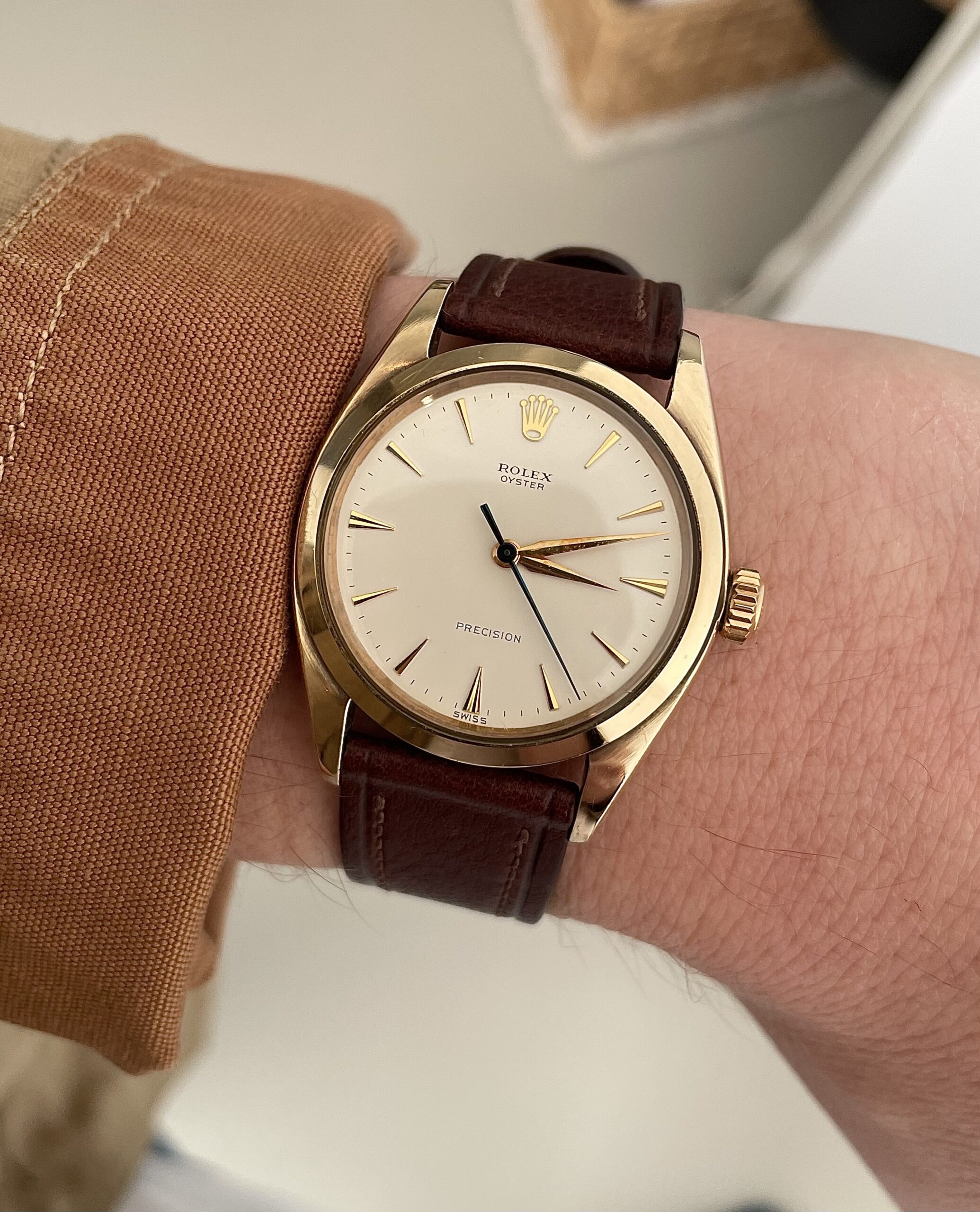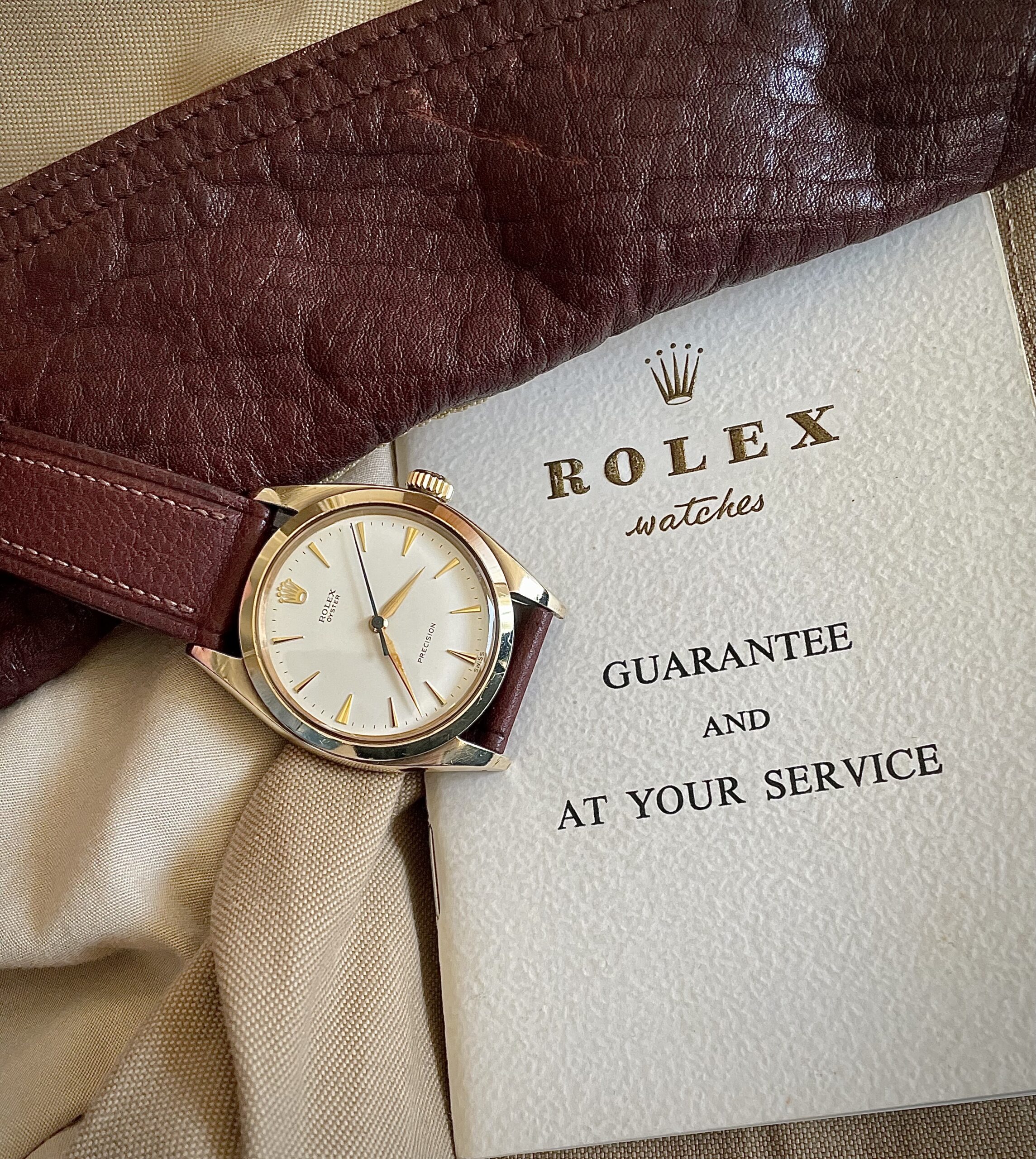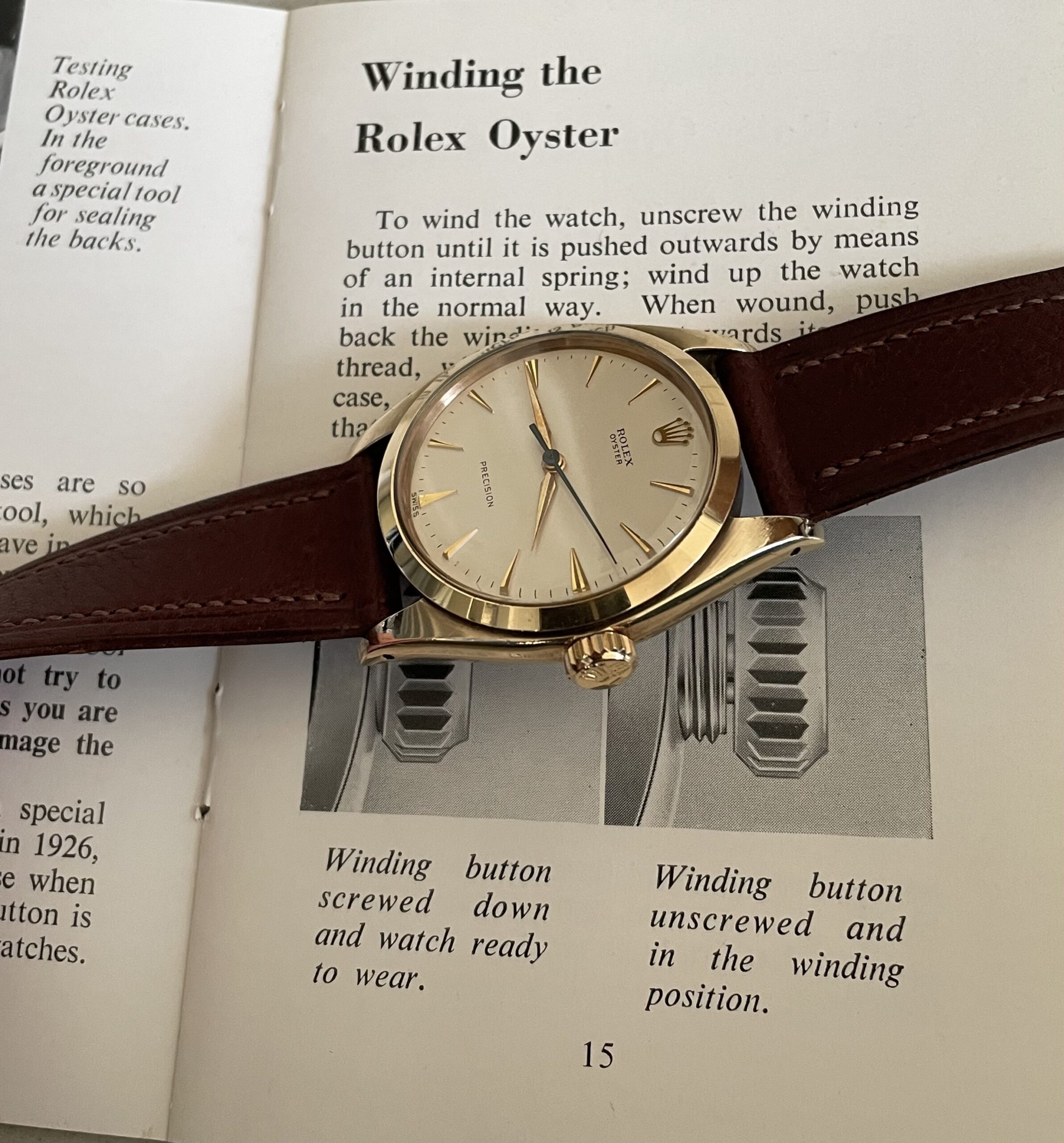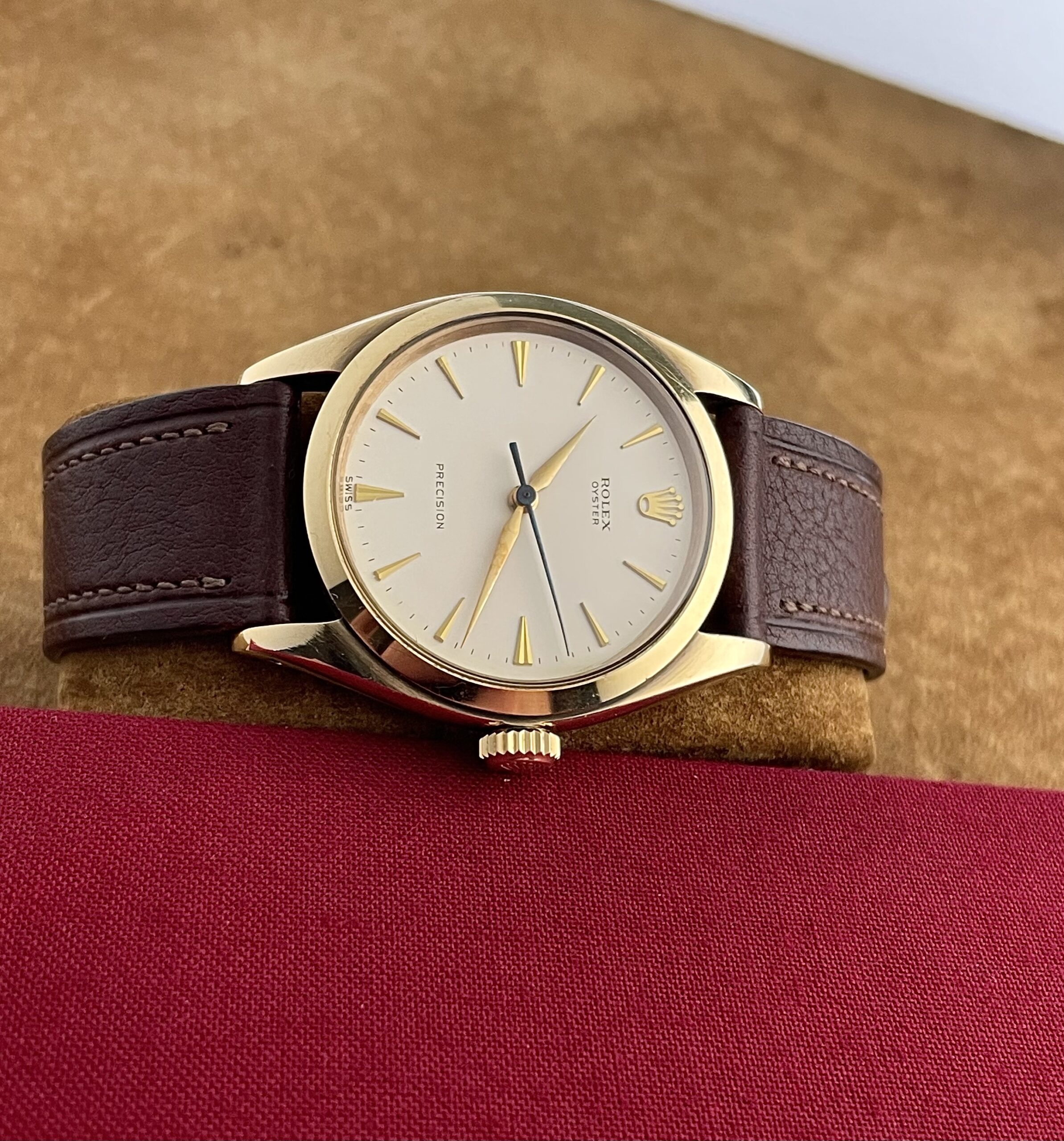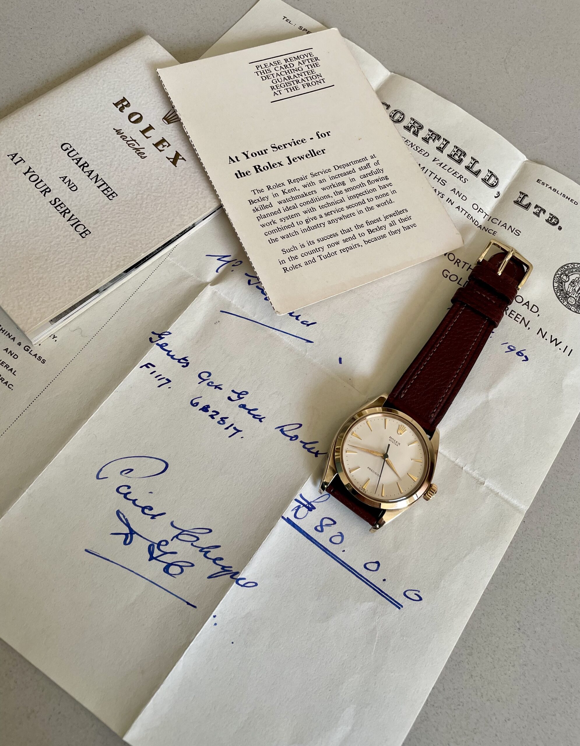 The case is produced in 9k yellow gold for the english market and has not been polished. It has a acquired a warm deep yellow patina. The watch comes on a gorgeous brown handmade strap. It is a full set, including its original box and paperwork.