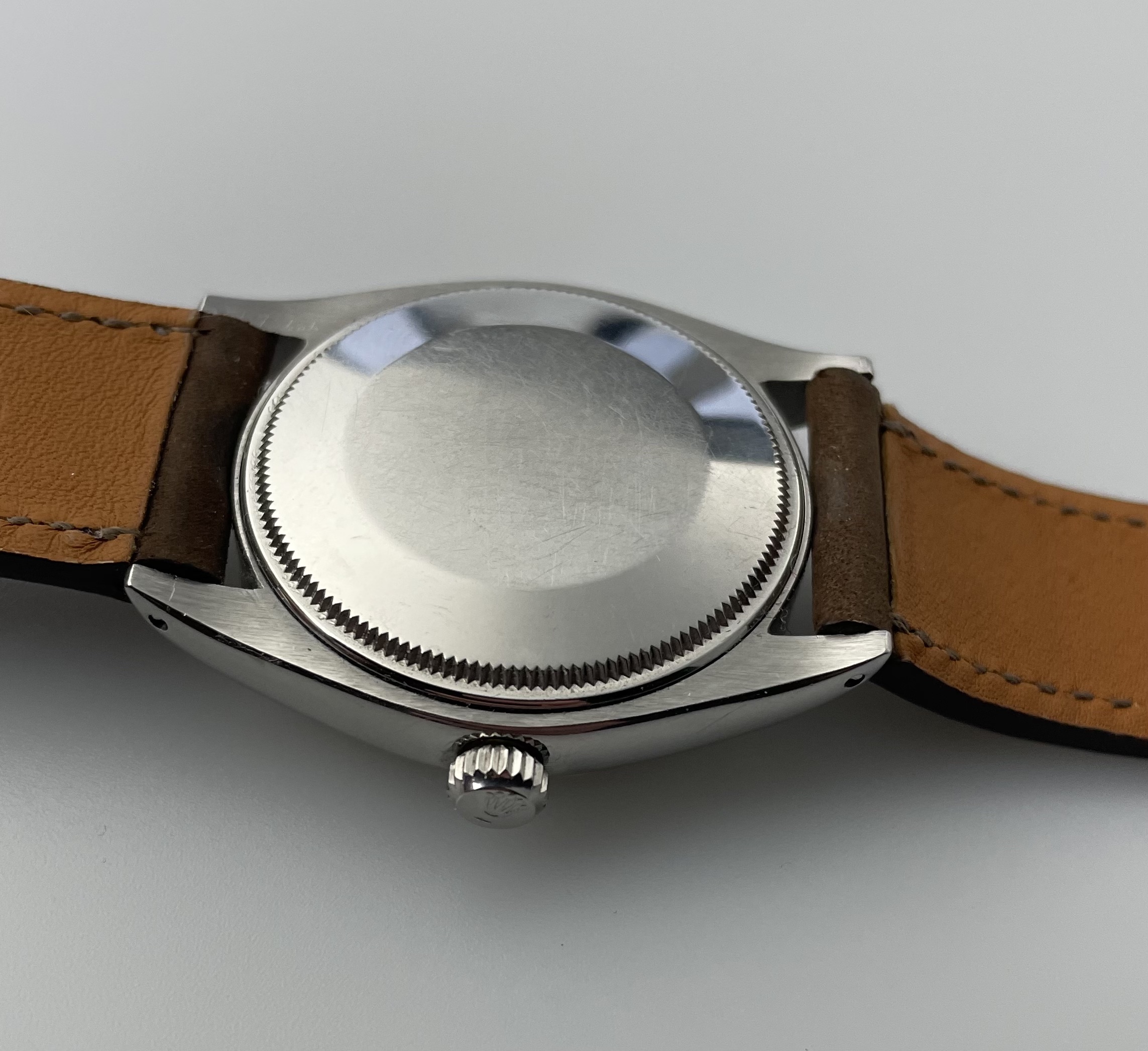 The automatic movement comes in incredibly shape and runs perfect. It features the so called butterfly rotor. On the backside we also see the original horizontal brushed case finish. It comes on a brown nubuck strap that fits the robust, yet classy look. This simply is a great, honest and unusual example of the famous Rolex Air King.
