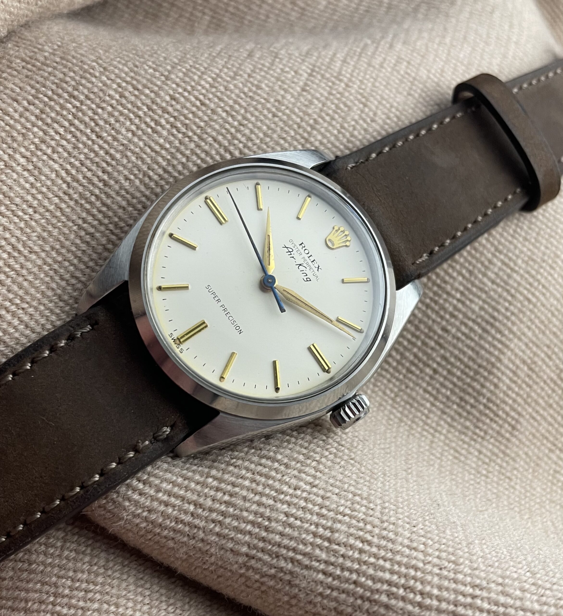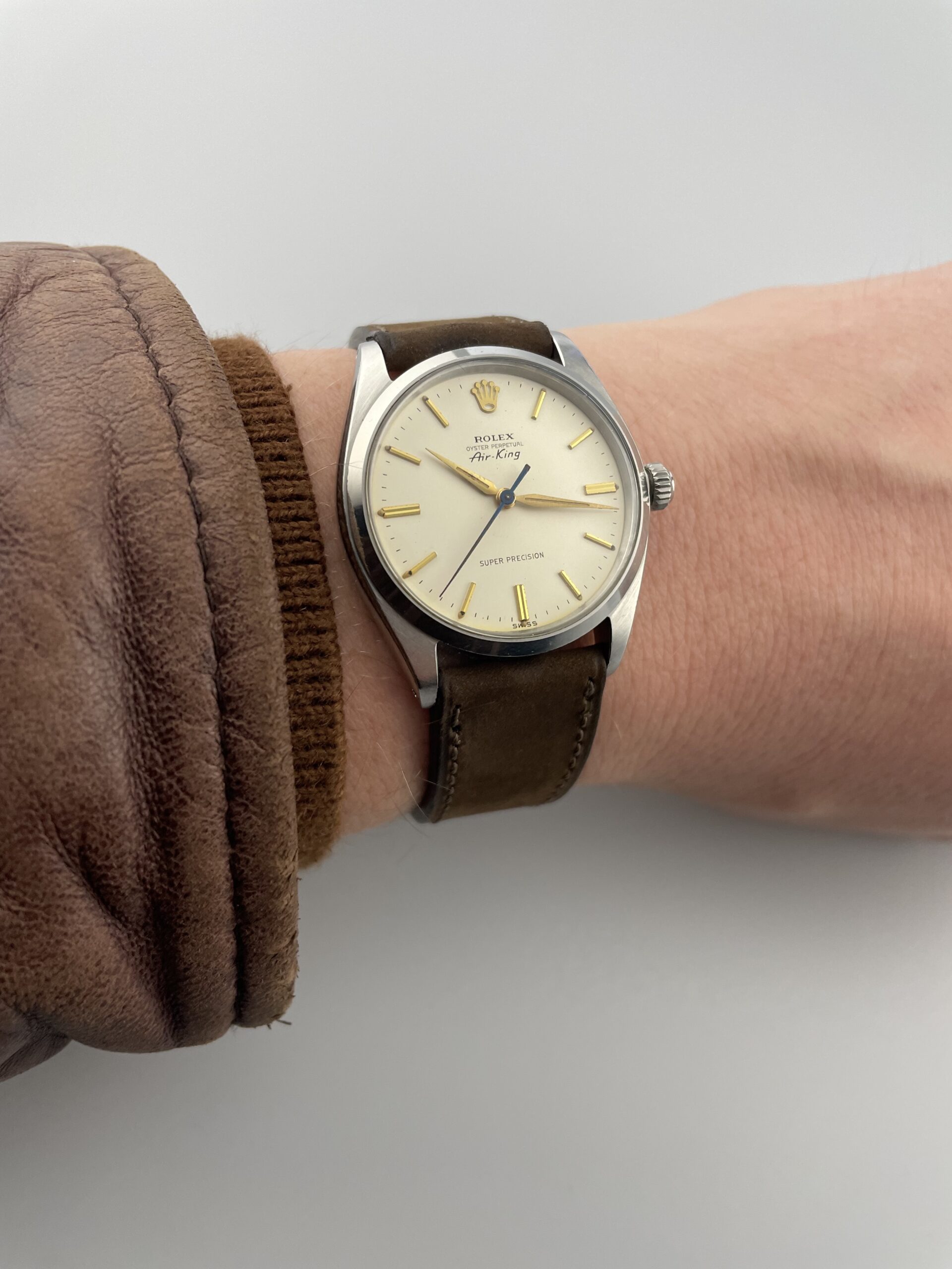 To us at perceptions, this is one of those early Rolex watches that just ticks all the boxes. Of course everyone is familiar with the datejusts and submariners. Our interest in Rolex is in the outliers, the ones that are just a little more peculiar and unique. Here we present a Rolex Air King 5500, and not just any 5500. This early model from 1961 has a lot of interesting features. Its 34mm steel case has not been polished and therefore has a strong and sharp presence. It’s dial is a glossy eggshell colour that we see on some Rolex models around 1960, which creates a very vivid dial. It has an applied gold coloured logo and indexes and beautiful alpha hands. The seconds hand is in blued steel, which gives a little extra vintage charm. It has the designation super precision on the dial, which makes it a little rarer than the regular version. At six o’clock we see the swiss signature, which indicates the watch still has radium lume. This radium lume is fully intact and has acquired a beautiful even patina.