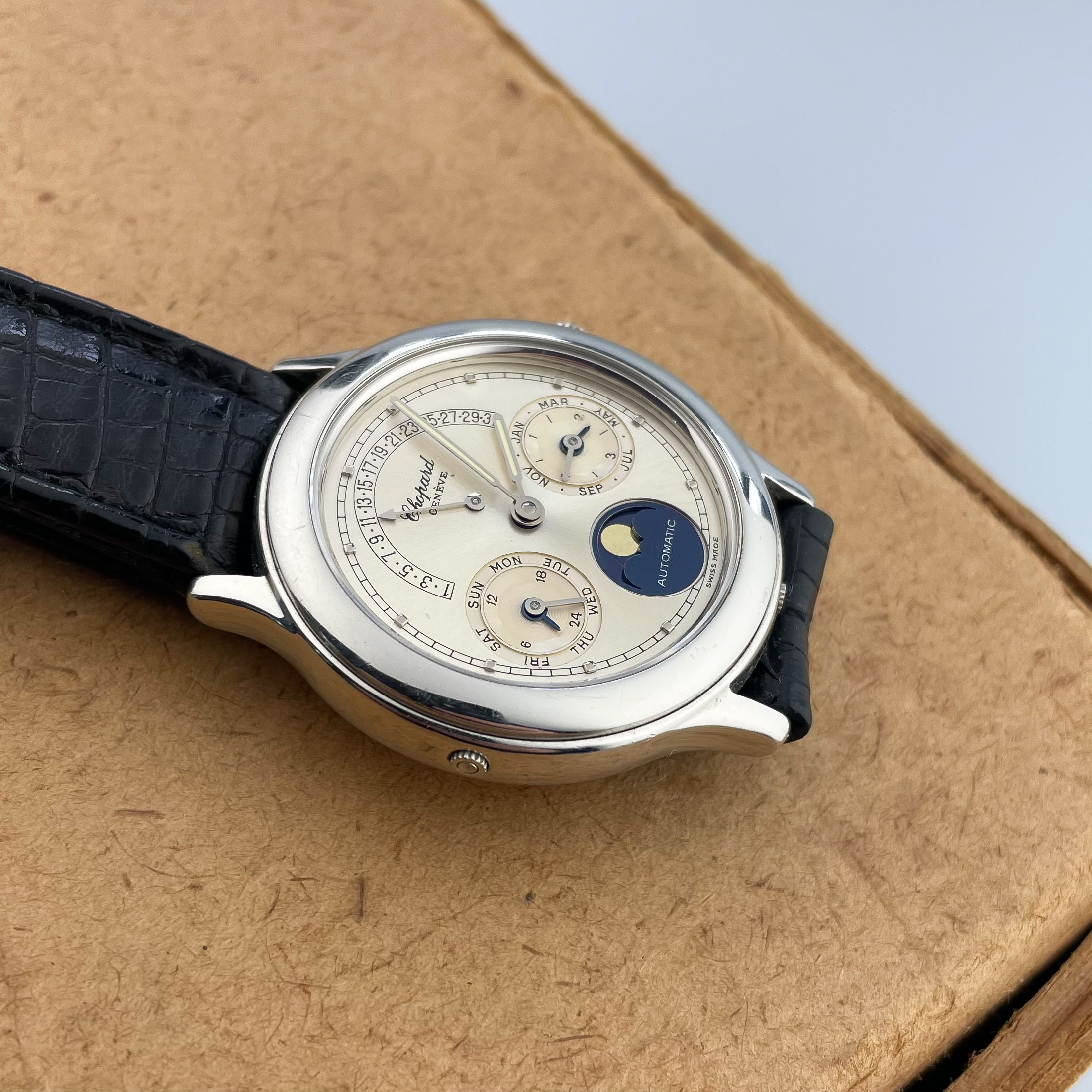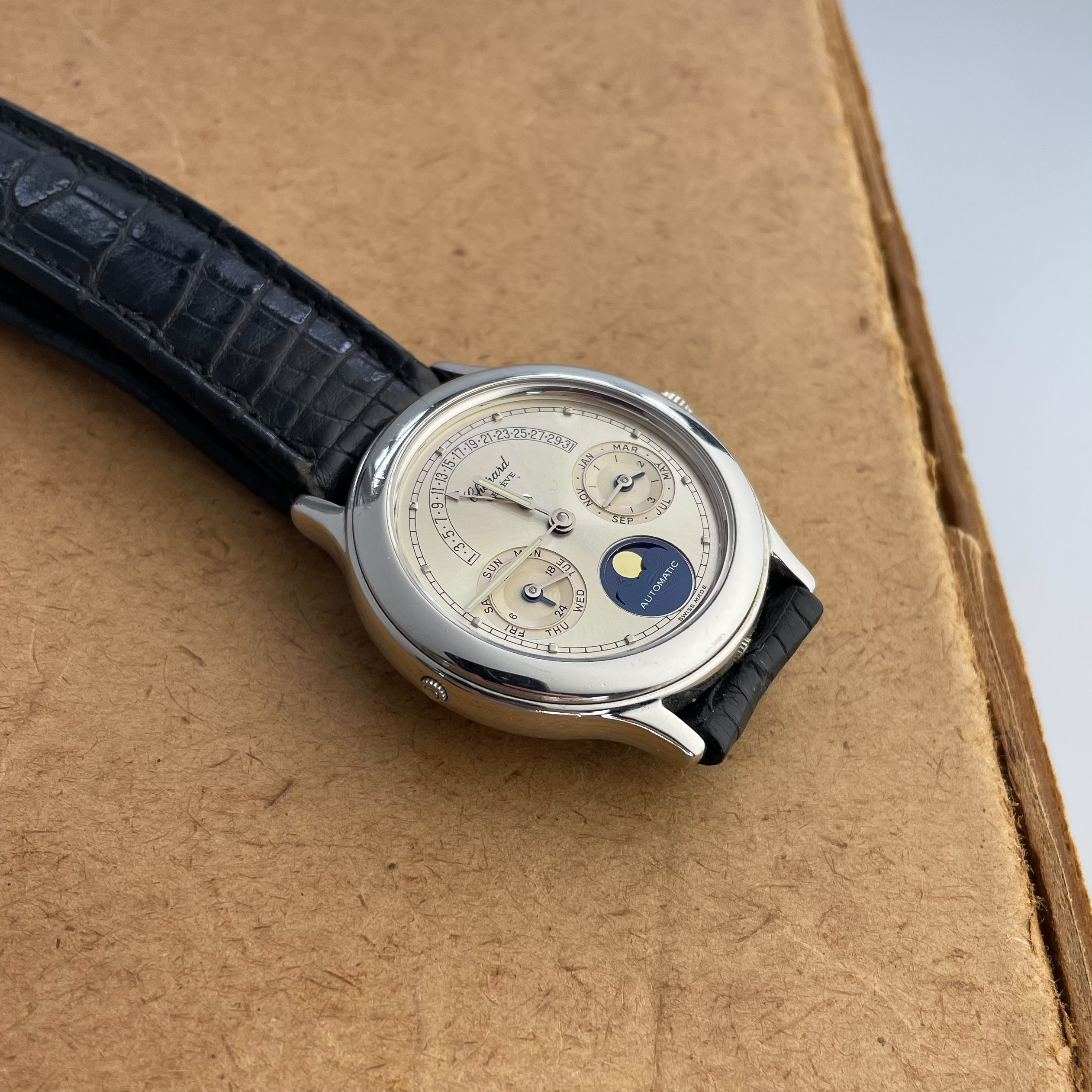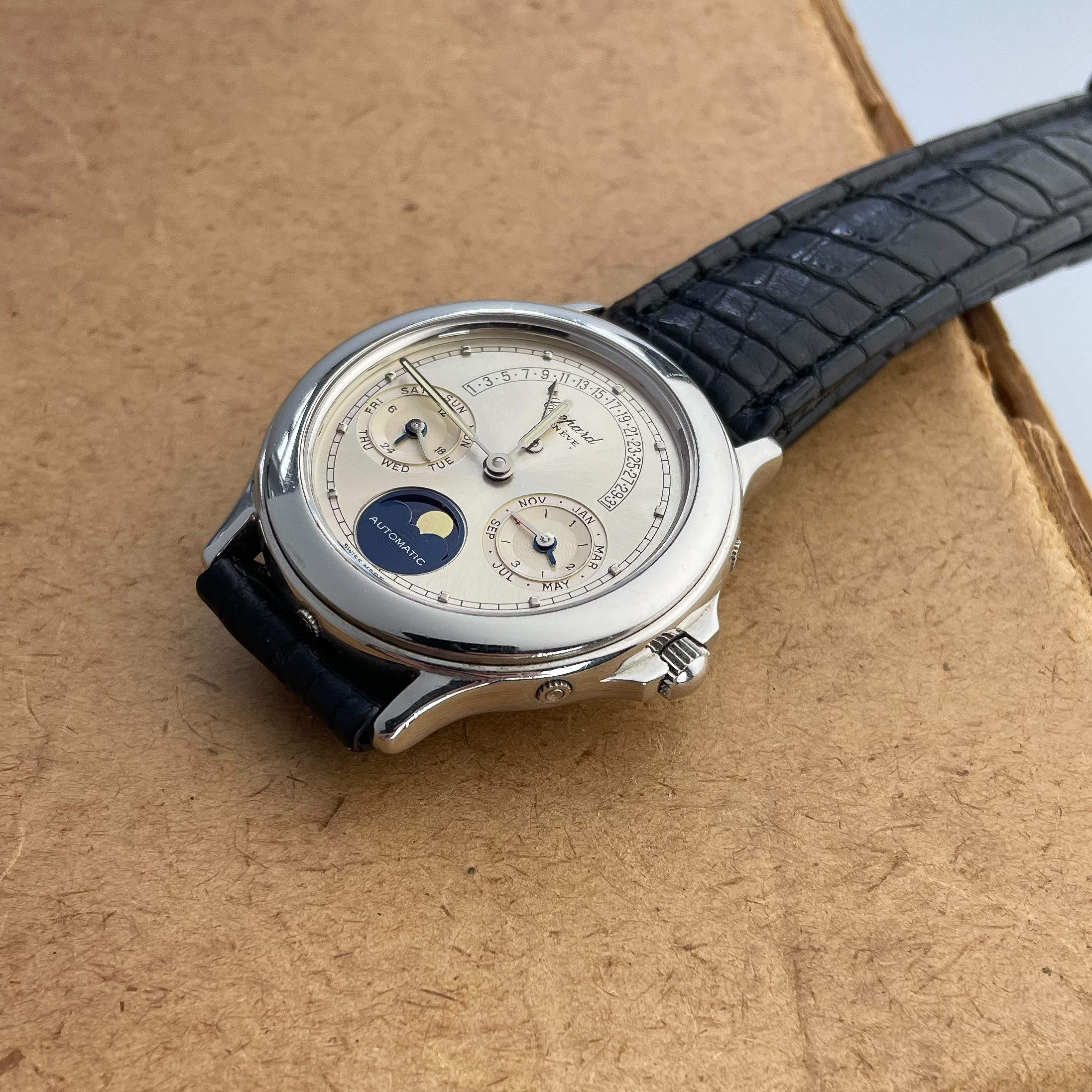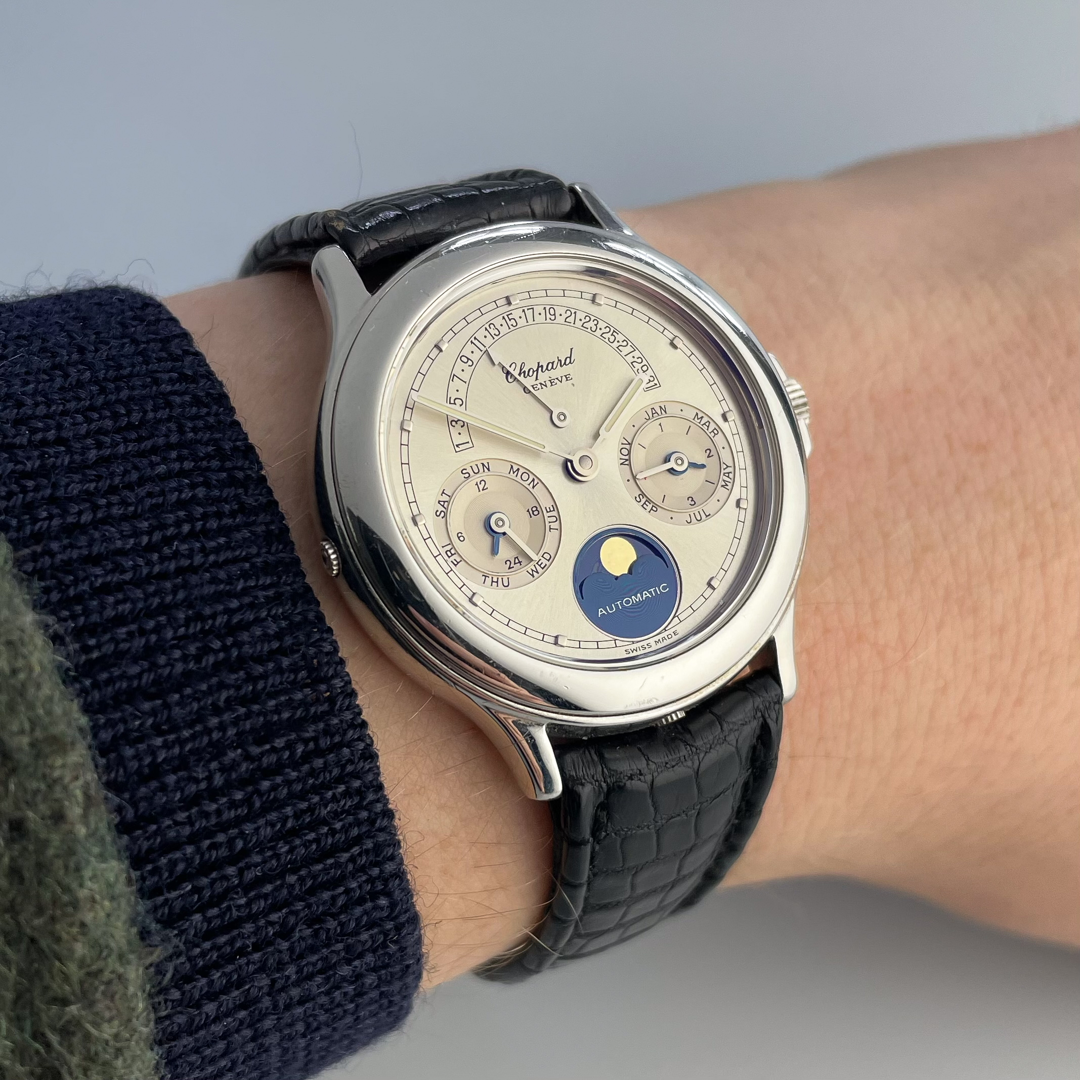 This Svend Andersen Chopard perpetual calendar with retrograde date from the 1990’s is an absolute neo vintage rarity. Limited to just 100 pieces, this platinum execution was the absolute top of Chopard’s offerings in the 1990’s. Its 36mm case is extremely heavy and has a pleasant rounded shape to it. This particular example is unpolished and has not seen much wear over its lifetime. There is some small imperfections, but overall the watch comes in collector condition. What makes this watch unique is that it combines the perpetual calendar complication with a retrograde date. Which is then housed in an almost sporty looking case. This sporty look is further enhanced by the lume filled hands. Also, it has a screw down crown and case back and the watch was waterproof when it was first sold. It is rather impressive to have a platinum perpetual calendar that can withstand water. Normally they would not travel outside ceo offices and cocktail parties. The design of the movement is by legendary watchmaker Svend Andersen and has his DNA all over it. You can read more on detail about the watch design and history here. If you compare this to his Andersen’s work, his influence is undeniable. This particular example comes on its original alligator strap with platinum buckle. The strap is missing on most examples that have been on the market, but it is interesting to see that its design matches that of the case which elevates the overall look. The quality of the dial is incredible with a sunburst finish and incredible depth to the sub dials. The feel of the platinum on it is just amazing. If you would like to know more about this Svend Andersen Chopard, please send us a message. This is an incredible value proposition in today’s market. Given the limited production and the involvement of a highly praised watchmaker such as Svend Andersen.