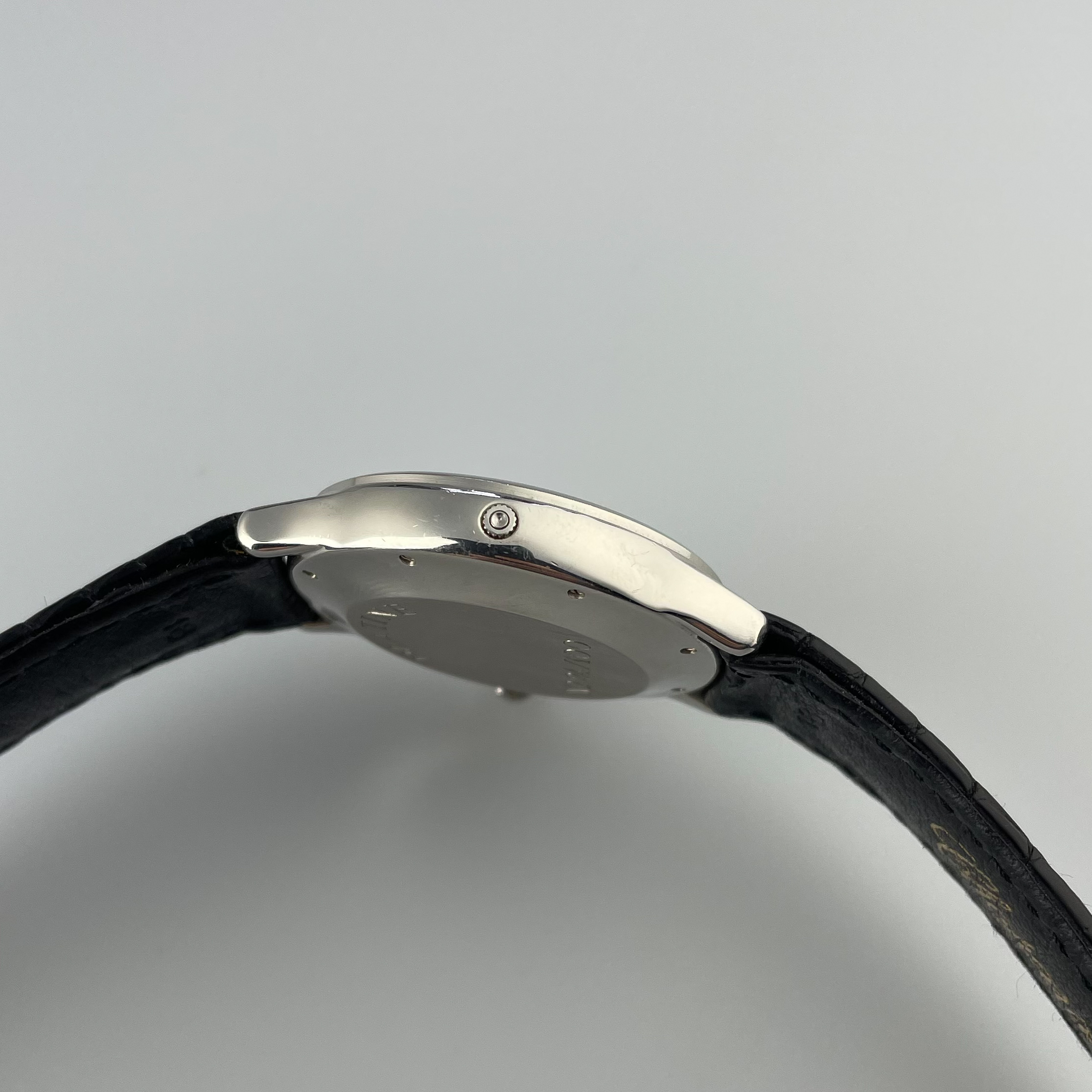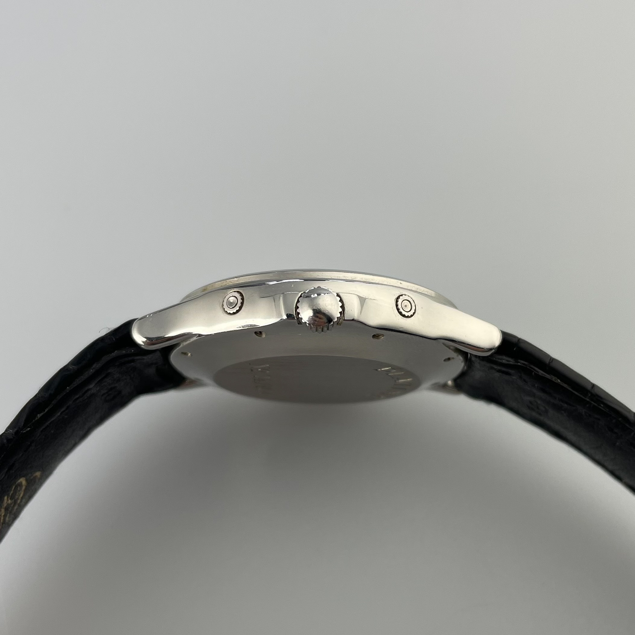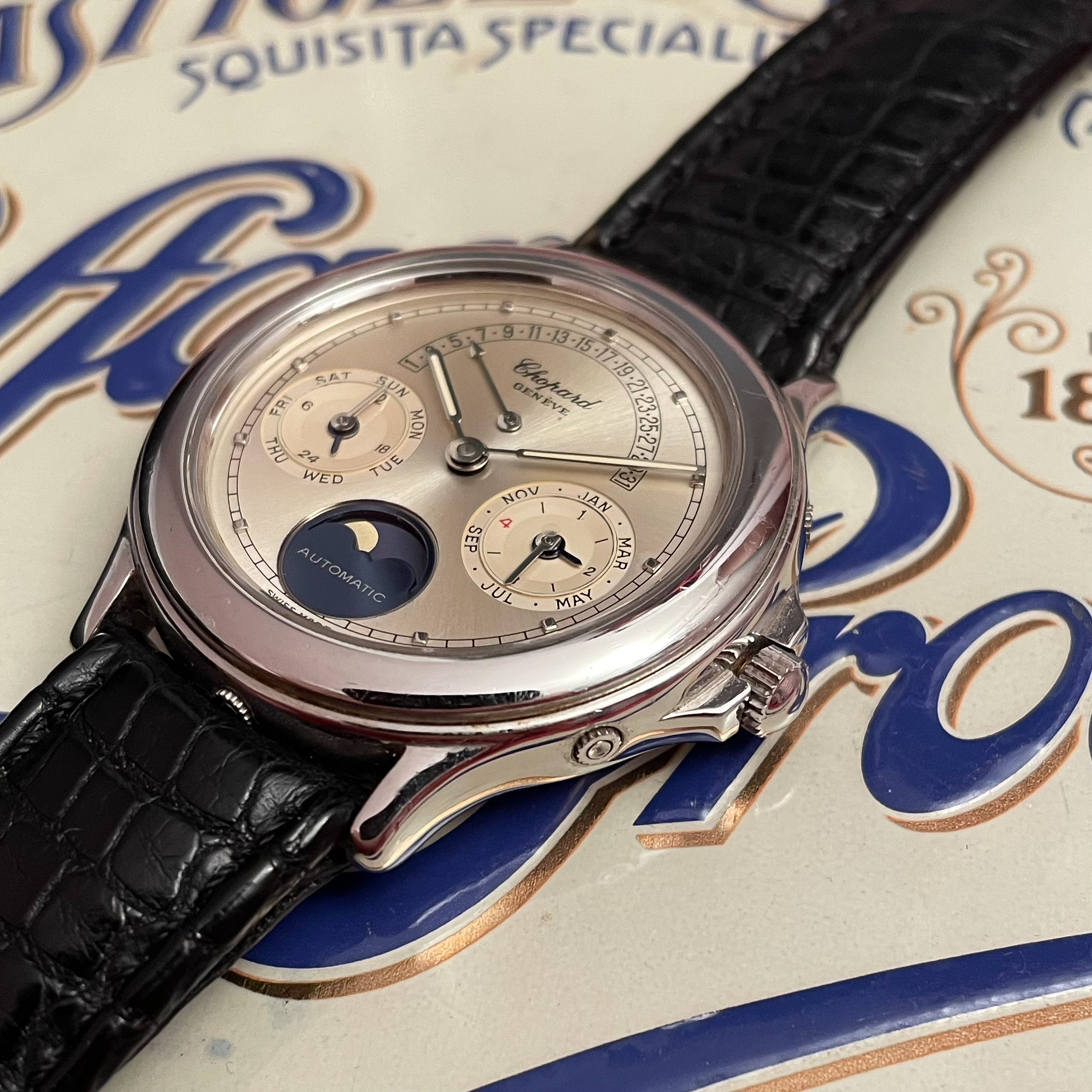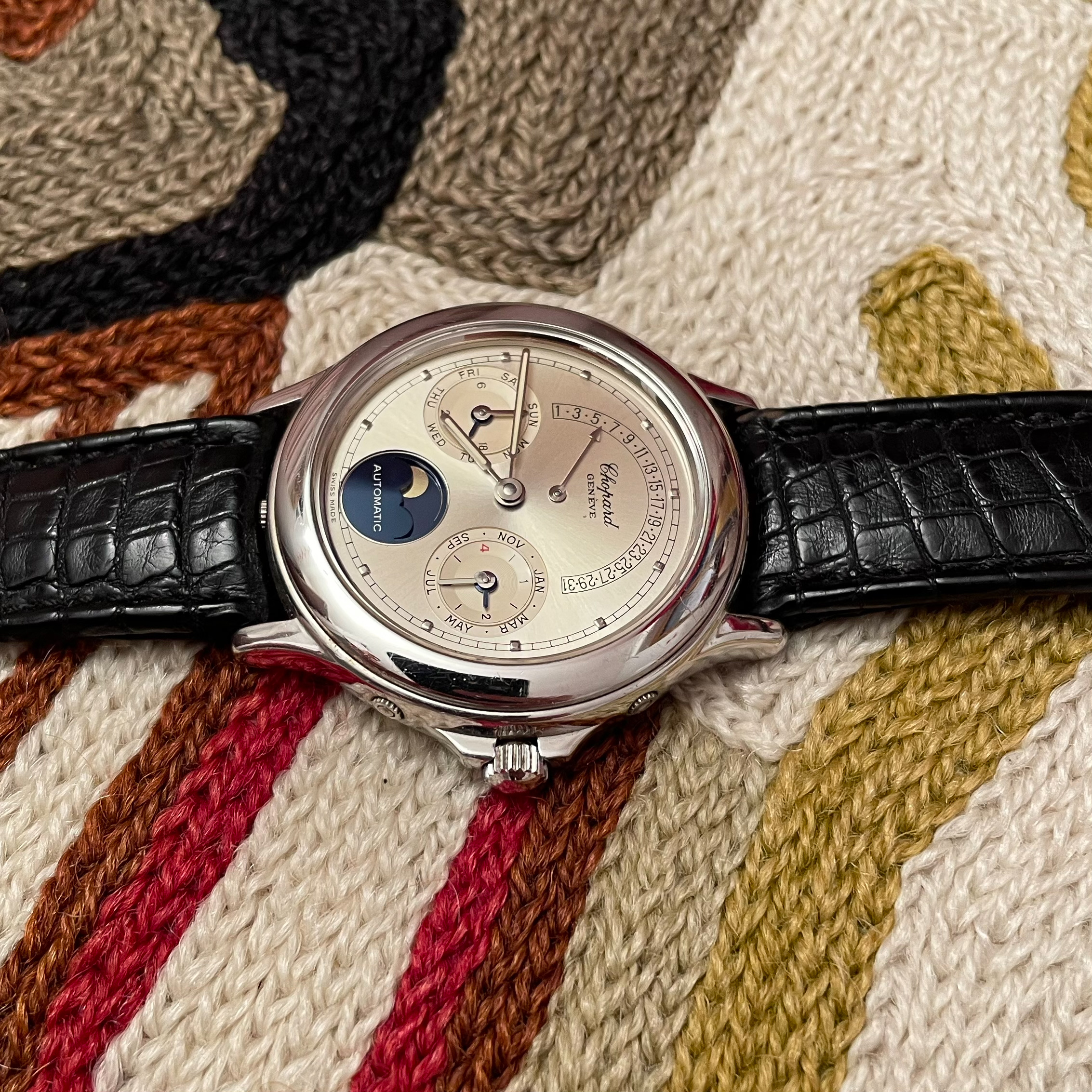 This Svend Andersen Chopard perpetual calendar with retrograde date from the 1990’s is an absolute neo vintage rarity. Limited to just 100 pieces, this platinum execution was the absolute top of Chopard’s offerings in the 1990’s. Its 36mm case is extremely heavy and has a pleasant rounded shape to it. This particular example is unpolished and has not seen much wear over its lifetime. There is some small imperfections, but overall the watch comes in collector condition. What makes this watch unique is that it combines the perpetual calendar complication with a retrograde date. Which is then housed in an almost sporty looking case. This sporty look is further enhanced by the lume filled hands. Also, it has a screw down crown and case back and the watch was waterproof when it was first sold. It is rather impressive to have a platinum perpetual calendar that can withstand water. Normally they would not travel outside ceo offices and cocktail parties. The design of the movement is by legendary watchmaker Svend Andersen and has his DNA all over it. You can read more on detail about the watch design and history here. If you compare this to his Andersen’s work, his influence is undeniable. This particular example comes on its original alligator strap with platinum buckle. The strap is missing on most examples that have been on the market, but it is interesting to see that its design matches that of the case which elevates the overall look. The quality of the dial is incredible with a sunburst finish and incredible depth to the sub dials. The feel of the platinum on it is just amazing. If you would like to know more about this Svend Andersen Chopard, please send us a message. This is an incredible value proposition in today’s market. Given the limited production and the involvement of a highly praised watchmaker such as Svend Andersen.