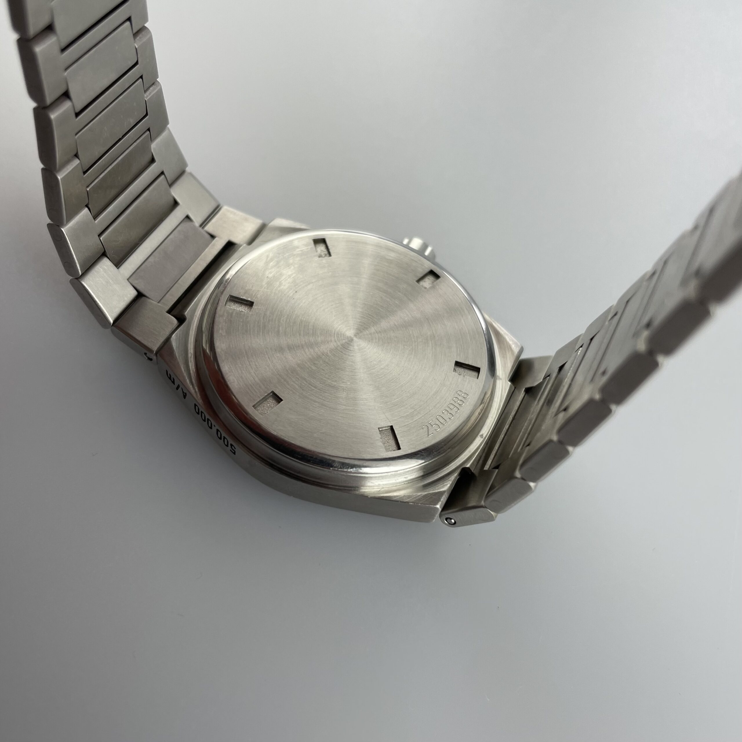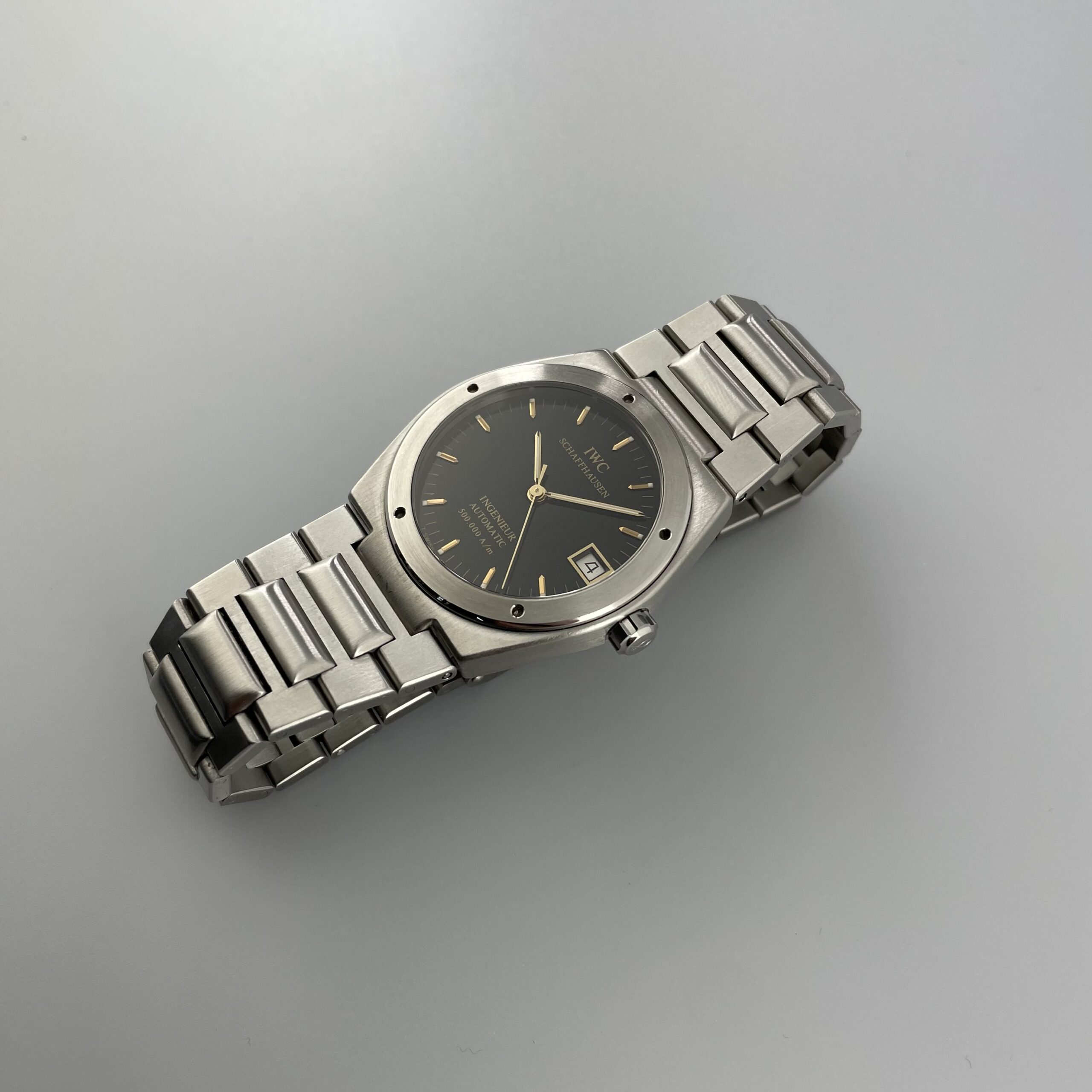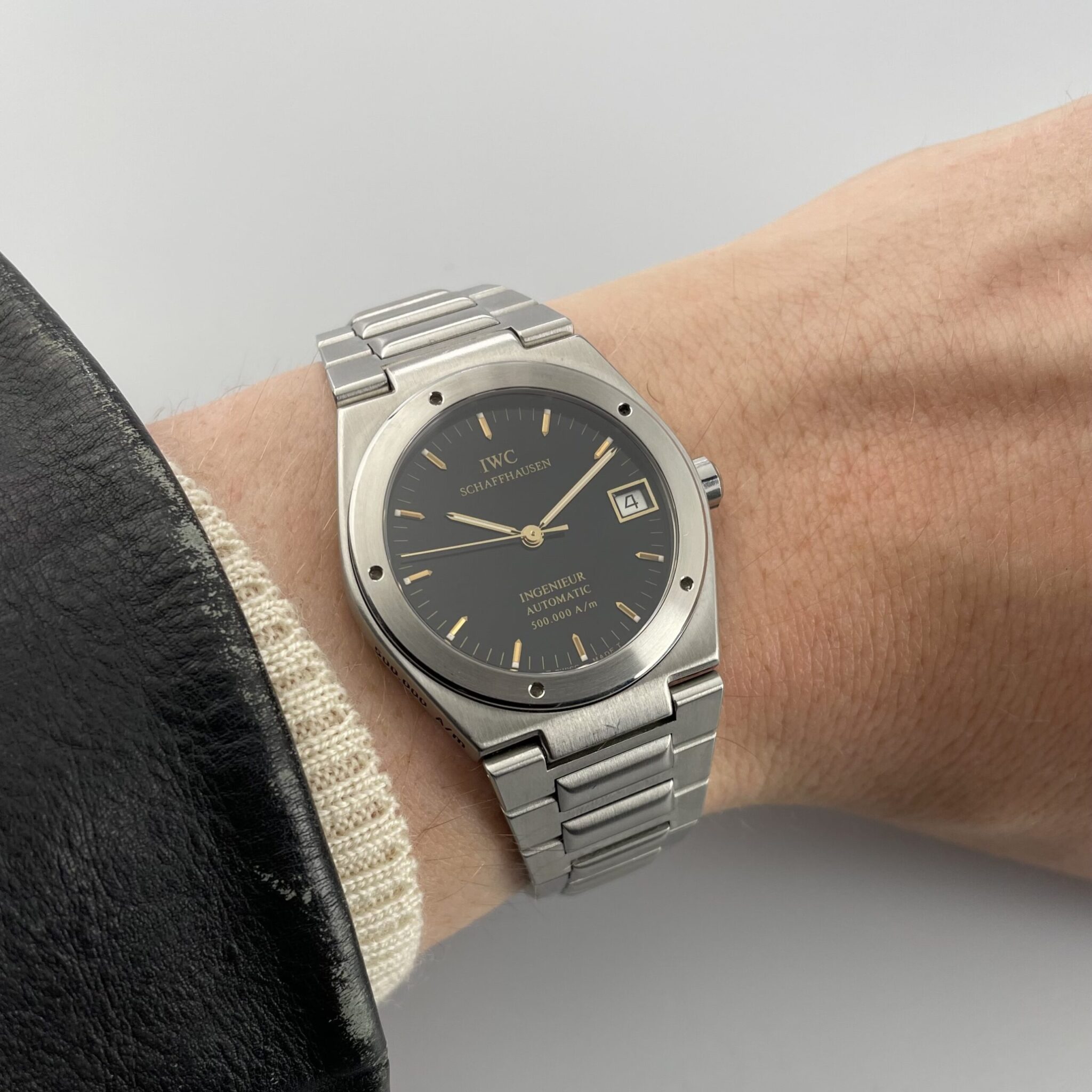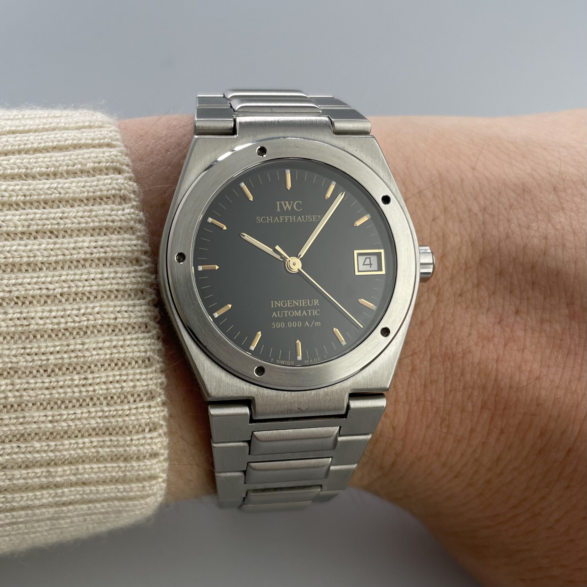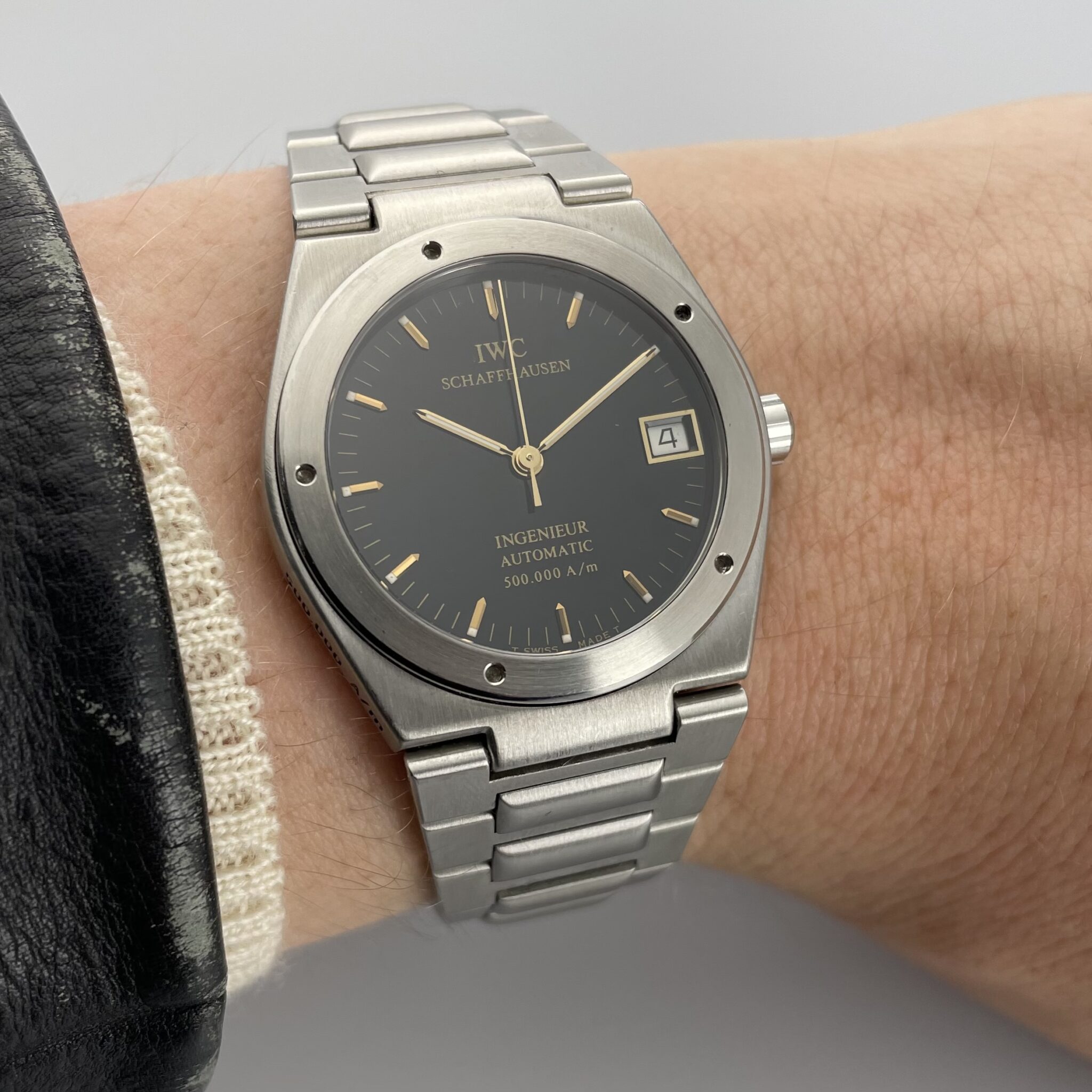 This is one of the most elegant tool watches available in the market. A beautiful 34mm brushed case based on the original Gerald Genta design from the 1970’s. With a deep black lacquer dial. But do not be deceived by its looks. This is a very heavy duty watch, that can withstand magnetic fields of 500,000 A/m. This was the original intention for the Ingenieur line back in the 1960’s, but IWC has taken it to the extreme in this watch. This particular example comes in exceptional condition. It has never been polished, has no stretch on the bracelet at all and comes with extra links and the original box and outer box, which is rarely seen. The ref. 3508 is one of the most sturdy everyday watches you can buy. If you would like to know more about the watch, please send us a message.