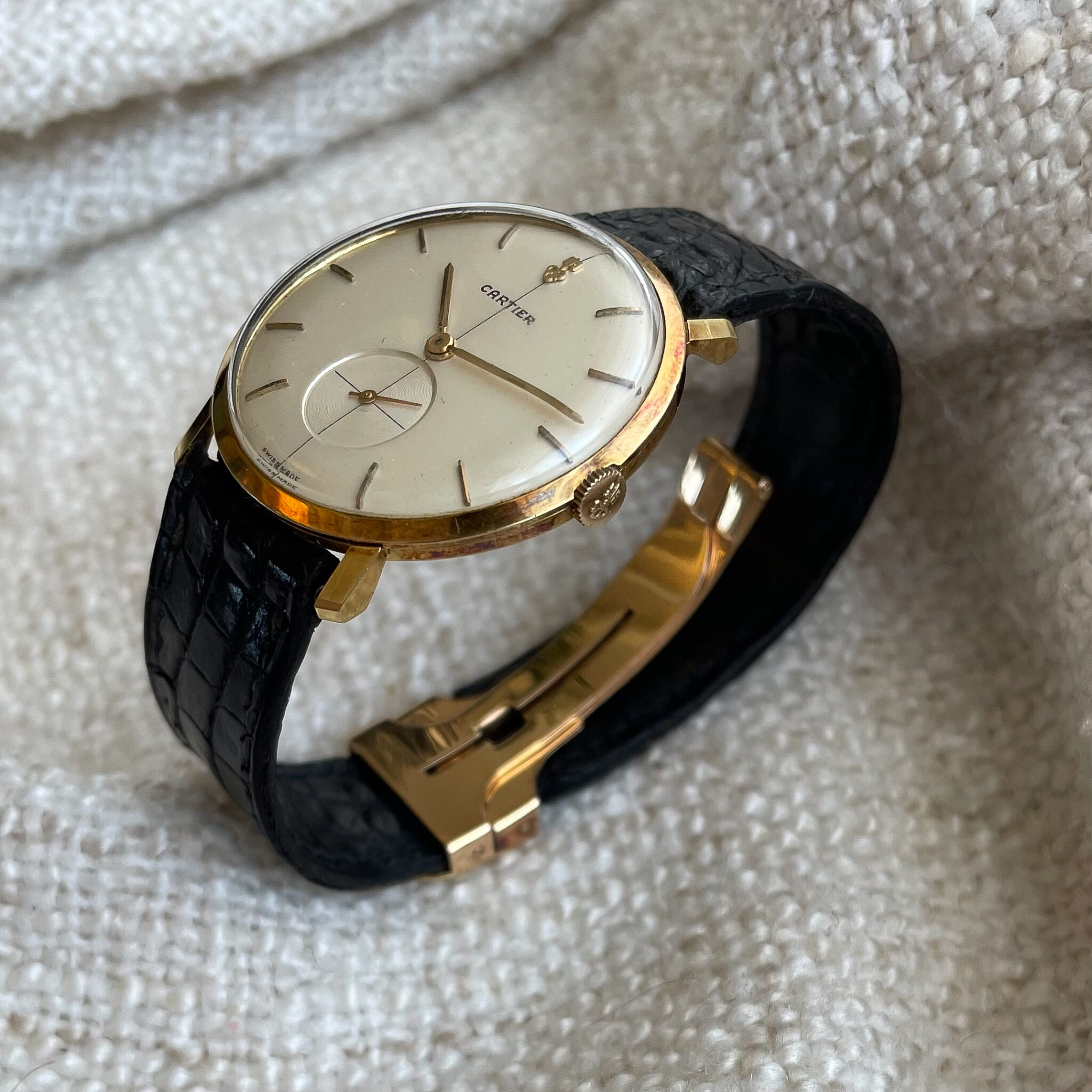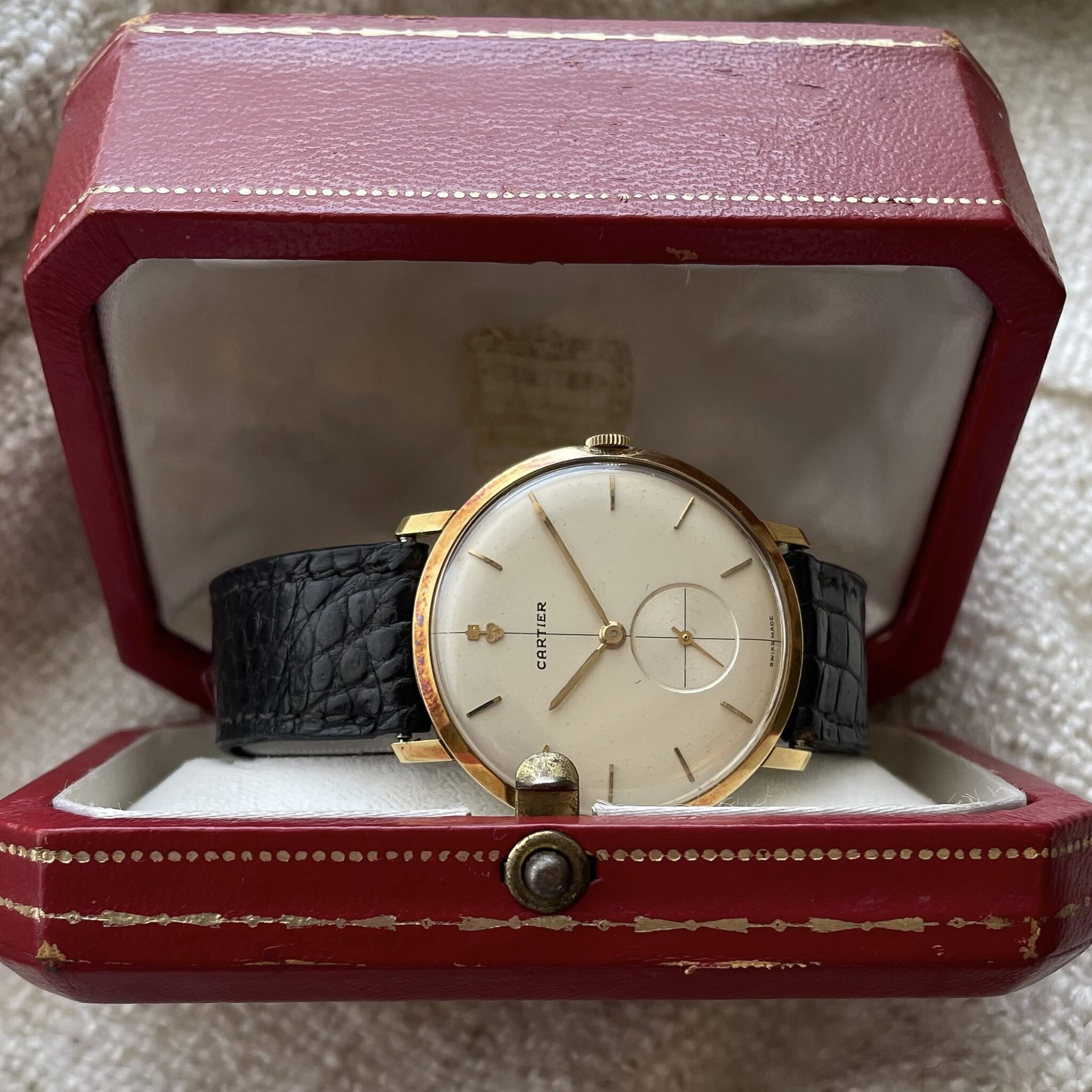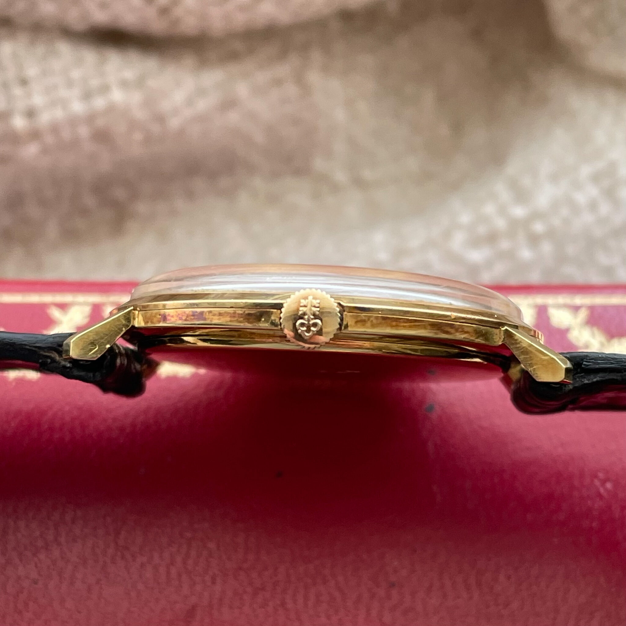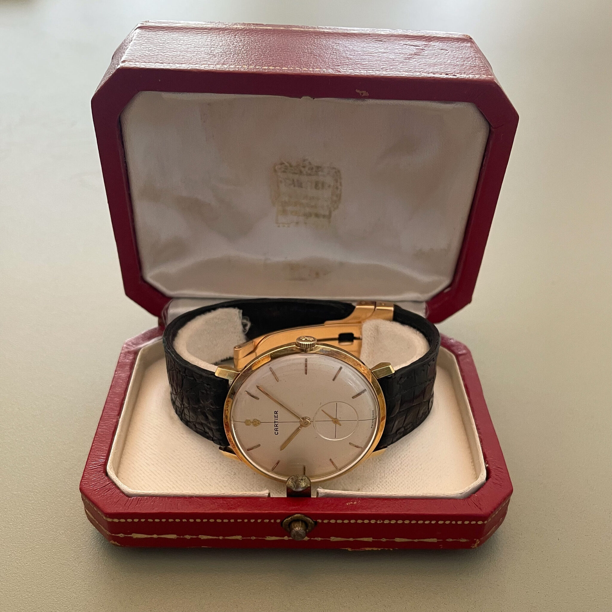 This is a super rare full set that was sold by Cartier in the 1960’s. The watch was made by Corum for Cartier Paris. It is housed in an ultra thin 35mm 18 carat yellow gold case, which comes in super sharp and unpolished condition. The dial has lightly spotted, but has aged nice and evenly, giving the watch some extra charm. At 12 o’clock we find the interesting applied Corum key logo, with the Cartier brand name added below. Of course the case bears all the Cartier inventory numbers as well as the gold hallmarks. The manual wound caliber comes in a nice condition. The watch comes on an iconic and original Cartier deployant clasp with french eagle hallmark and period correct numbers. If you would like to read more about french hallmarks, go here.The gold screws are unmolested. The watch is currently on its original crocodile strap which has dried out, but showcases the original condition of the watch. A new strap will be made to measure for the next caretaker and is included in the sale. Last but not least there is the original and rare 1960’s original Cartier box. This is a rare opportunity to own a full set Corum Cartier from the 1960’s.