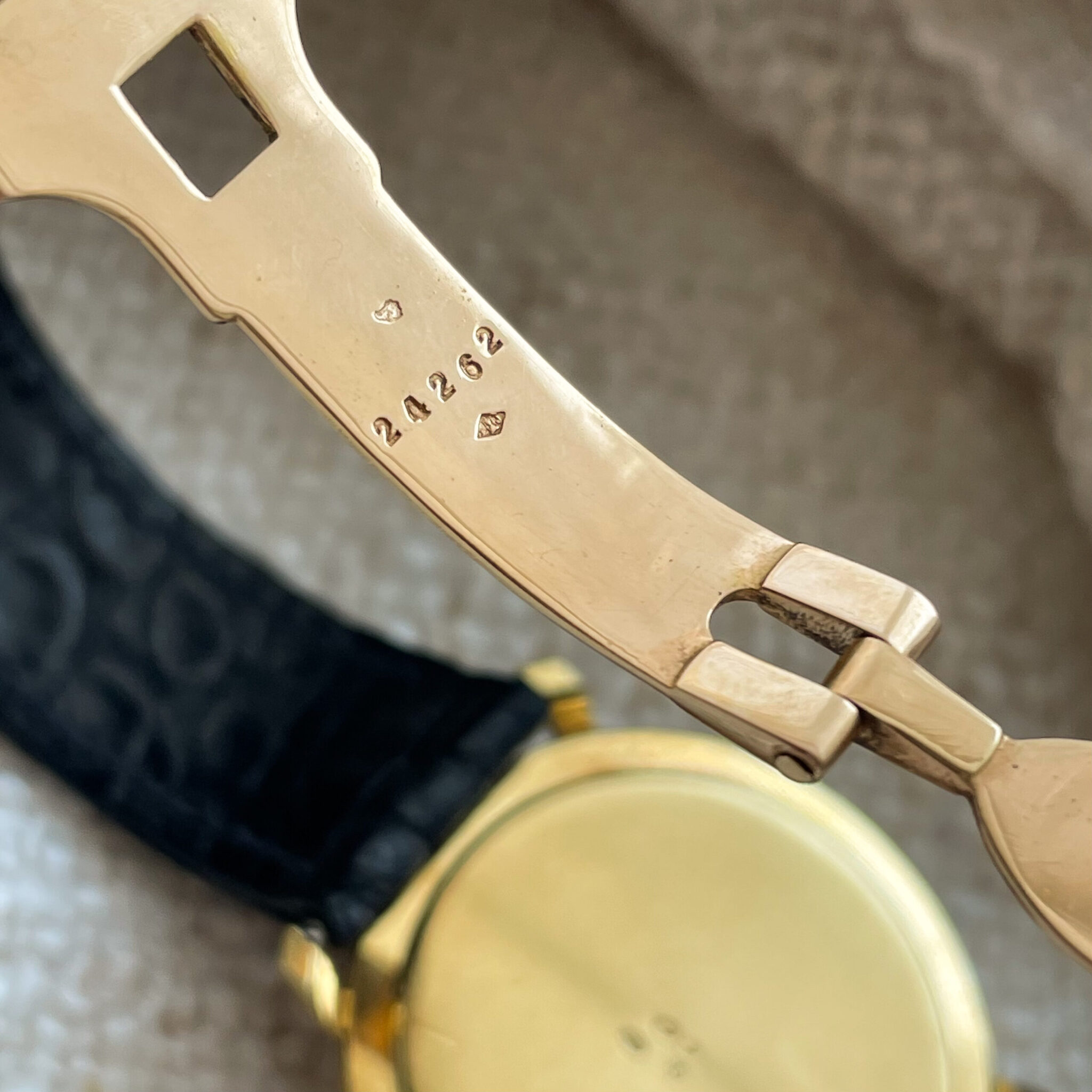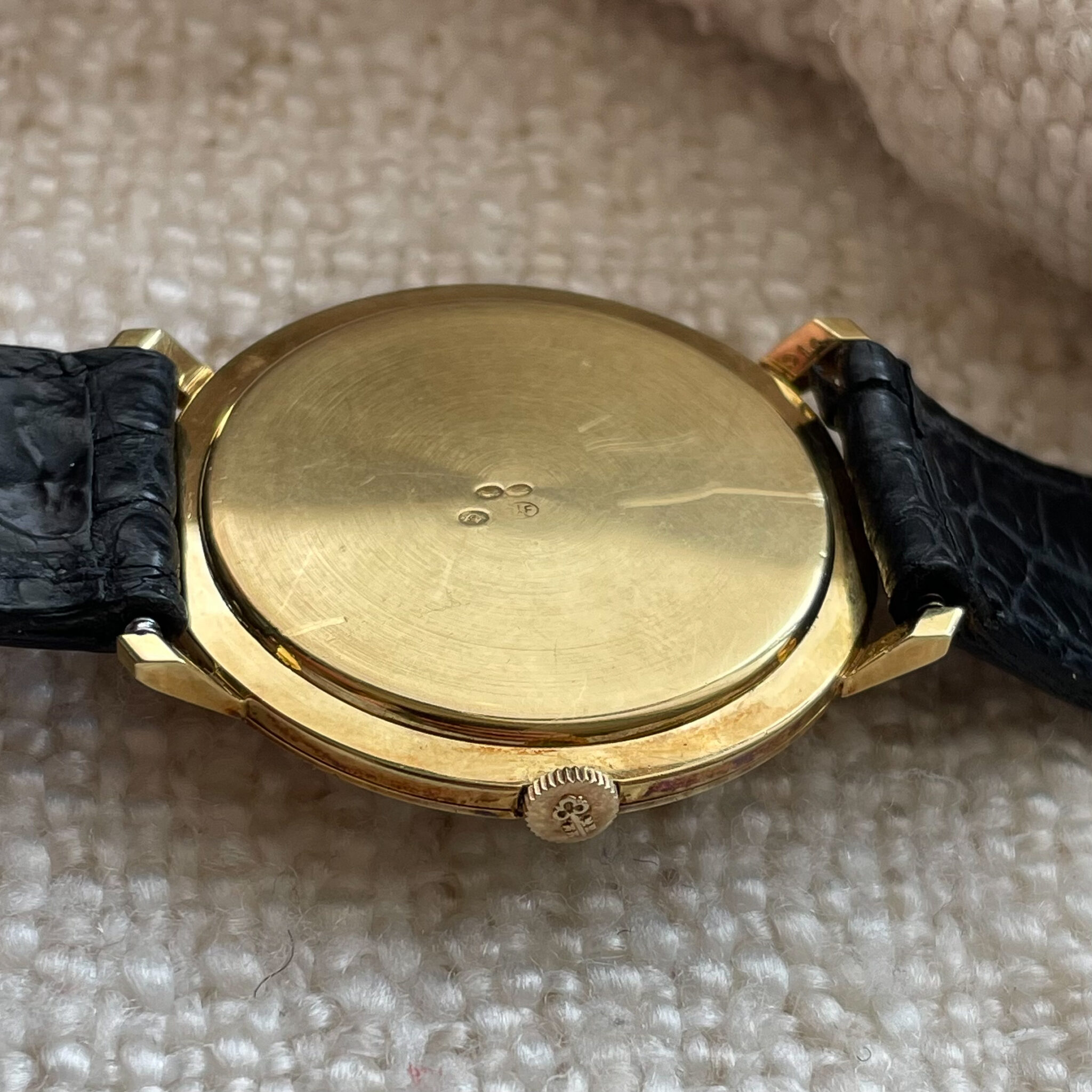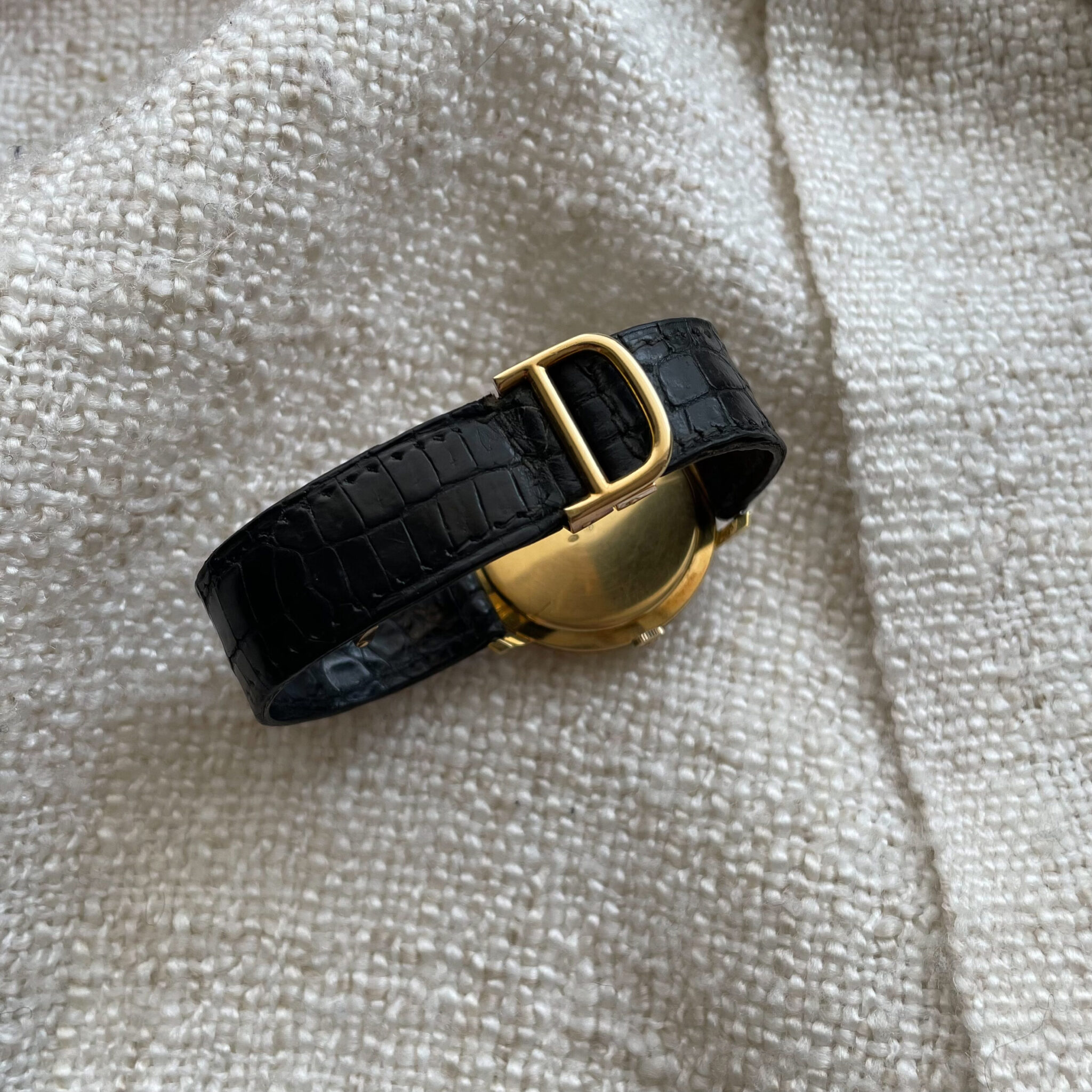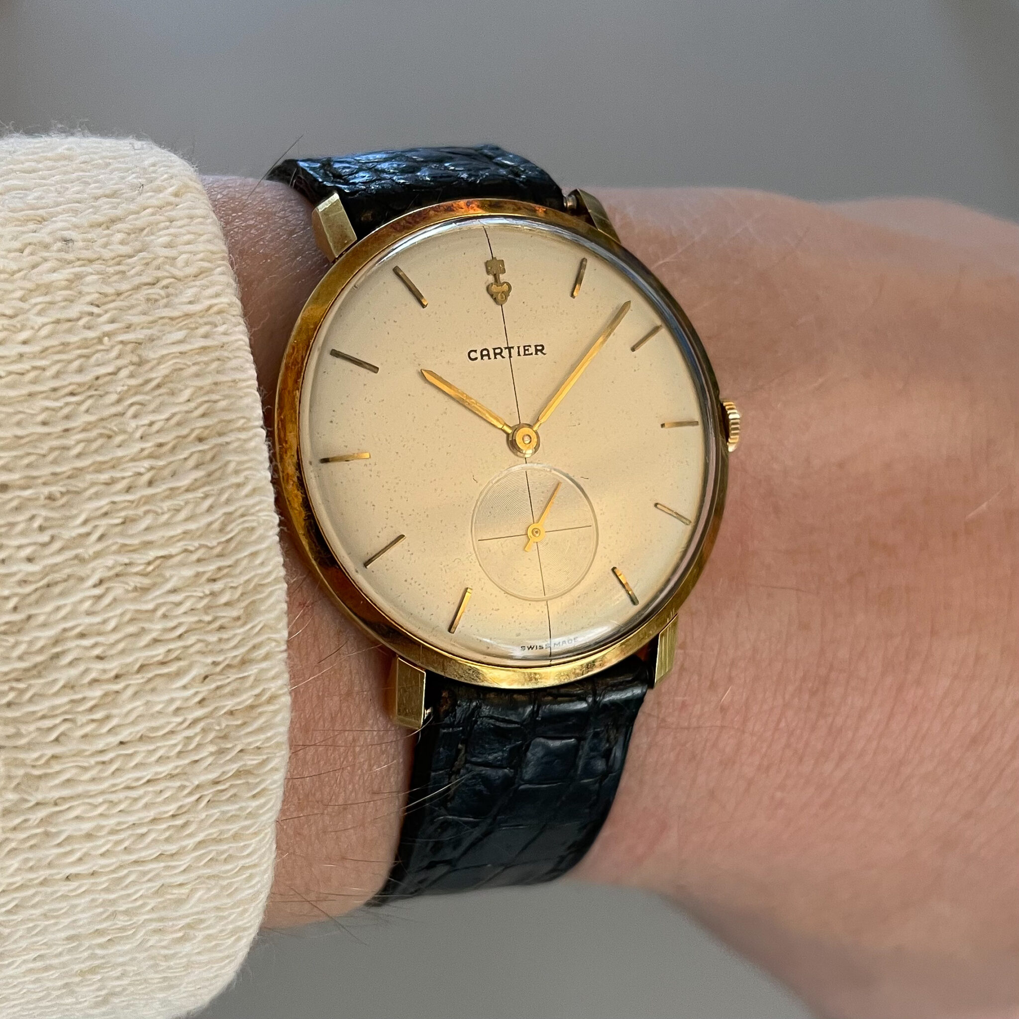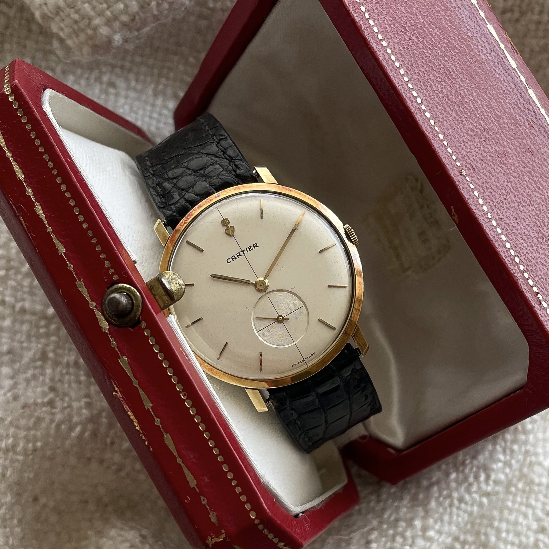 This is a super rare full set that was sold by Cartier in the 1960’s. The watch was made by Corum for Cartier Paris. It is housed in an ultra thin 35mm 18 carat yellow gold case, which comes in super sharp and unpolished condition. The dial has lightly spotted, but has aged nice and evenly, giving the watch some extra charm. At 12 o’clock we find the interesting applied Corum key logo, with the Cartier brand name added below. Of course the case bears all the Cartier inventory numbers as well as the gold hallmarks. The manual wound caliber comes in a nice condition. The watch comes on an iconic and original Cartier deployant clasp with french eagle hallmark and period correct numbers. If you would like to read more about french hallmarks, go here.The gold screws are unmolested. The watch is currently on its original crocodile strap which has dried out, but showcases the original condition of the watch. A new strap will be made to measure for the next caretaker and is included in the sale. Last but not least there is the original and rare 1960’s original Cartier box. This is a rare opportunity to own a full set Corum Cartier from the 1960’s.