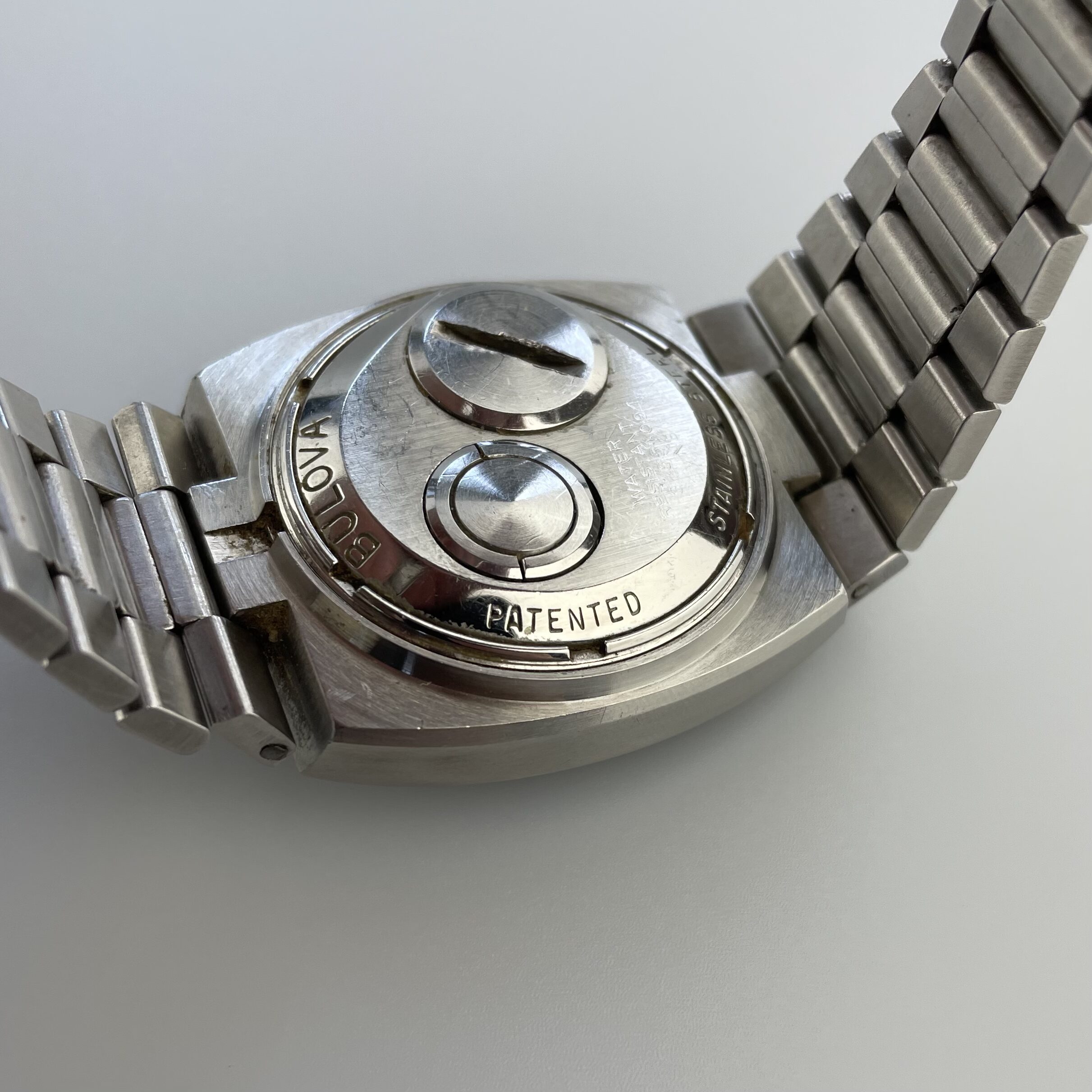 The iconic vintage Bulova Accutron space view. This new tuning fork technology caused a revolution in watchmaking when it was launched by Bulova. The watch designs match this revolution. No dial to put full focus on the mechanics underneath. The brand name and model directly printed on the plexiglass. A nice sunburst steel case in top condition without a crown on the side of the case. There was no need to wind your watch on a daily basis anymore and Bulova wanted to make that clear at a glance. These watches have a rich history and are real space age icons. This one comes in superb condition. If you have any questions about the watch, please feel free to contact us.