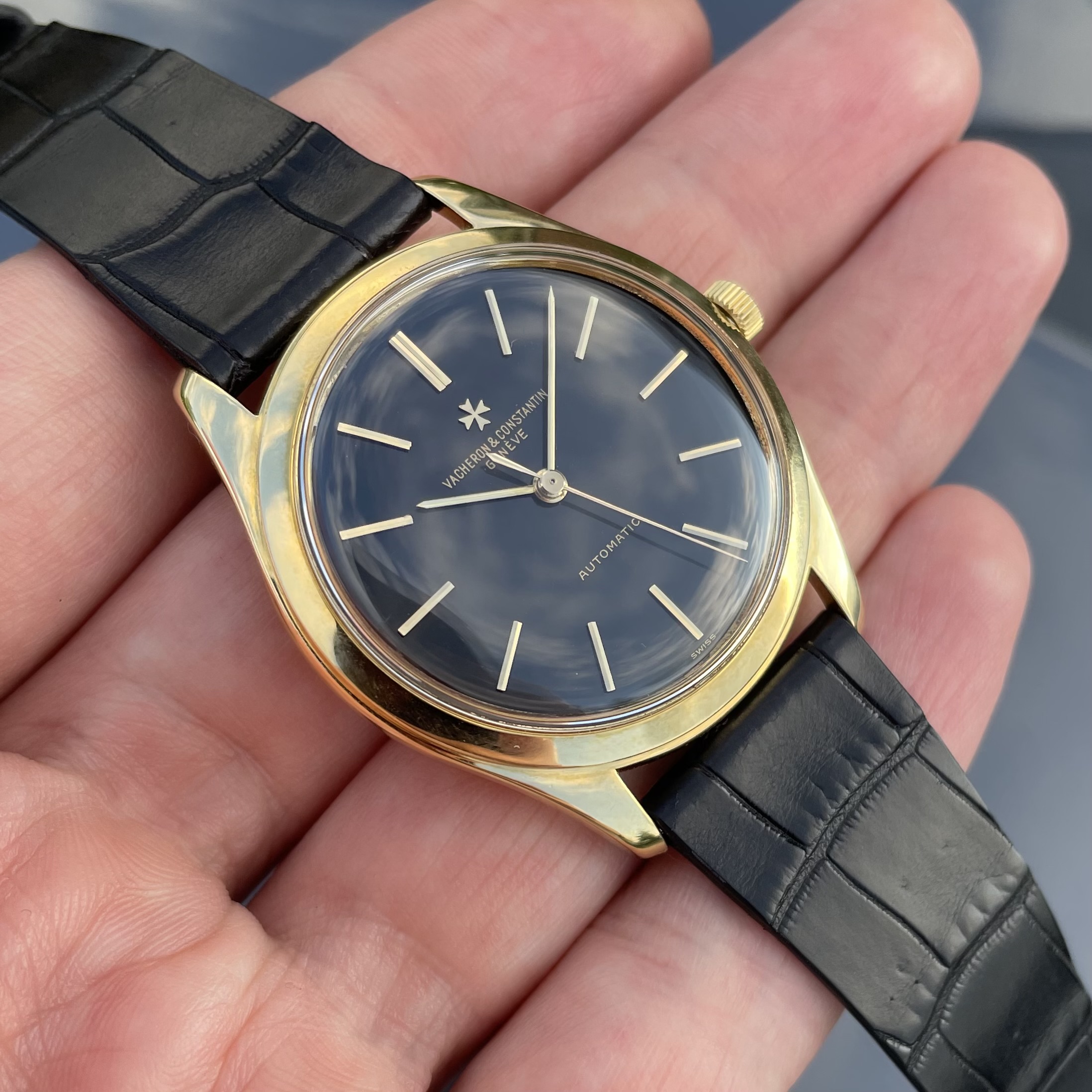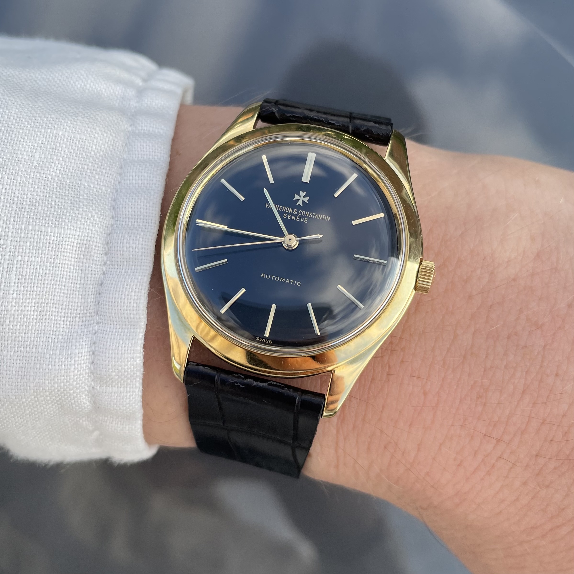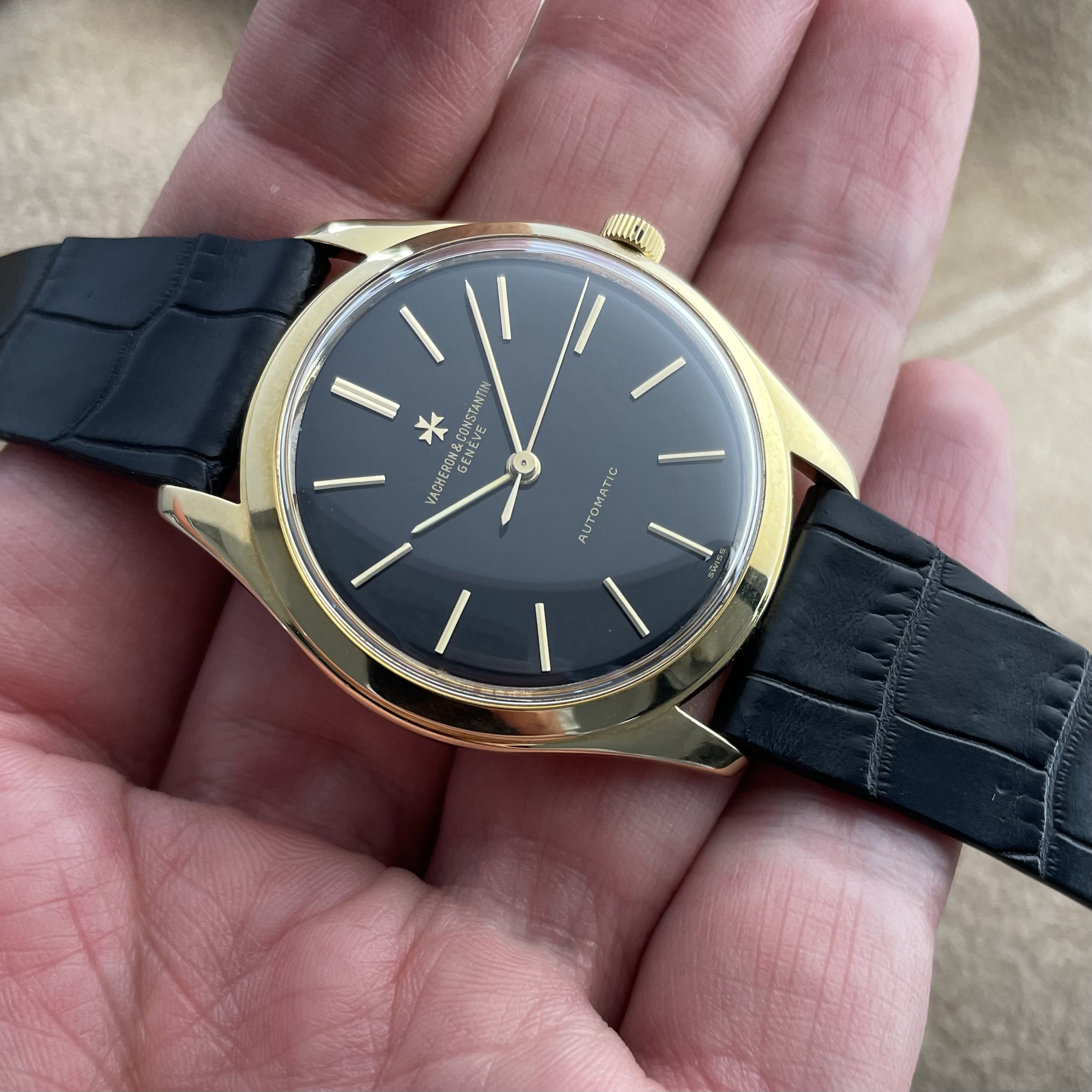 The watch has just had a full service, so it is ready for years to come. The watch is delivered on a black alligator strap. If sold outside the EU, another strap option will be discussed. If you would like to know more about this vintage Vacheron Constantin with black dial, feel free to contact me. Ah, and have a look here, to understand why these watches are a great value proposition.
